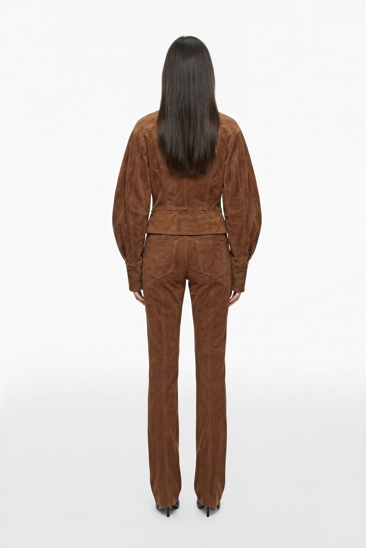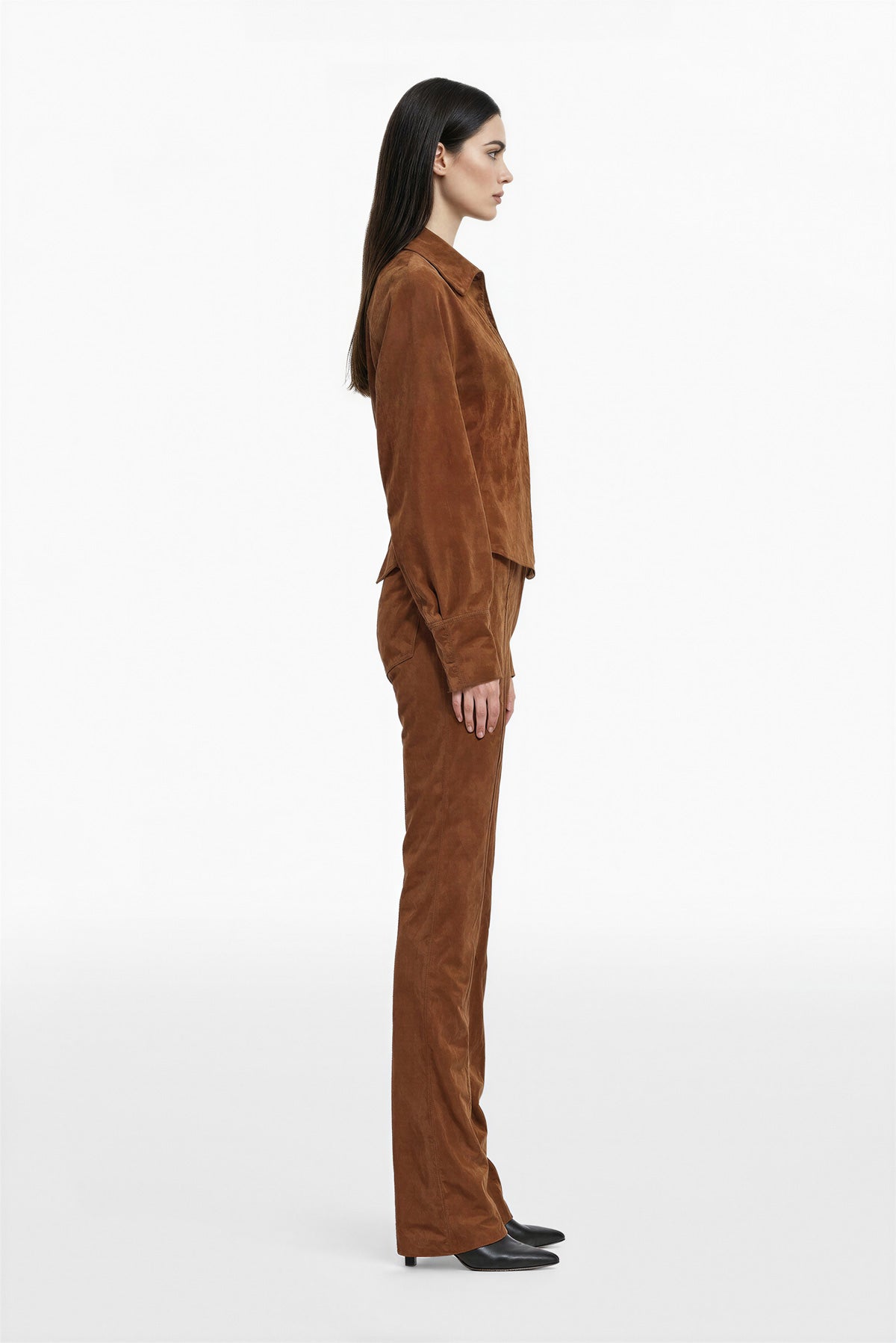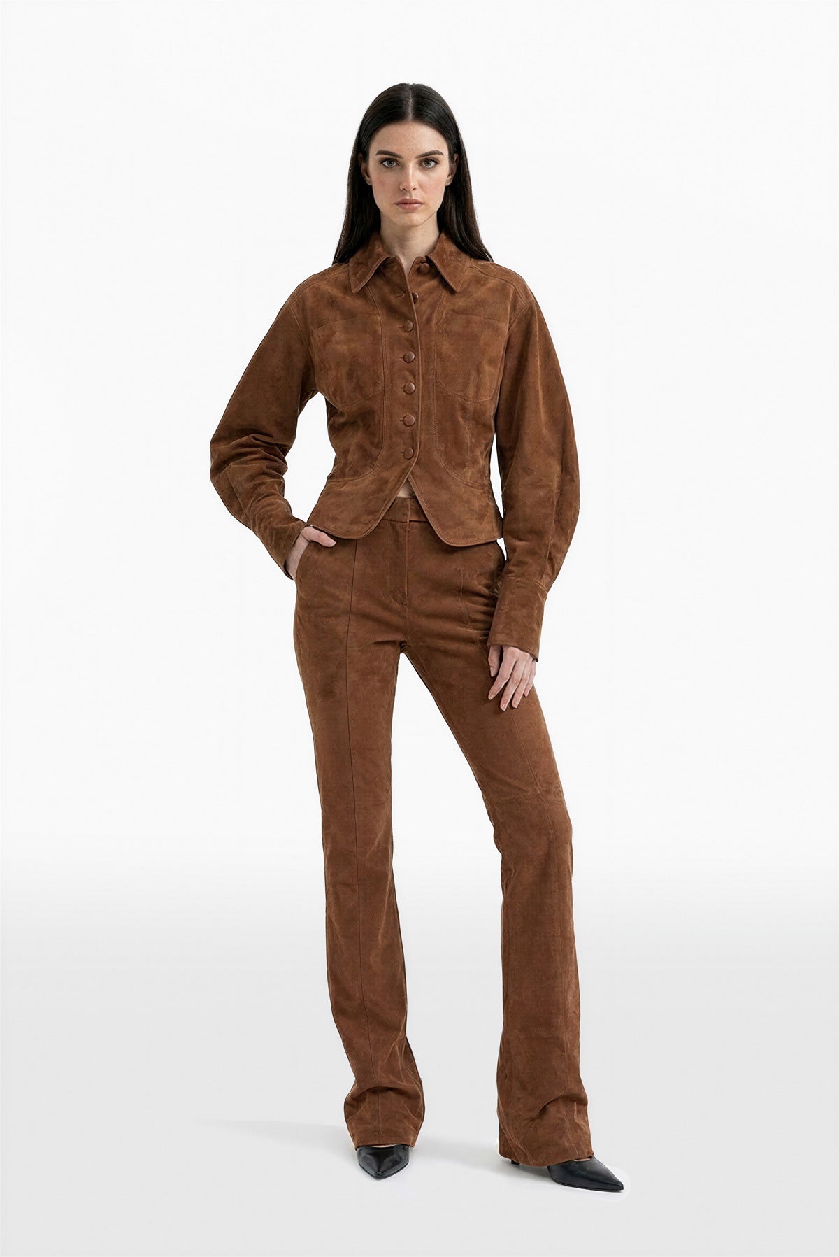 جاكيت من جلد الغزال باللون البني سيكويا مع حافة منحنية وأزرار في الأمام وأكمام منفوشة ناعمة مع بنطال من جلد الغزال بقصة مستقيمة متناسقة