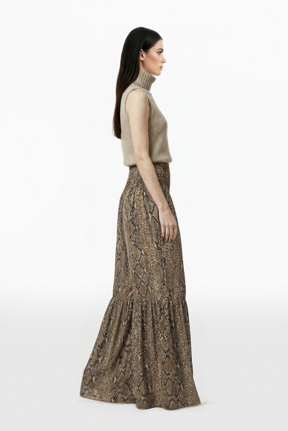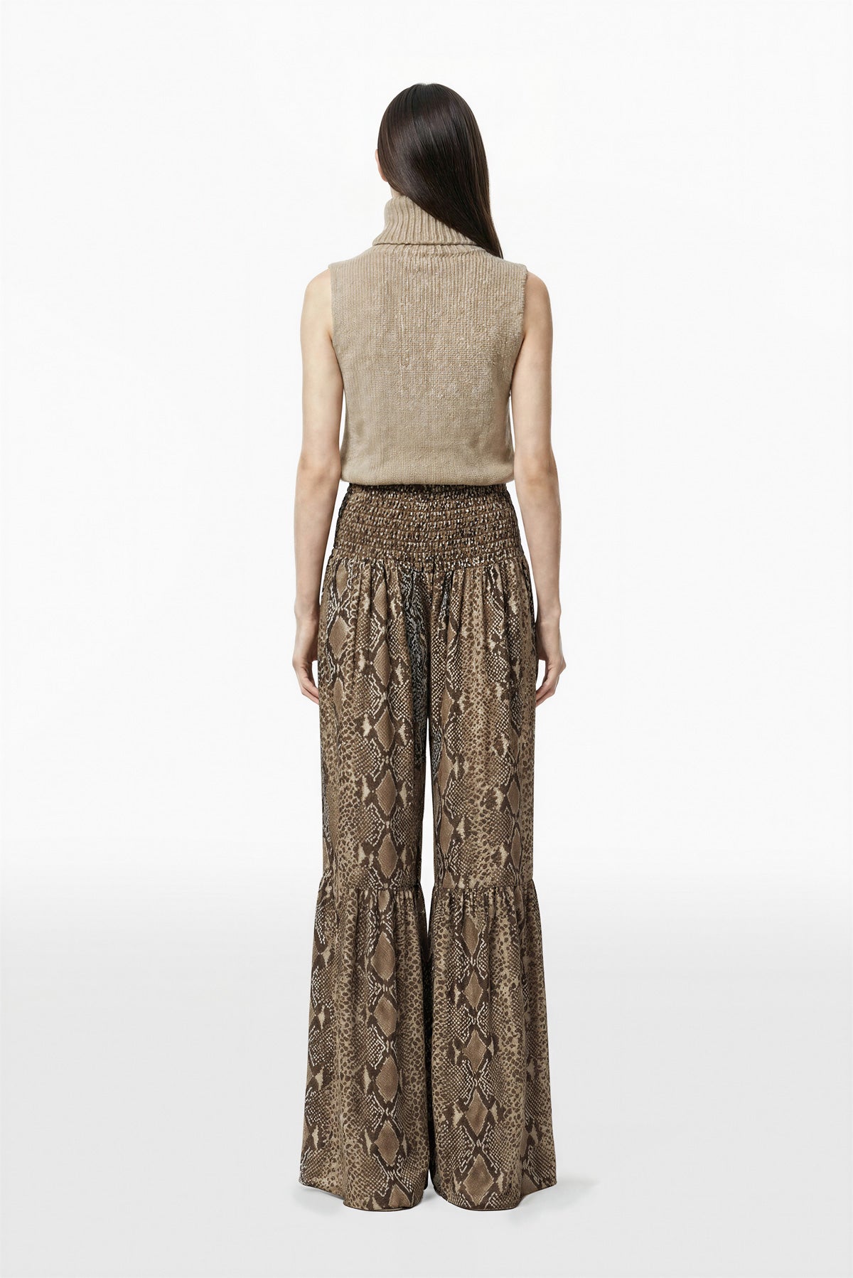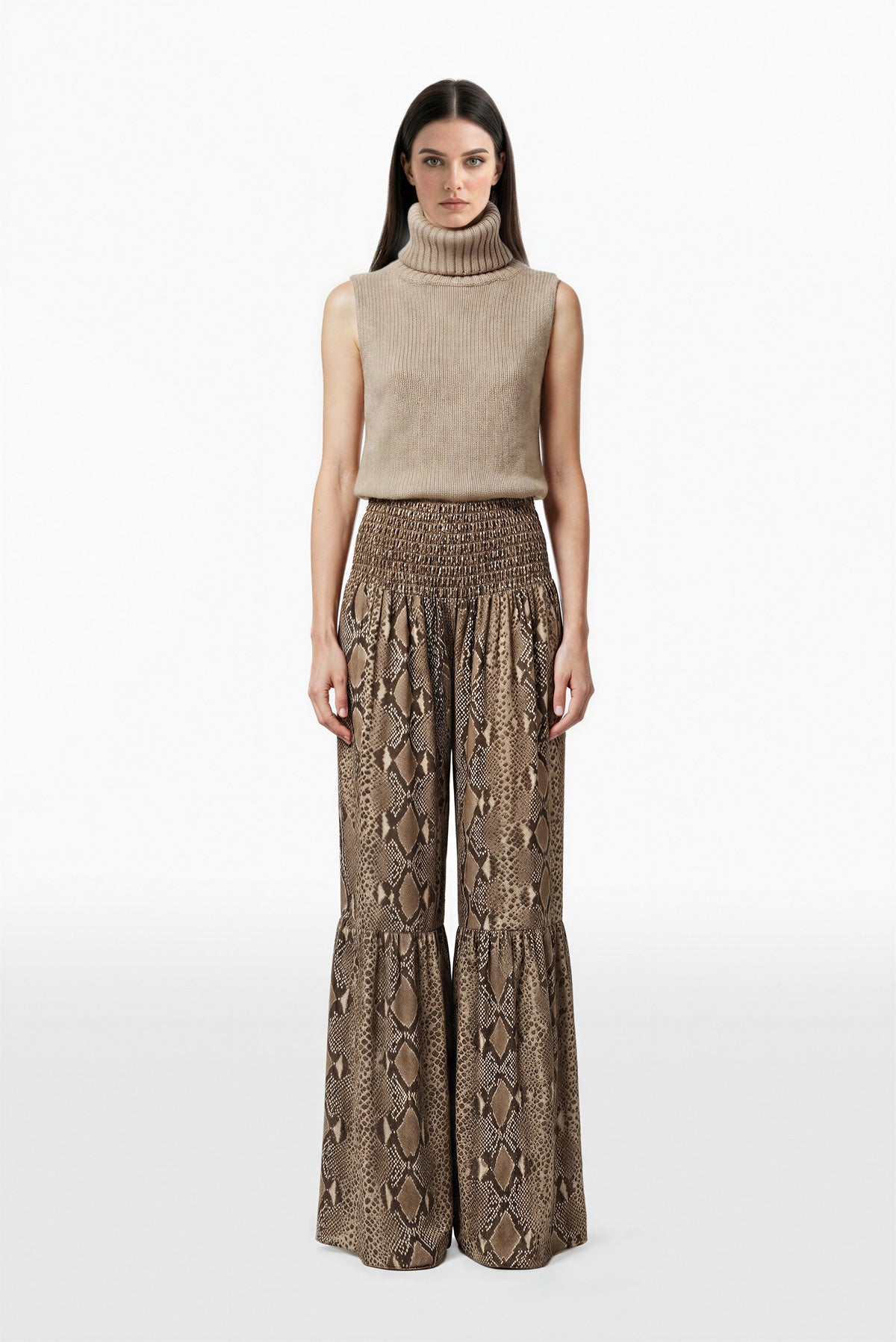 بلوزة بلا أكمام من الصوف بلون الرمال المبيضة مع ياقة عالية مطوية وقصة مستقيمة مريحة. فتحات أذرع أنيقة وتشطيب بسيط مع بنطال بخصر عالٍ من الجورجيت المطبوع بنقشة جلد الثعبان بلون سيكويا، ملائم عند الوركين مع قصة واسعة عند الساقين وحزام خصر مطوي وألواح كشكش عند الحافة.