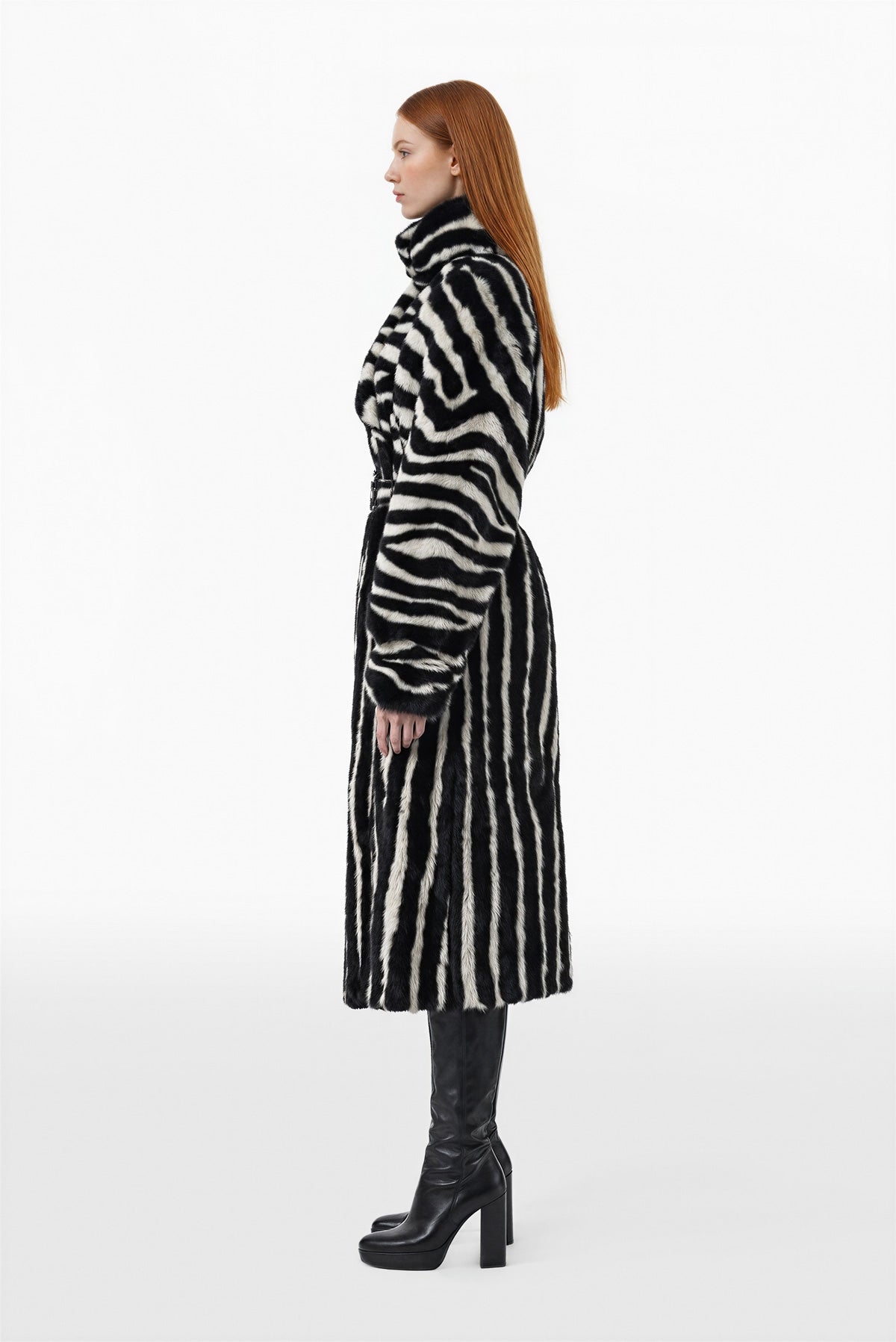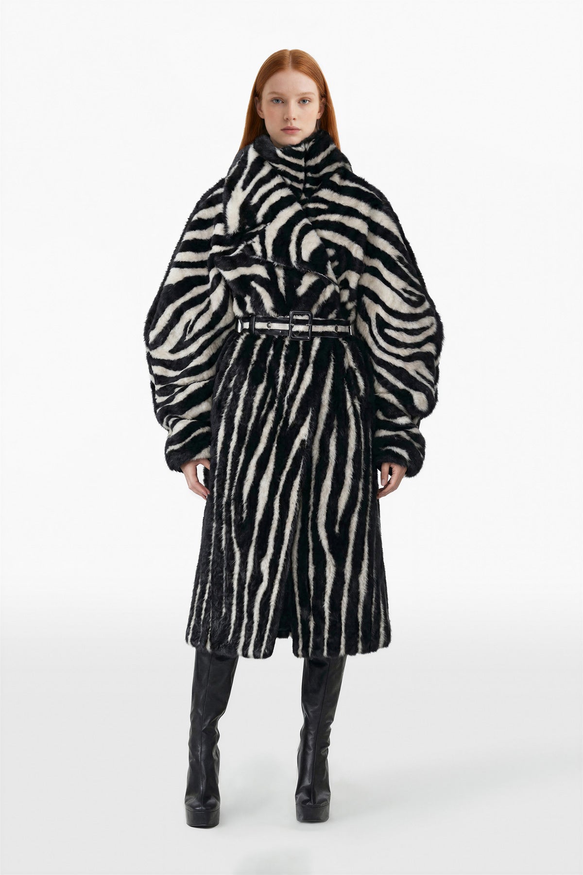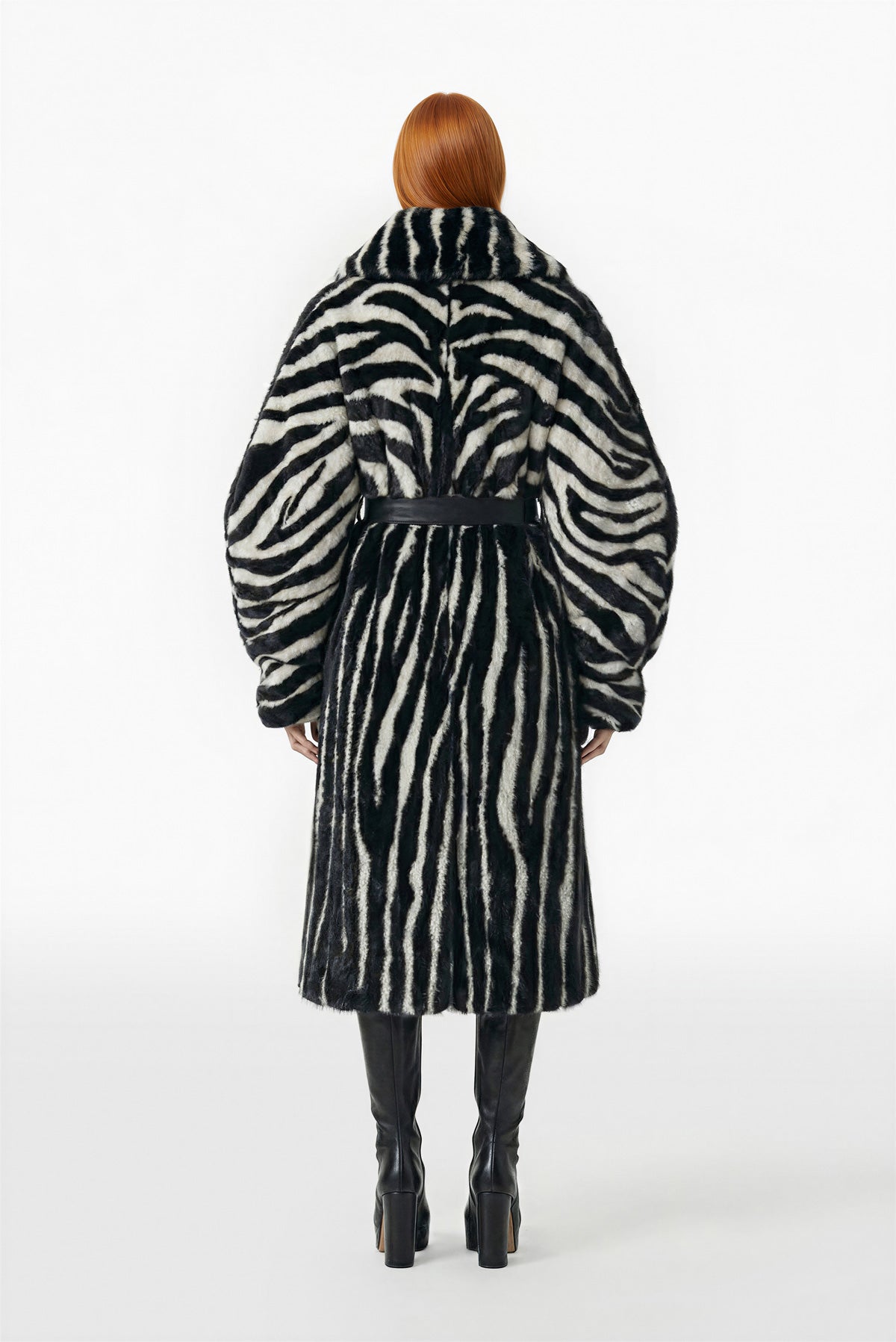 معطف بطول منتصف الساق من الصوف والفرو باللون الأسود الفاحم والأبيض المائل للصفرة مع نقشة زرافة على كامل المعطف. يضفي الياقة العالية والمنتفخة والأكمام المستديرة الواسعة مظهراً جريئاً.