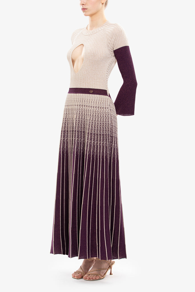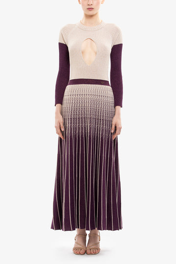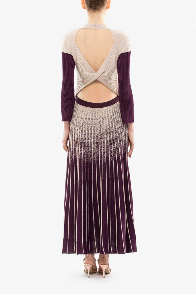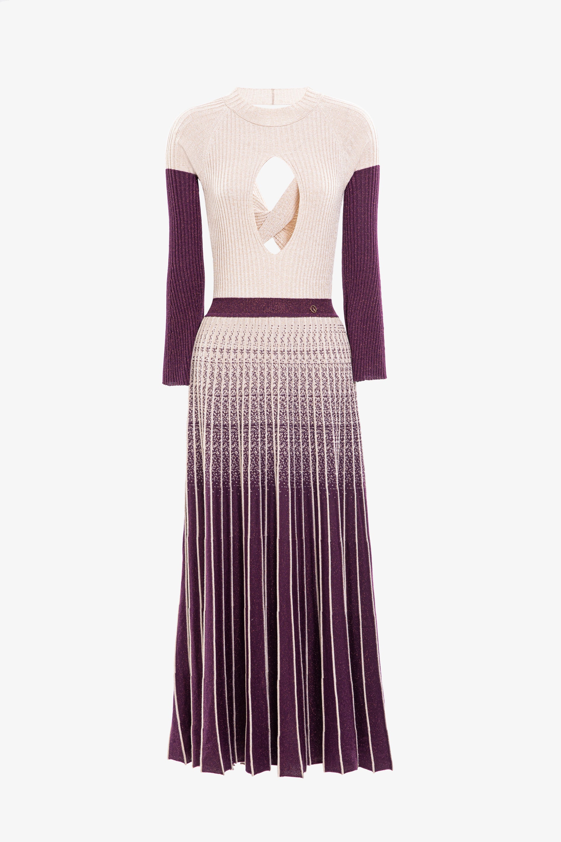 فستان محبوك باللونين الأبيض الفاتح والبرقوقي الإيطالي مع تأثير التدهور المذهل، حيث يتحول من اللون الأبيض الفاتح إلى البرقوق الإيطالي. يتميز هذا الفستان متوسط الطول بأكمام طويلة وخصر منخفض وفتحة رقيقة عند منتصف الصدر، ويزدان بشعار SK الأنيق على الخصر.