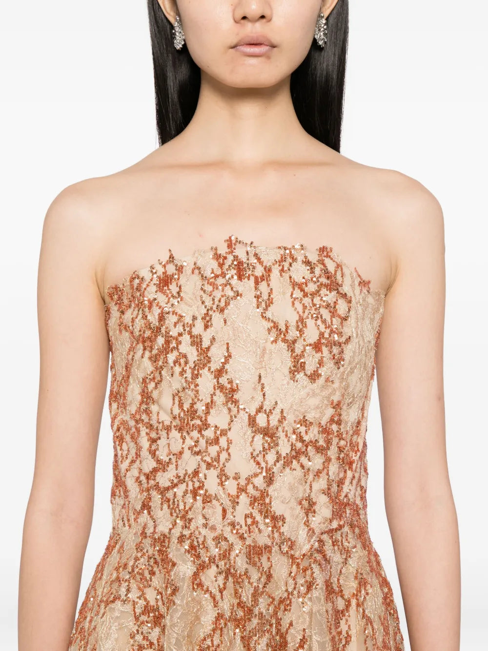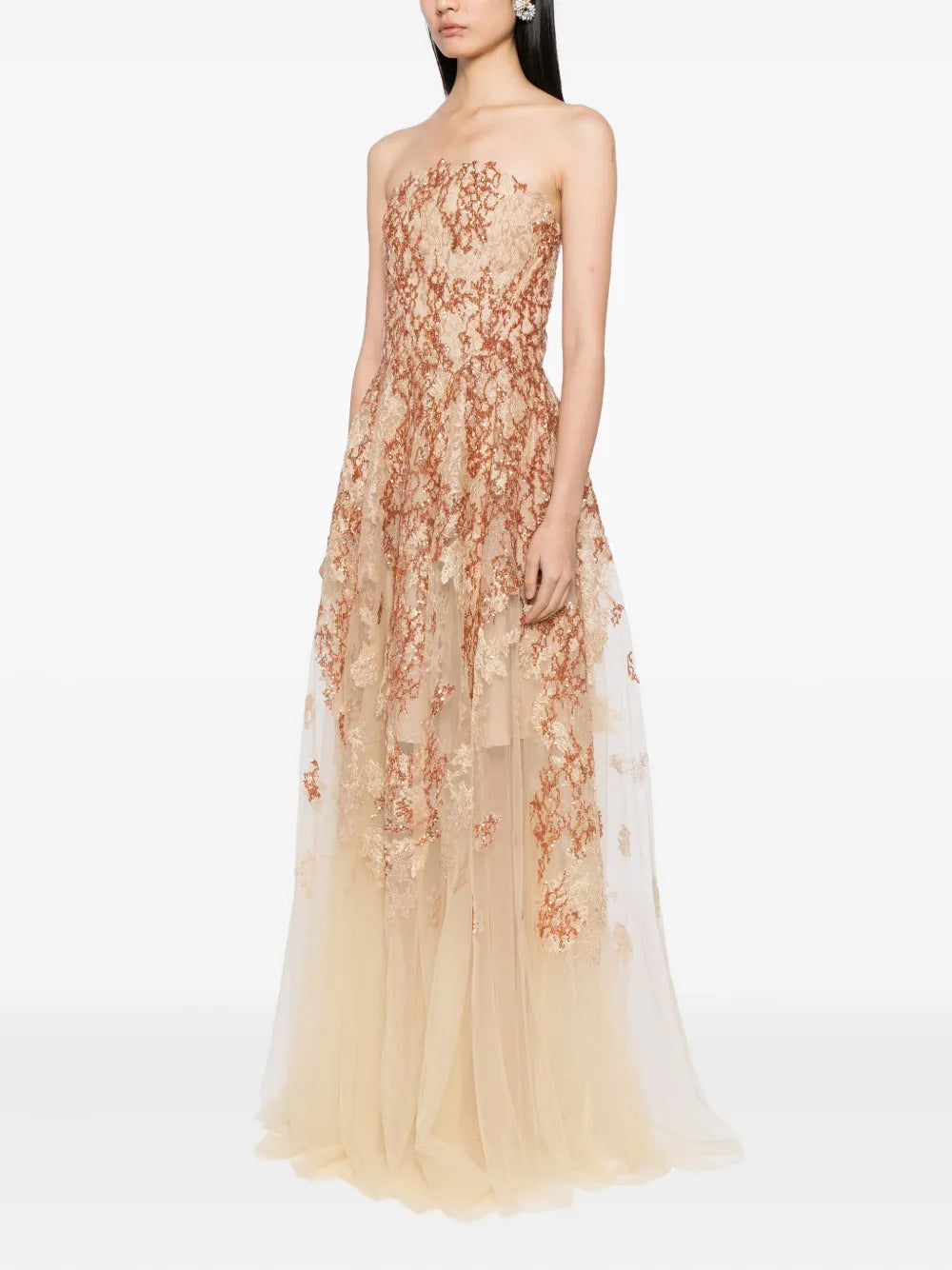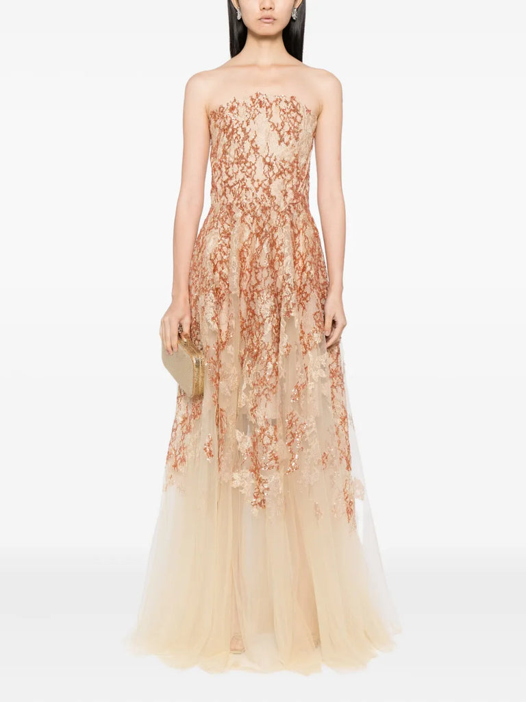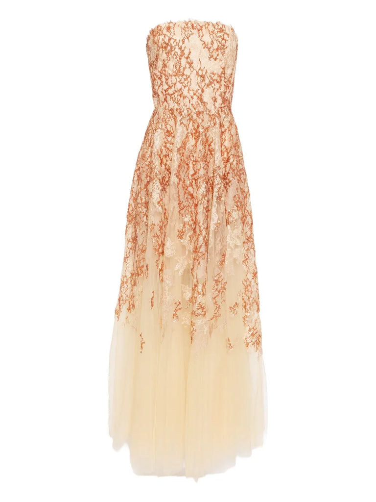 فستان بدون حمالات مطرز باللونين الأبيض والذهبي يتميز بتصميم انسيابي مطرز من التل مع تنورة بطول الأرض. يبرز التصميم بدون حمالات نقش الزهور المزخرف باللون الأوف وايت، مع تفاصيل ذهبية متلألئة