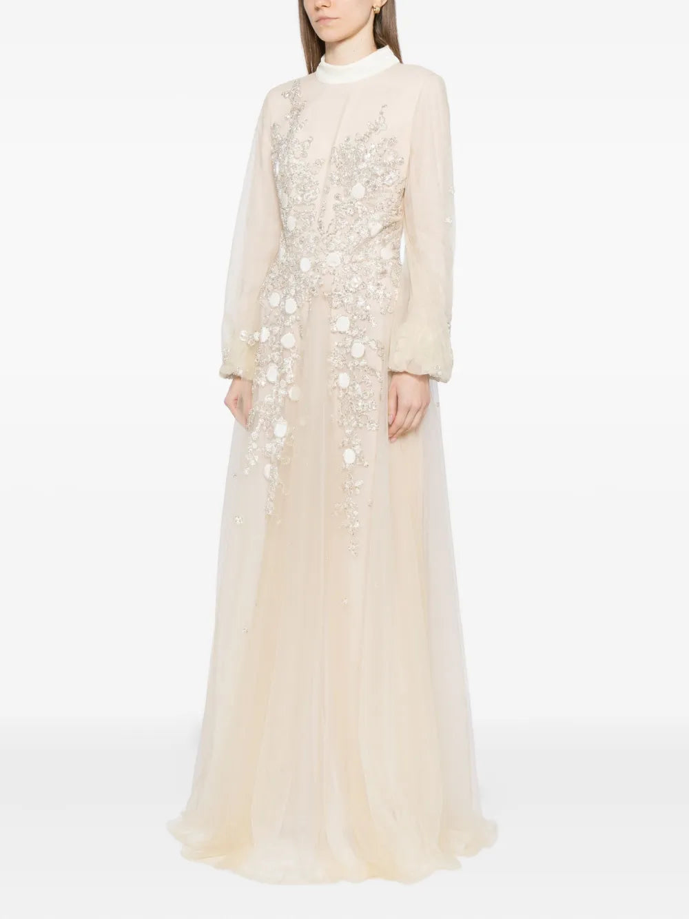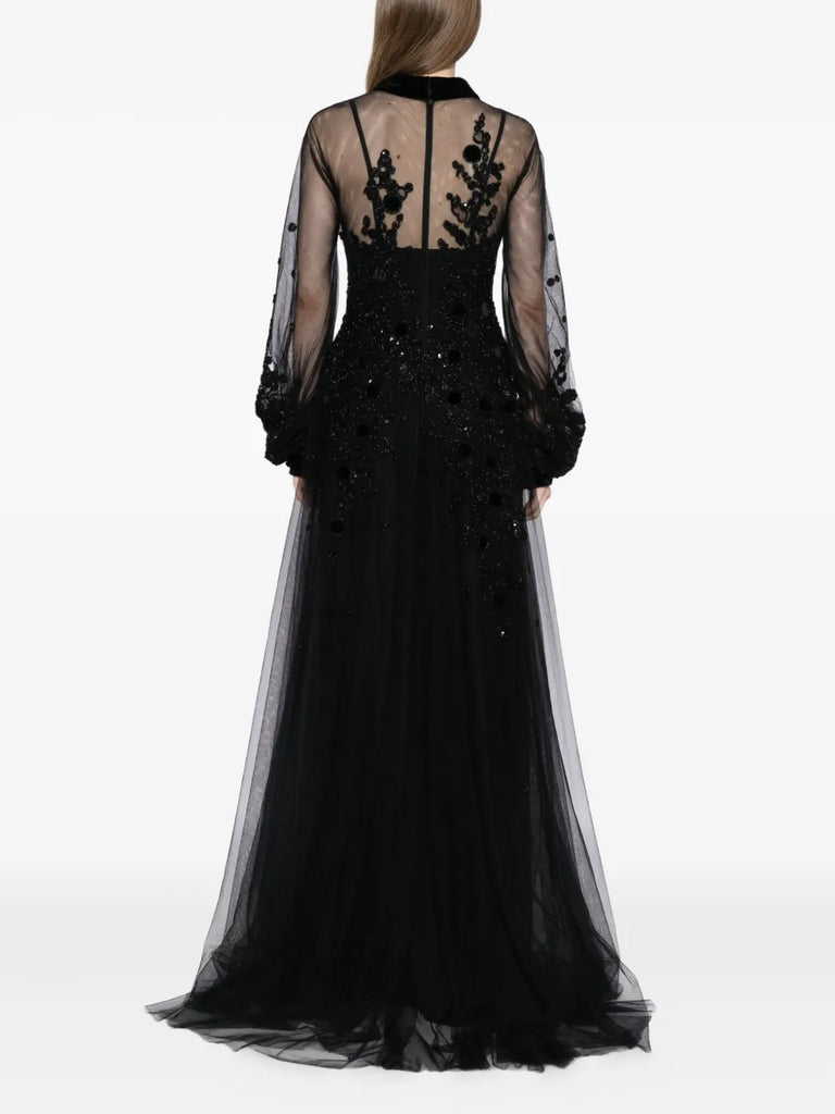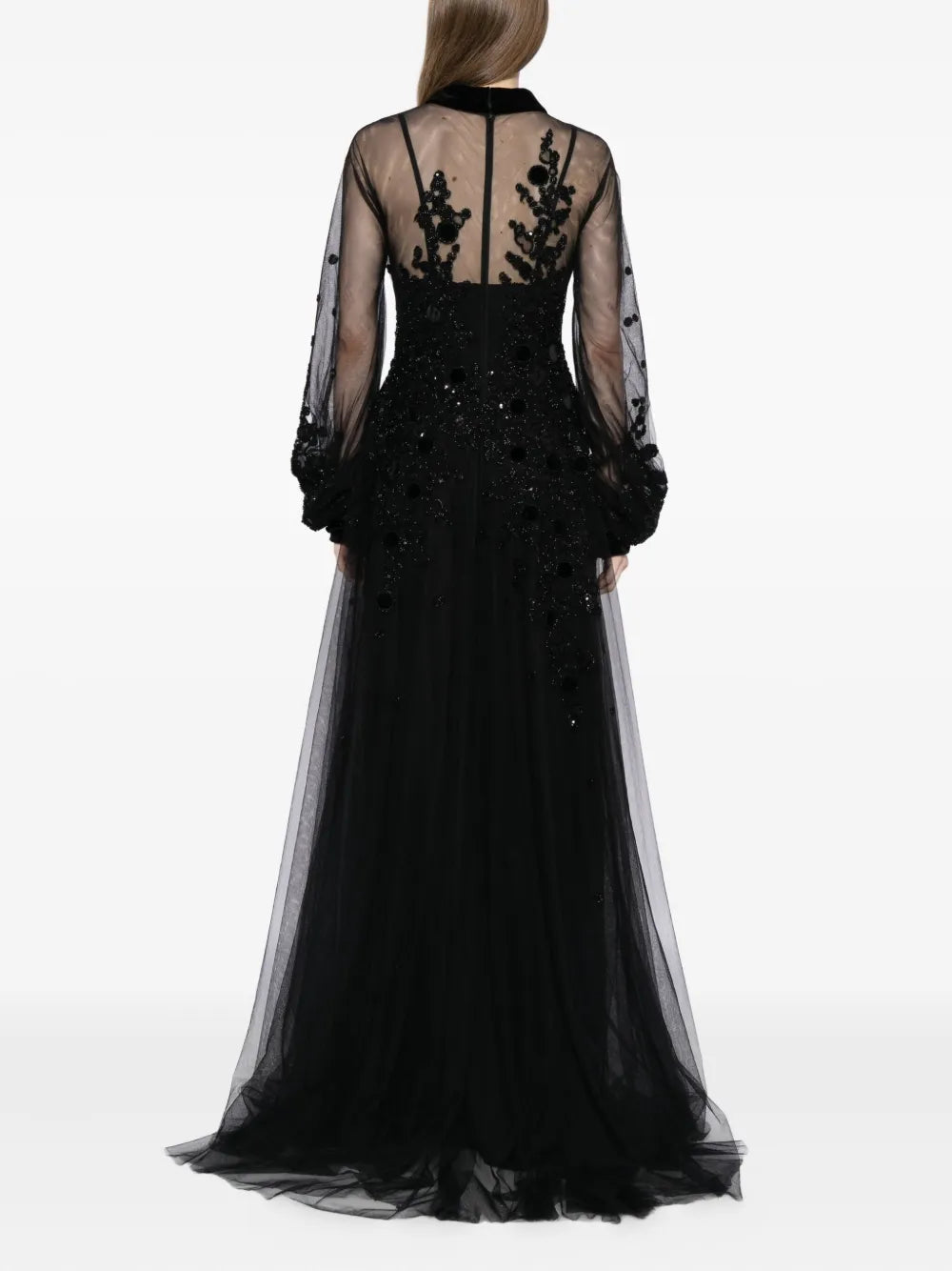 أول ما يلفتك في هذا الفستان هو لونه العنابي بالإضافة إلى الدوائر التي تغمره في المنطقة العلوية. يتميز الفستان بأكمام طويلة وأساور مخملية مع تطريز دقيق يمتد برشاقة نحو التنورة.