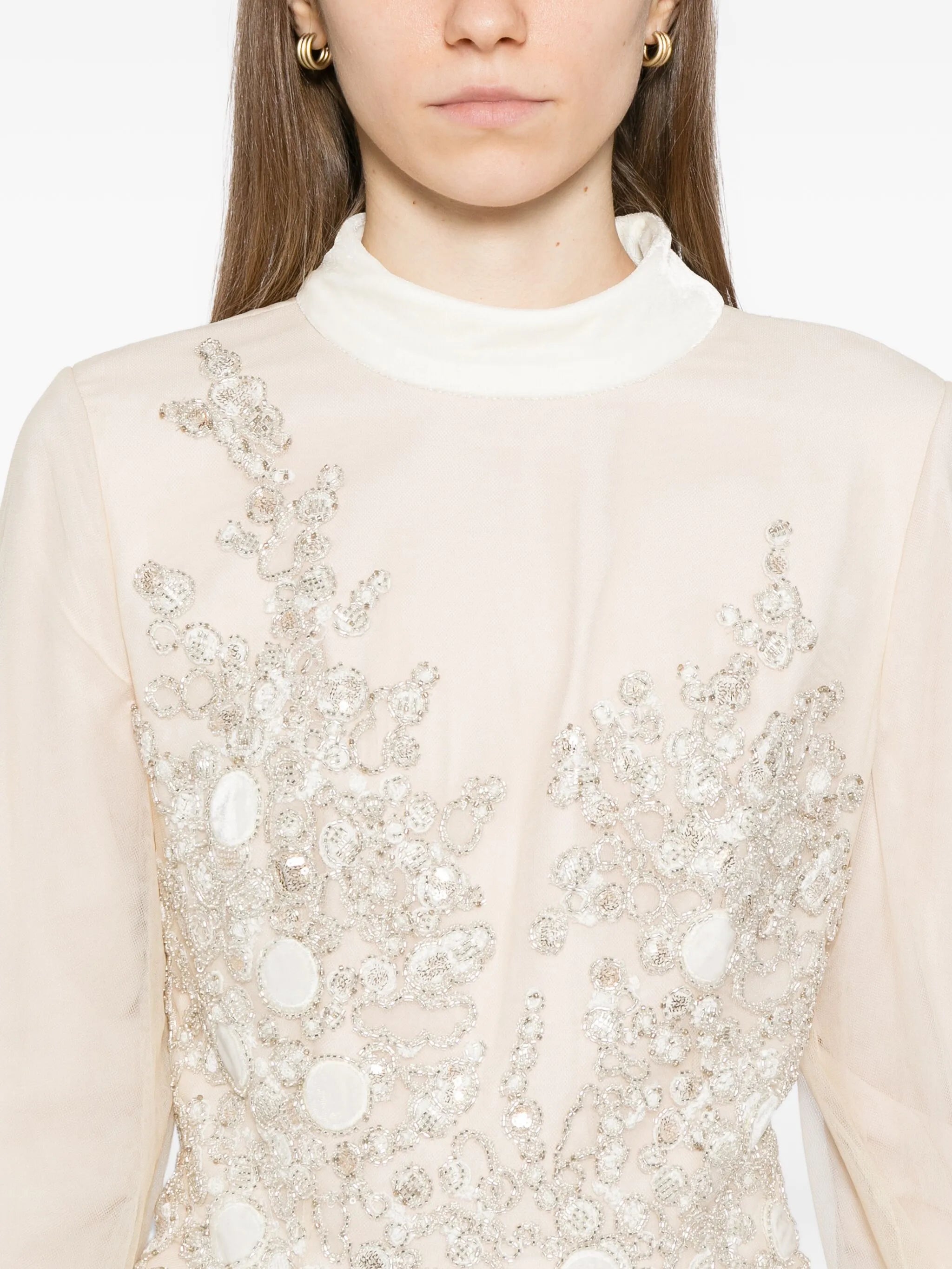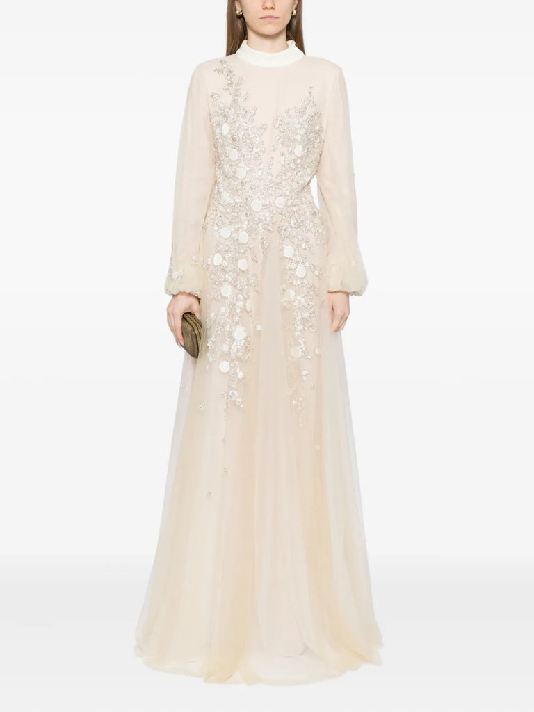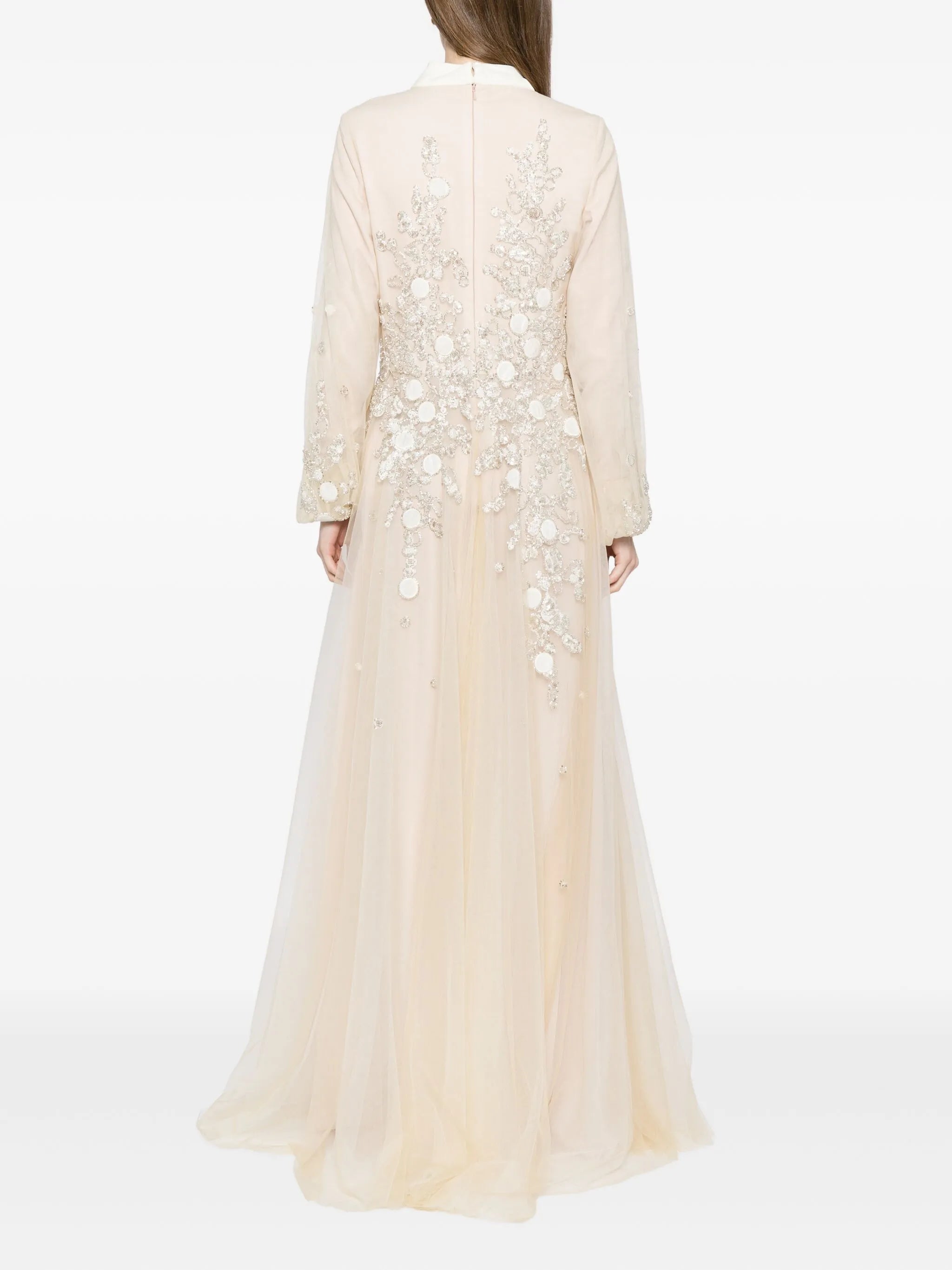 أول ما يلفتك في هذا الفستان هو لونه العنابي بالإضافة إلى الدوائر التي تغمره في المنطقة العلوية. يتميز الفستان بأكمام طويلة وأساور مخملية مع تطريز دقيق يمتد برشاقة نحو التنورة.
