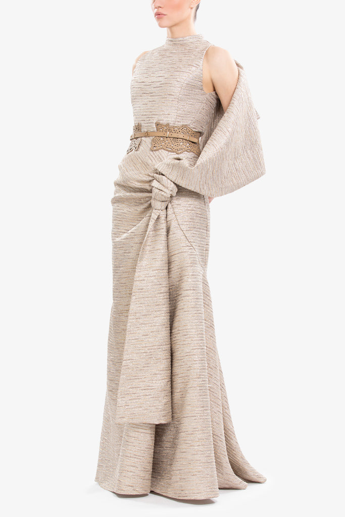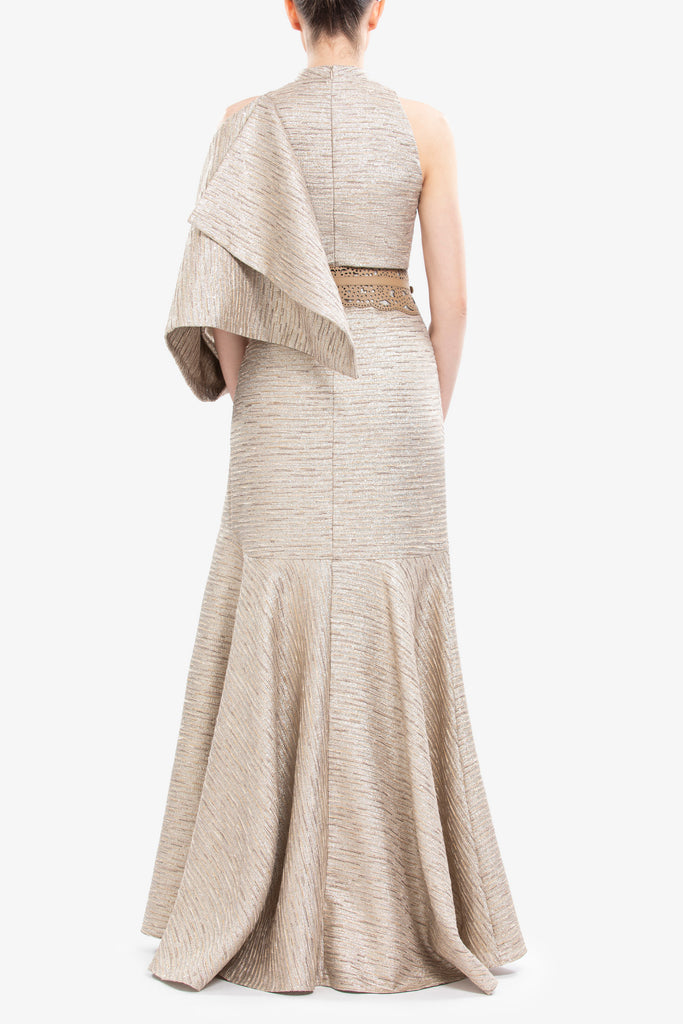 فستان مذهل بياقة ذهبية فاتحة بفتحة حول العنق ذهبية فاتحة وطول أرضي ويتميز بقماش معقود عند خط الوسط يمتد برشاقة إلى الخلف.