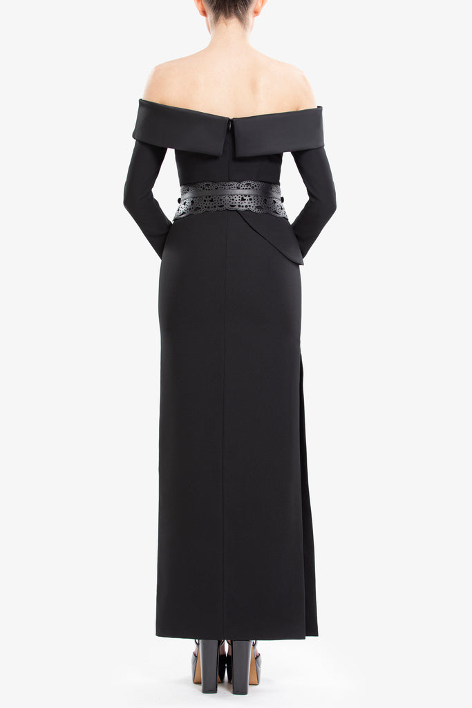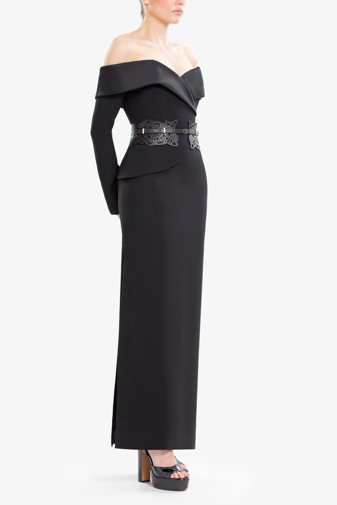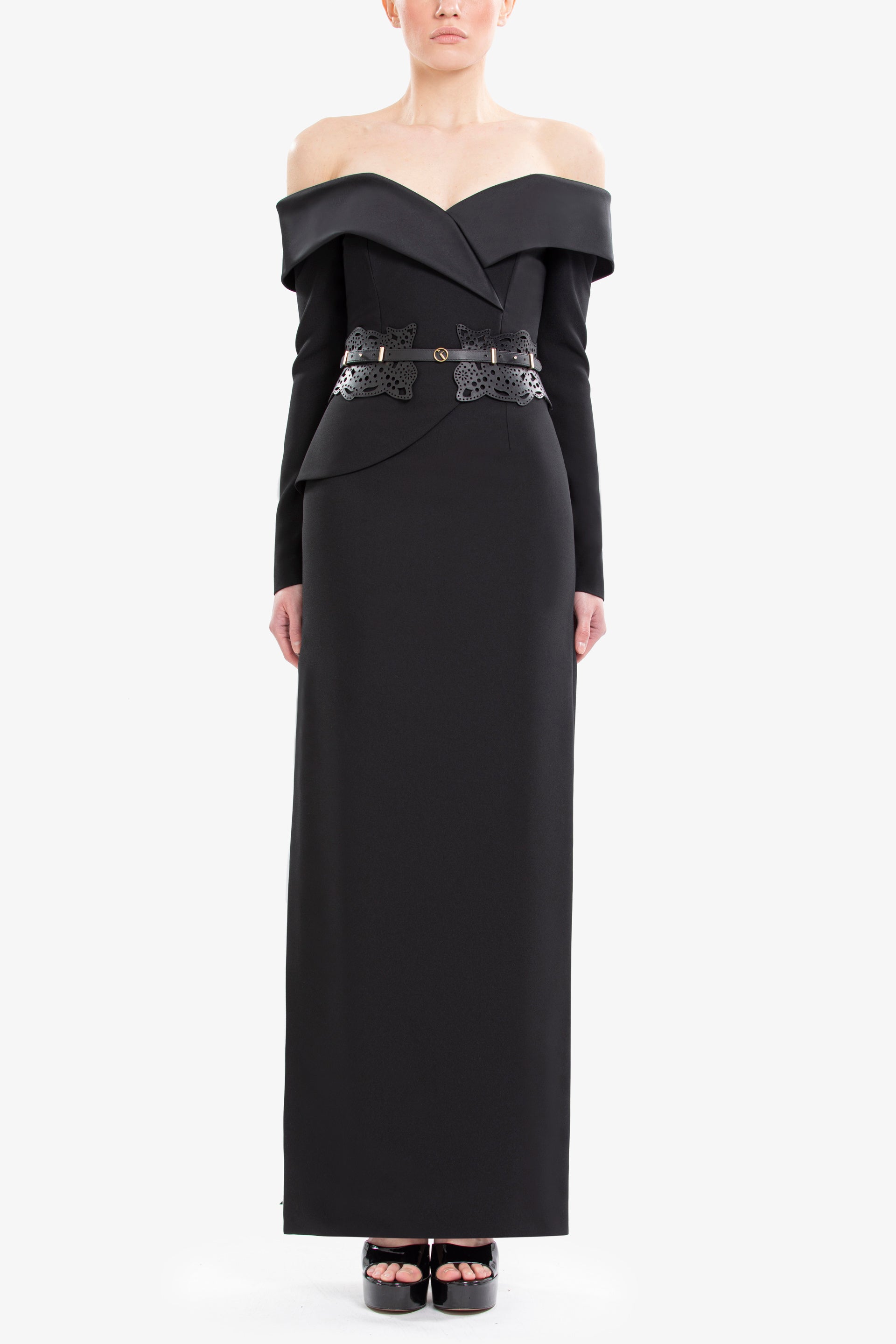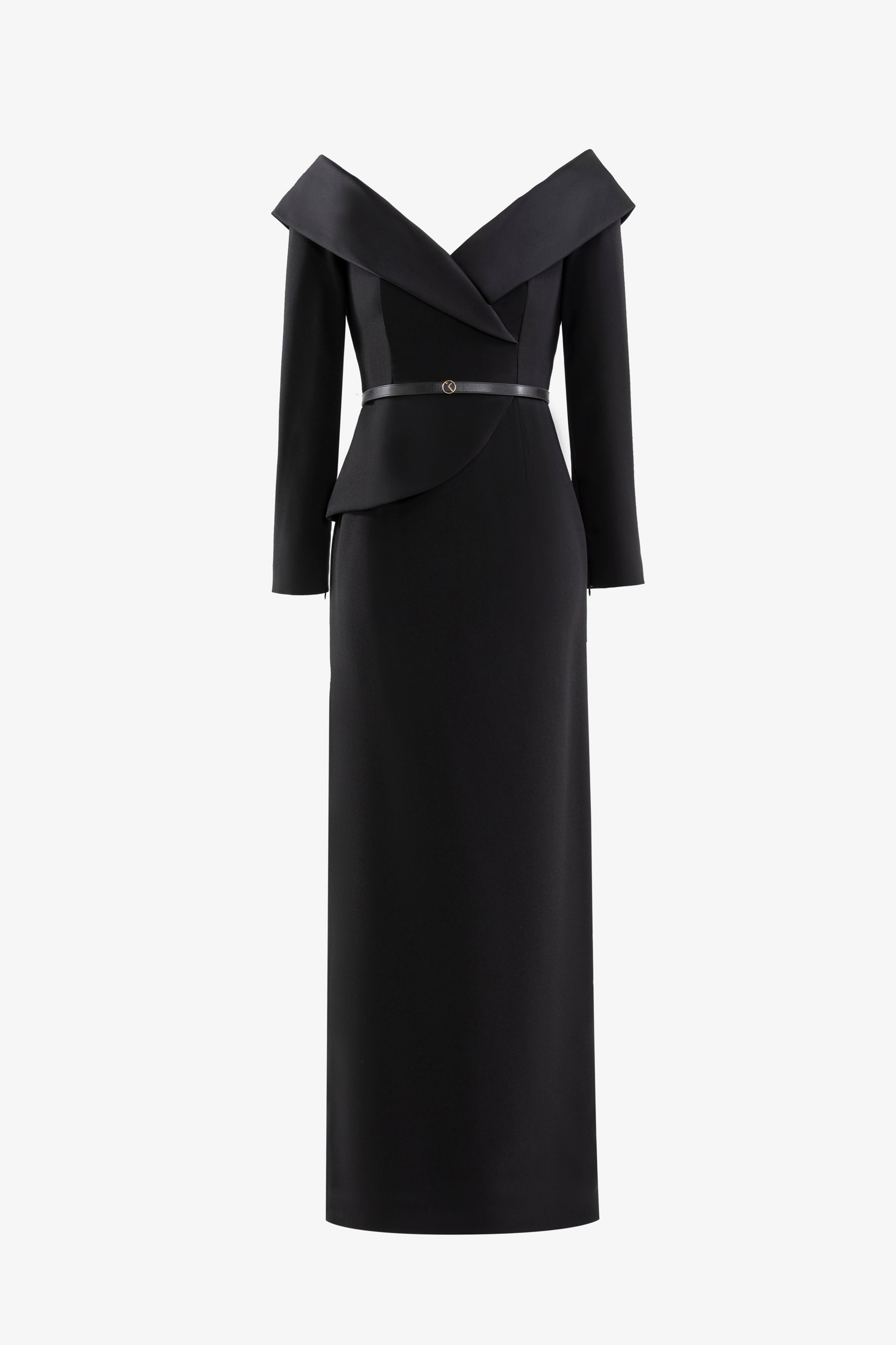فستان أنيق باللون الأسود الفاحم مصنوع من الكريب والساتان الكريب، ويتميز بفتحة رقبة مكشوفة الأكتاف وأكمام طويلة وتنورة متوسطة الطول بقصّة مستقيمة. يتماشى مع حزام SK من الجلد المثقب 100% المطابق.