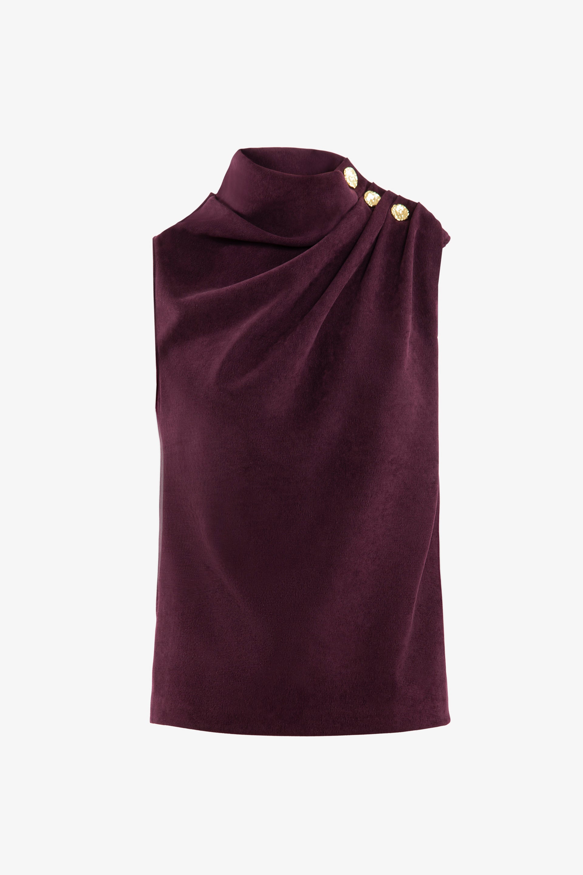 بلوزة إيطالية بطيّات برقوق إيطالي مع ياقة عالية وأزرار ذهبية على الكتف.