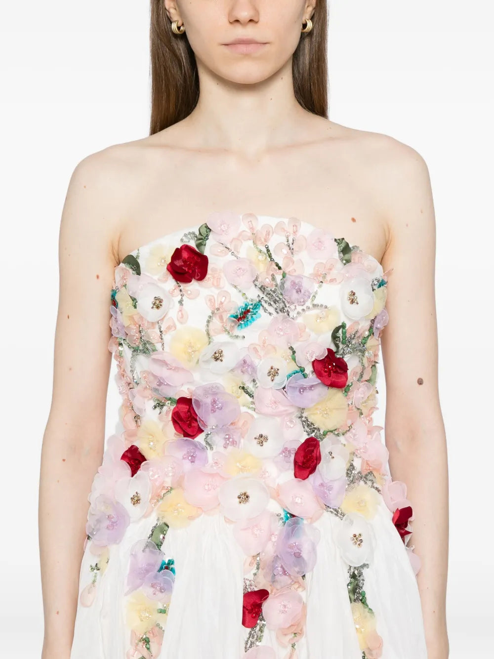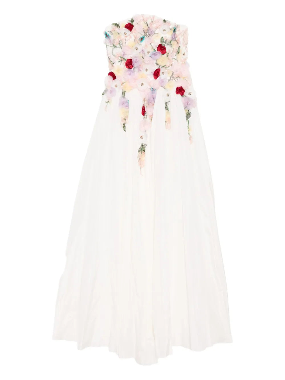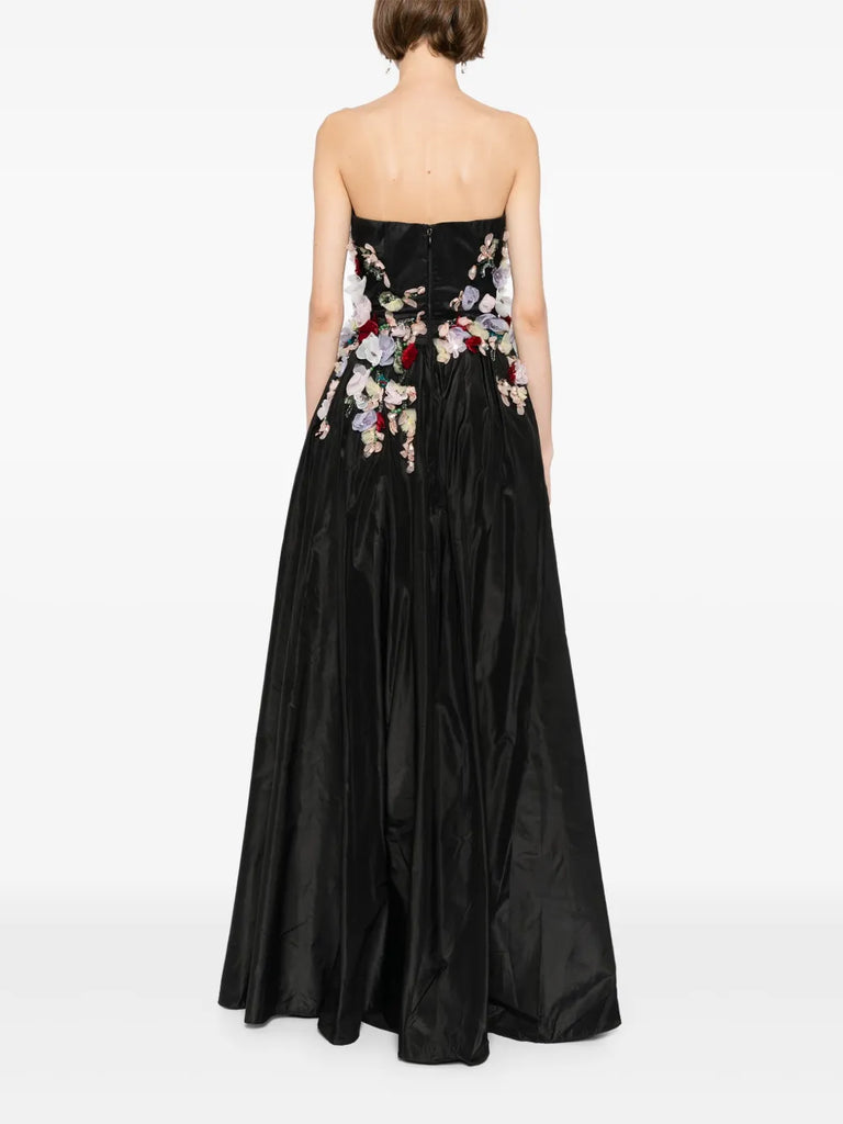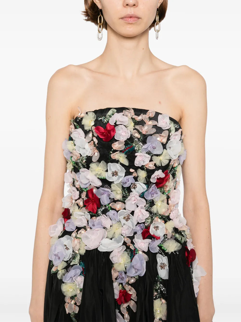 فستان من التفتا الأسود النفاث مزين من الأعلى بأزهار الأورجانزا ثلاثية الأبعاد بألوان وأشكال مختلفة، والتي تتناقص تدريجيًا في التنورة. يتميز الفستان أيضًا بجيوب مريحة