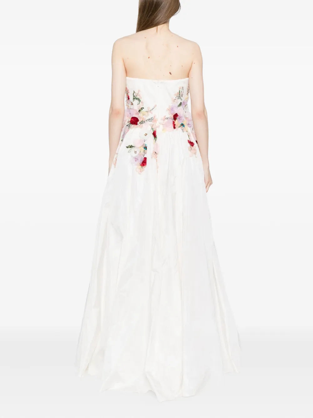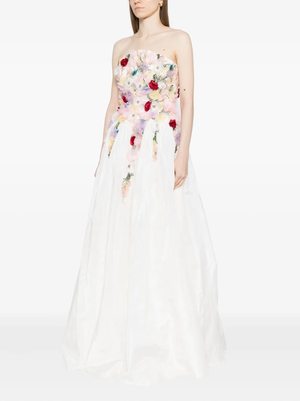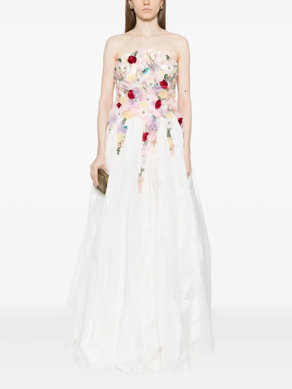 فستان من التفتا الأسود النفاث مزين من الأعلى بأزهار الأورجانزا ثلاثية الأبعاد بألوان وأشكال مختلفة، والتي تتناقص تدريجيًا في التنورة. يتميز الفستان أيضًا بجيوب مريحة