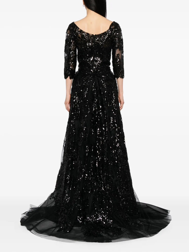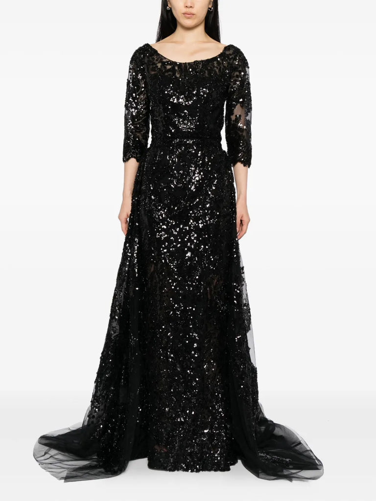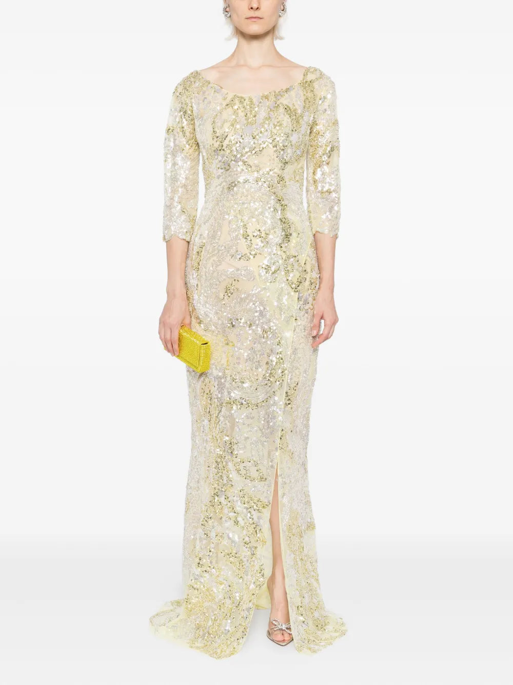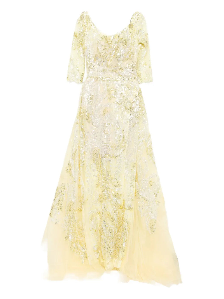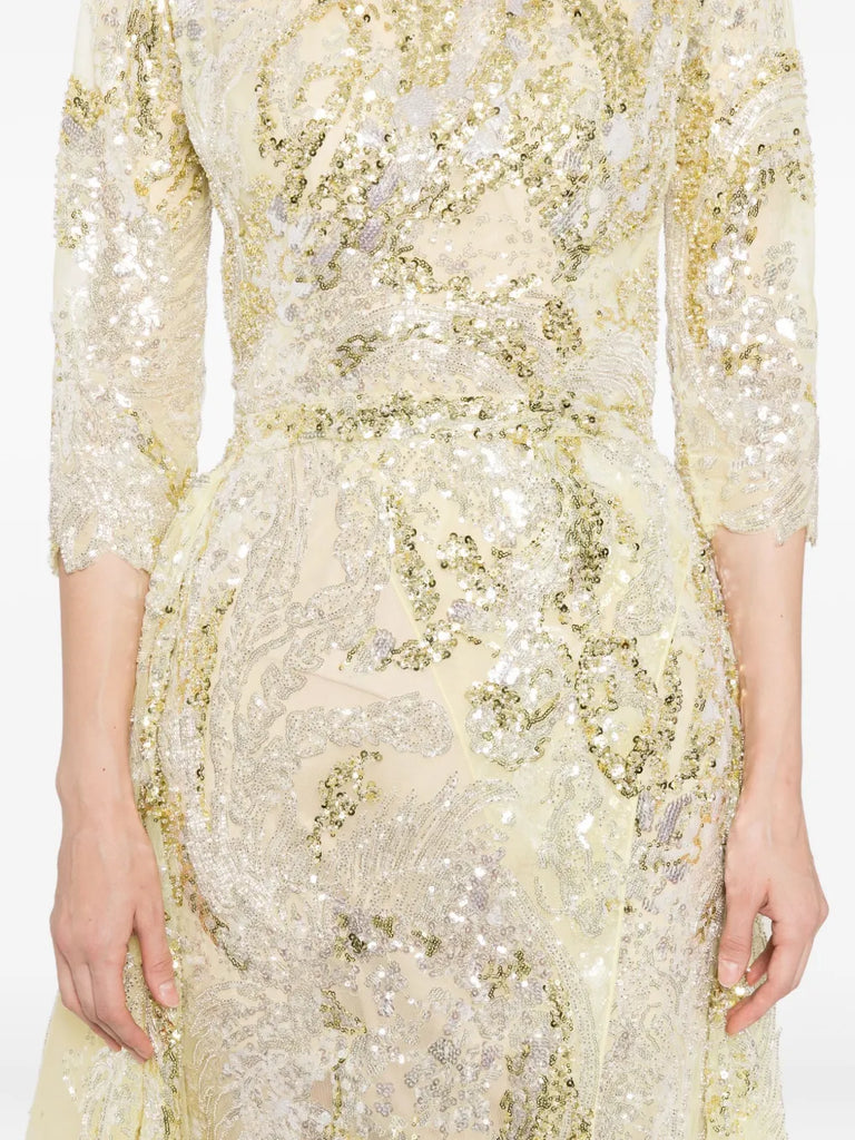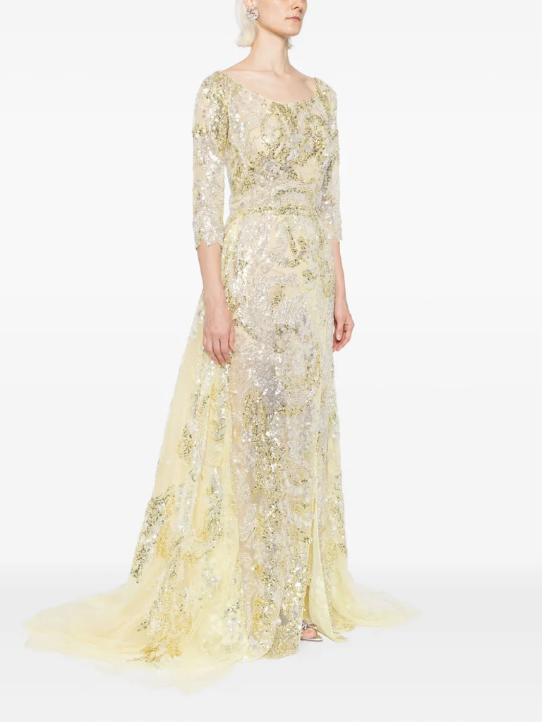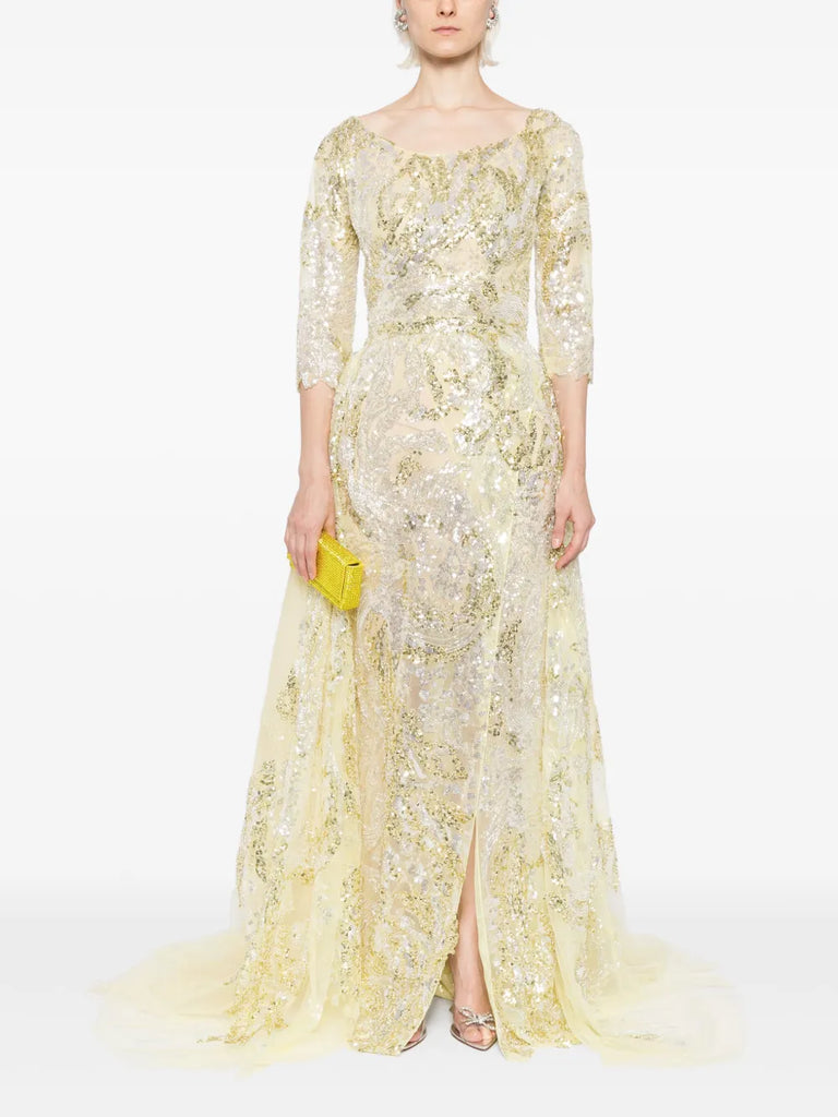 يتميز الفستان الوردي السماوي الطويل والمطرّز بالكامل بتنورة ضيّقة ذات فتحة مع تنورة علوية متناسقة قابلة للفصل. يتضمن التصميم أكمام 3/4 أكمام وتقويرة عريضة ملونة. الفستان مطرز بشكل معقد بخيوط وردية سماوية وترتر لامع.