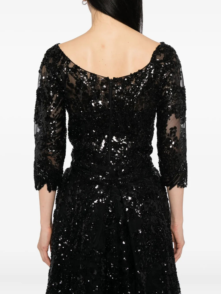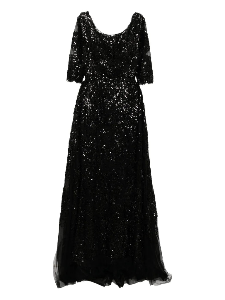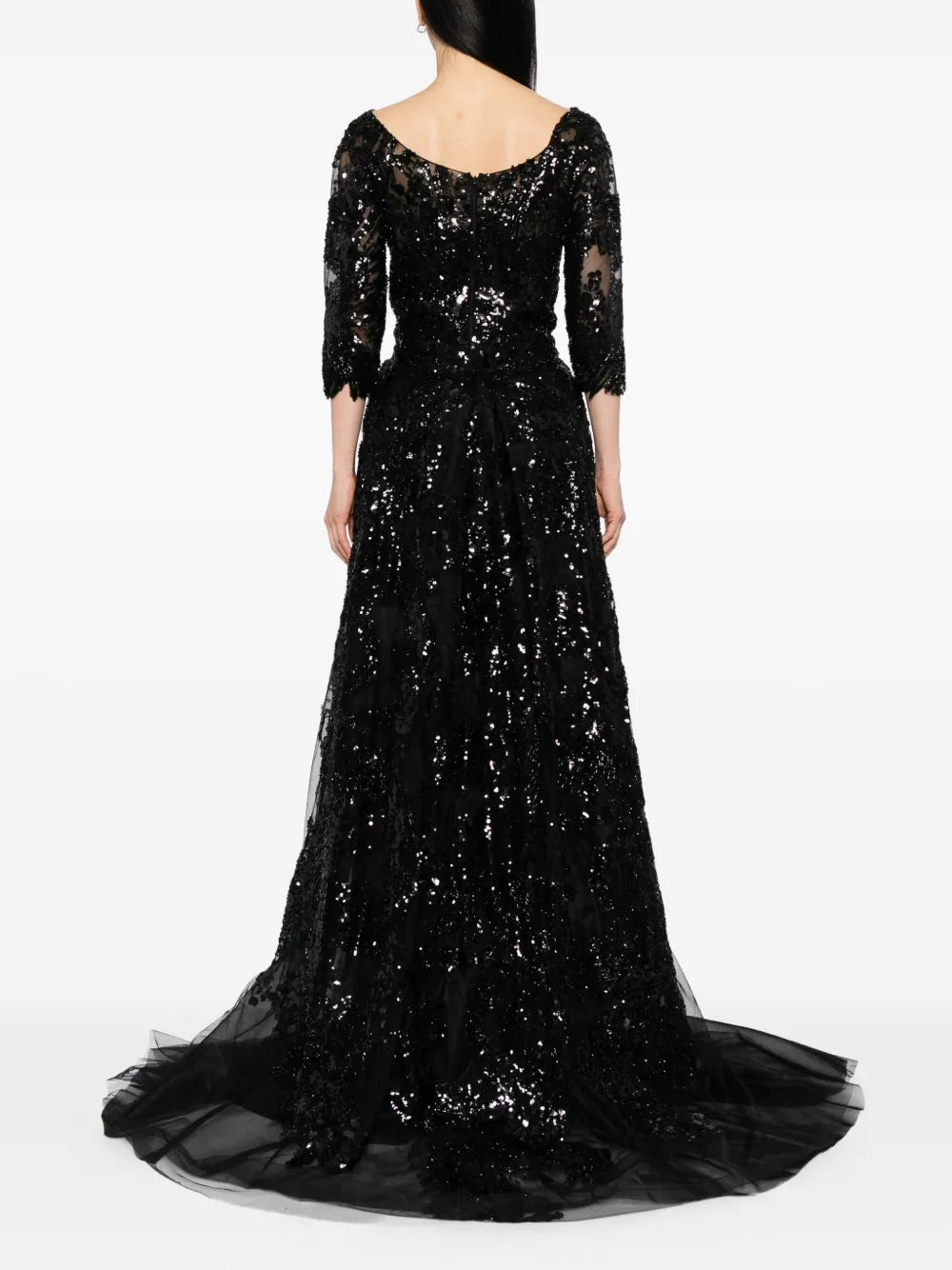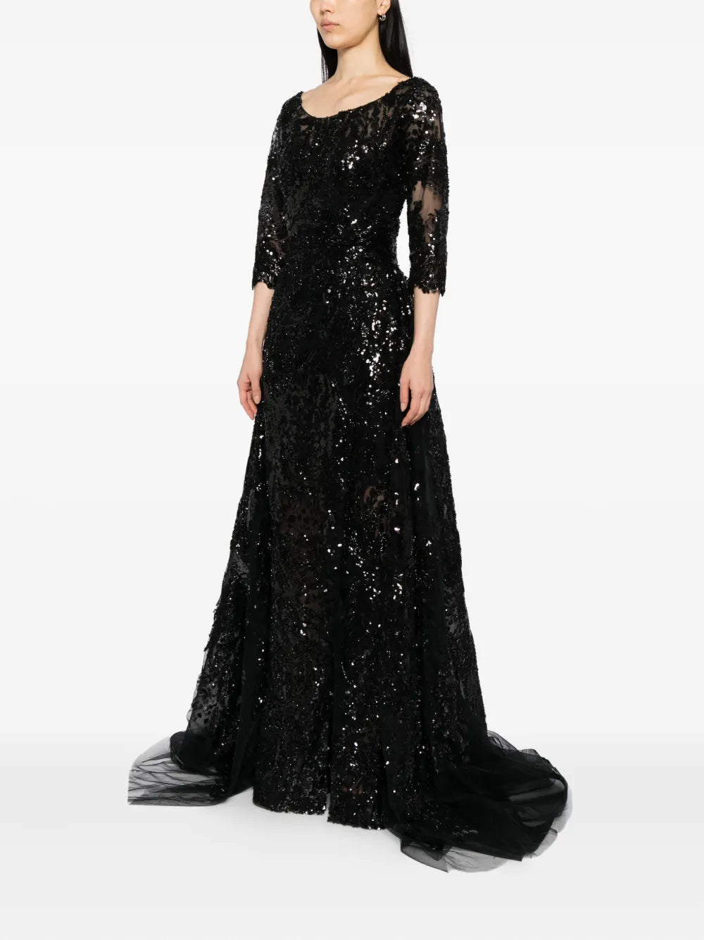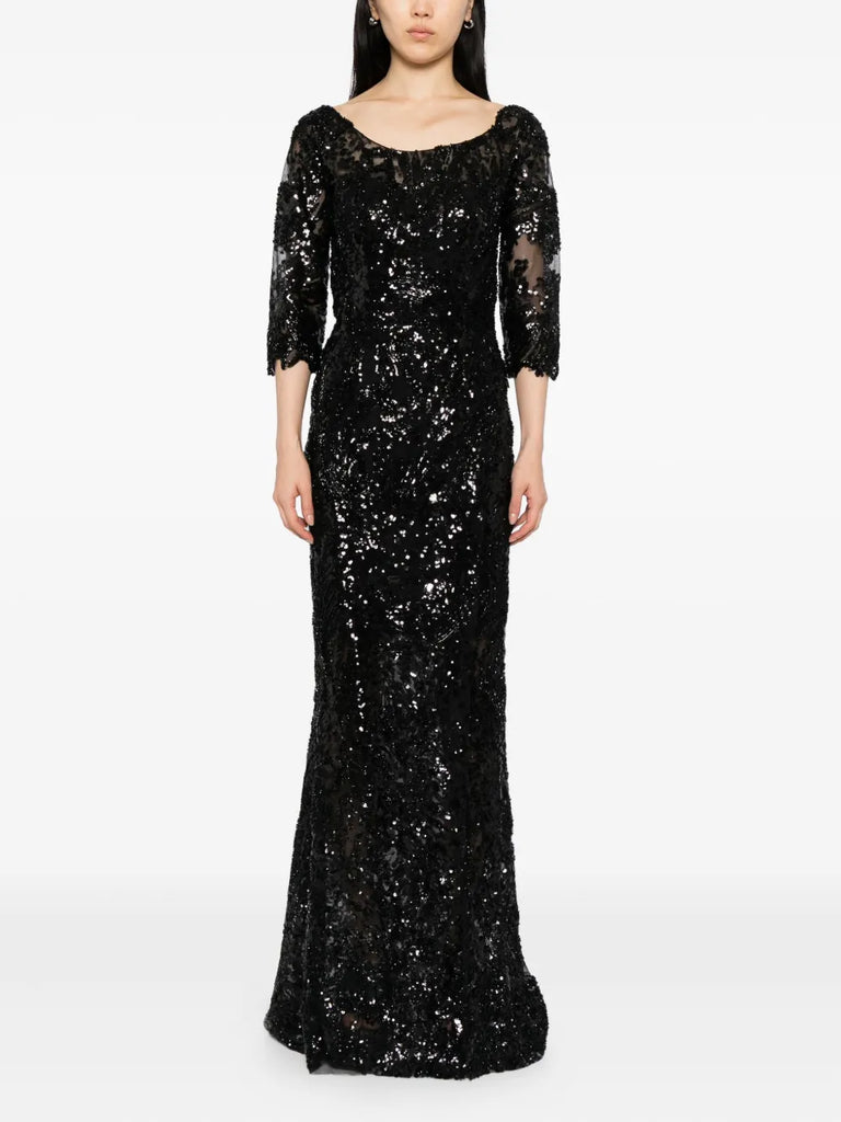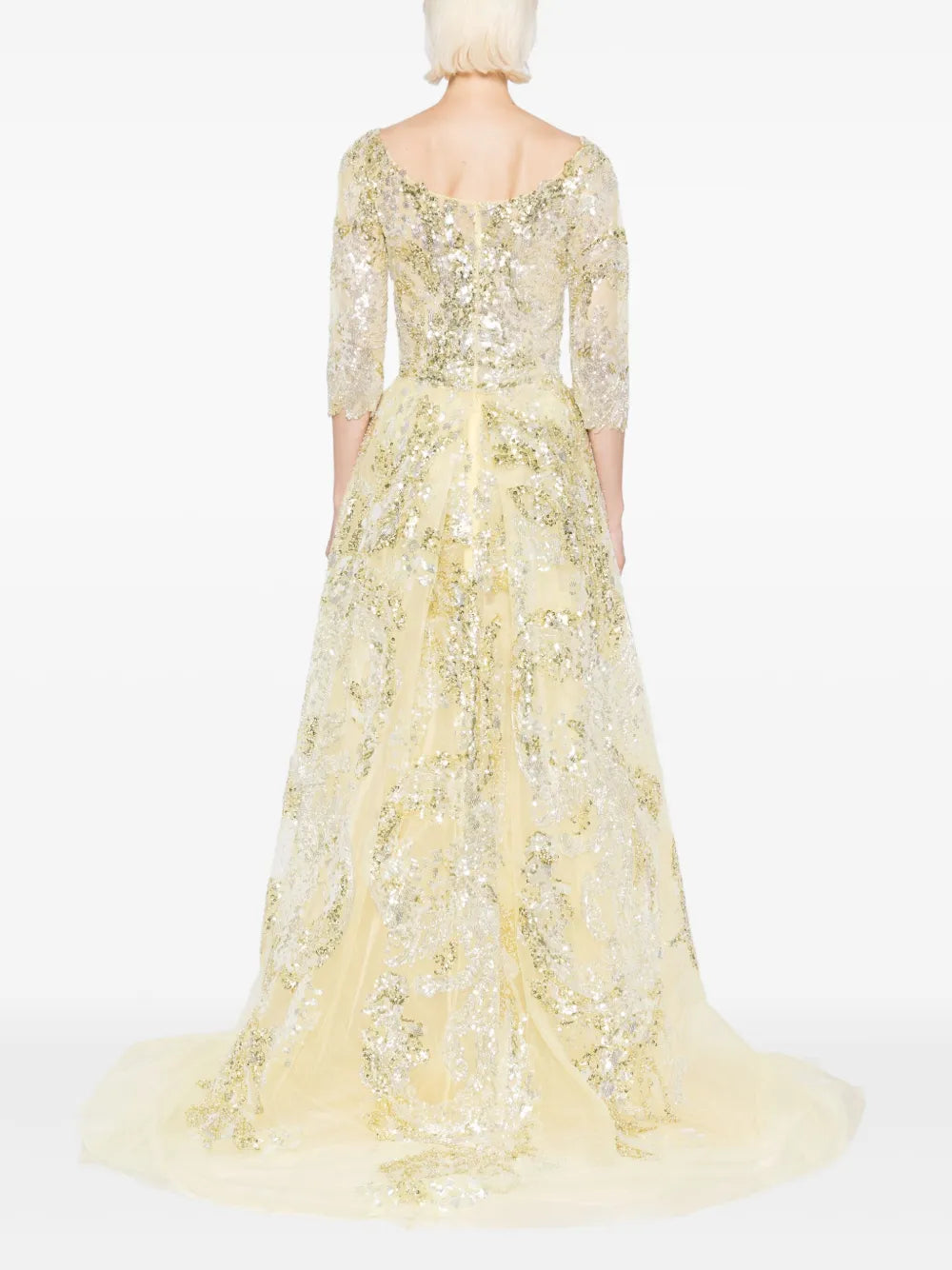 يتميز الفستان الوردي السماوي الطويل والمطرّز بالكامل بتنورة ضيّقة ذات فتحة مع تنورة علوية متناسقة قابلة للفصل. يتضمن التصميم أكمام 3/4 أكمام وتقويرة عريضة ملونة. الفستان مطرز بشكل معقد بخيوط وردية سماوية وترتر لامع.