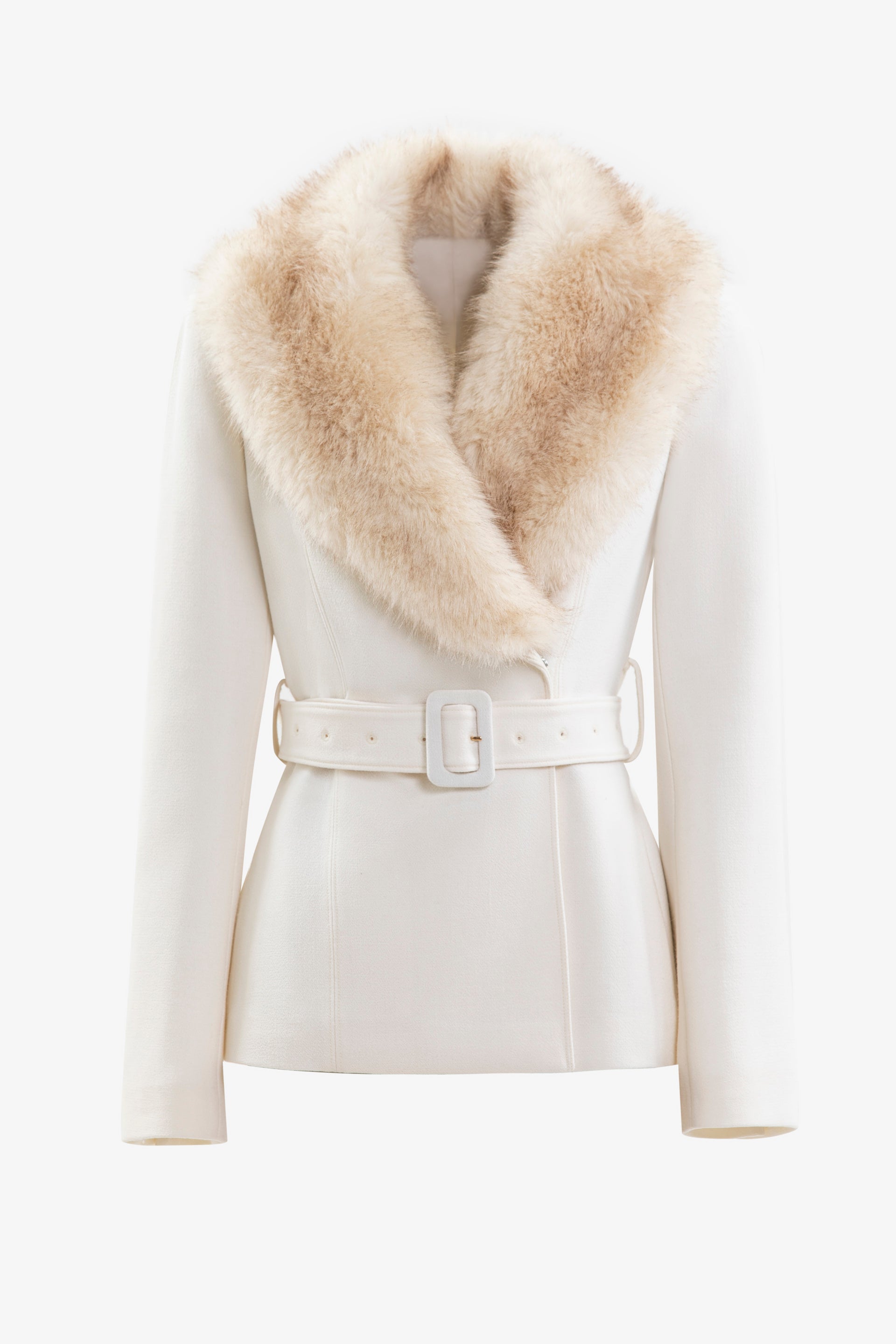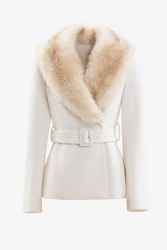 جاكيت مفصل باللون الأبيض الأوف وايت مصمم بأناقة مع حزام عريض متناسق عند الخصر، مما يخلق تصميمًا أنيقًا ومنظمًا، وفرو قابل للفصل على طية الصدر.