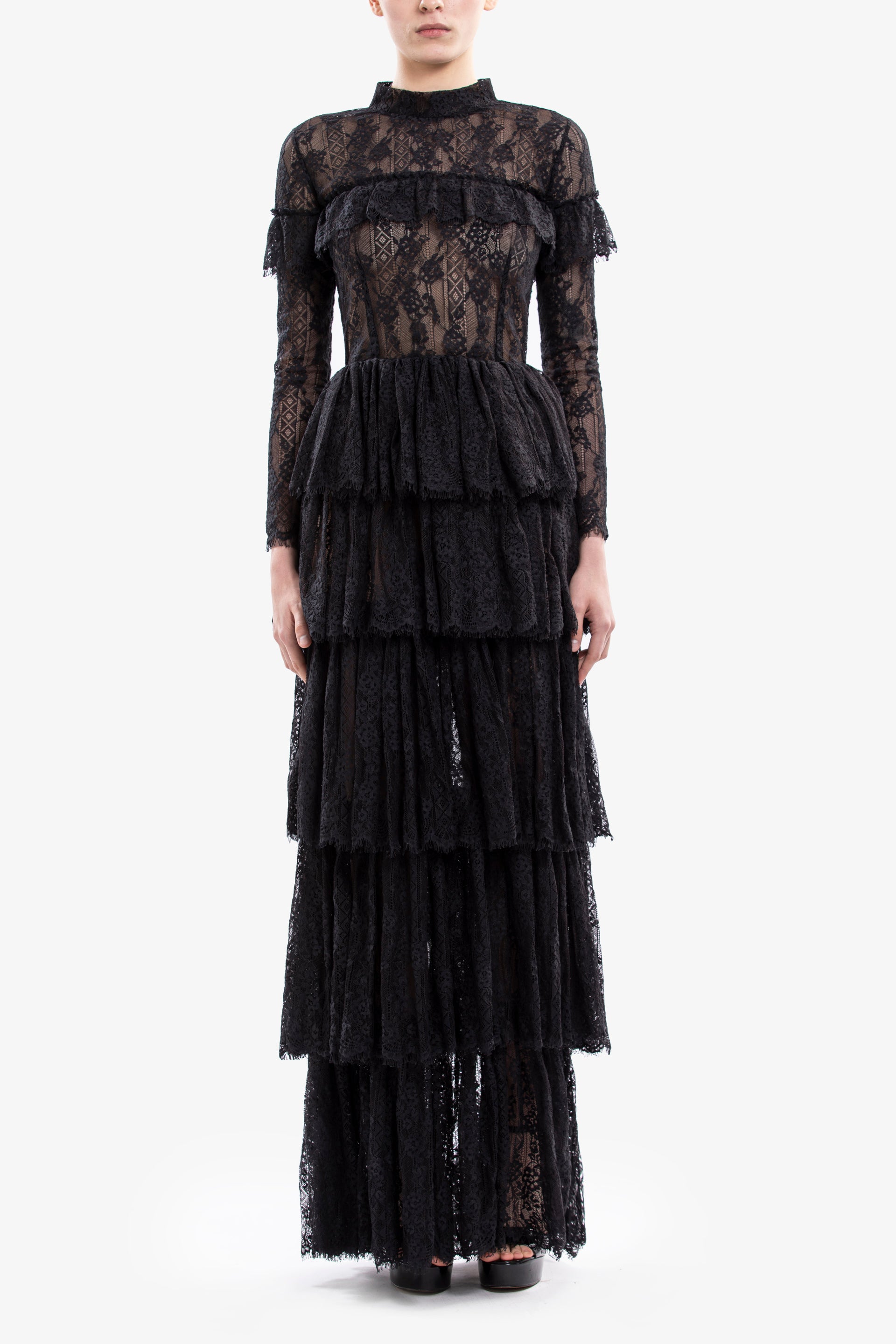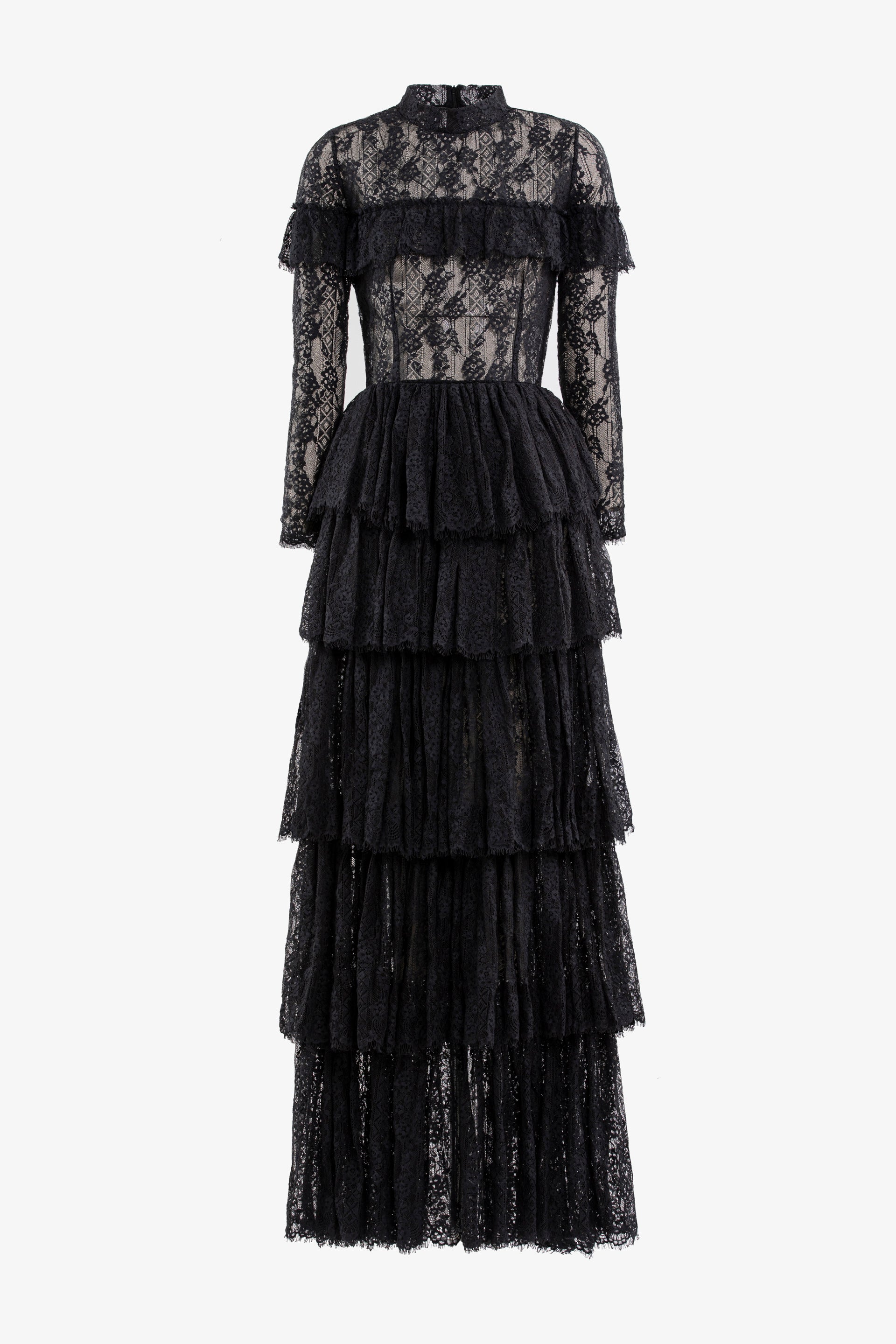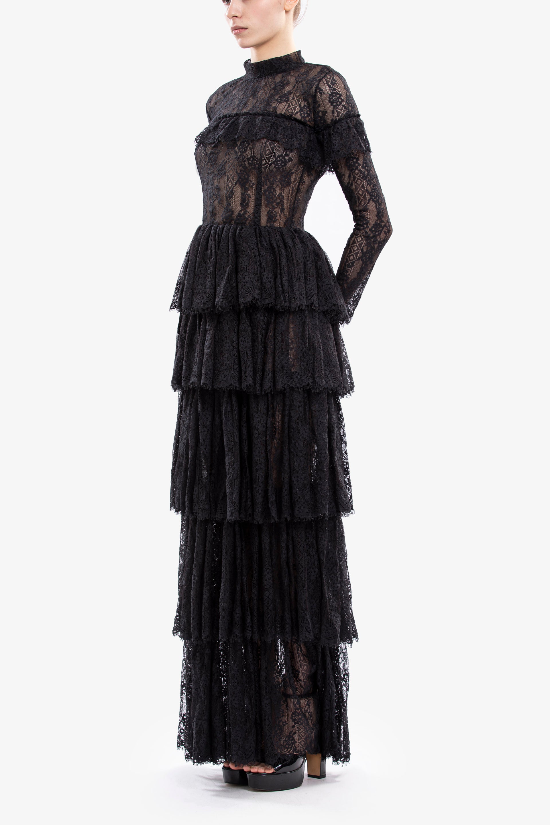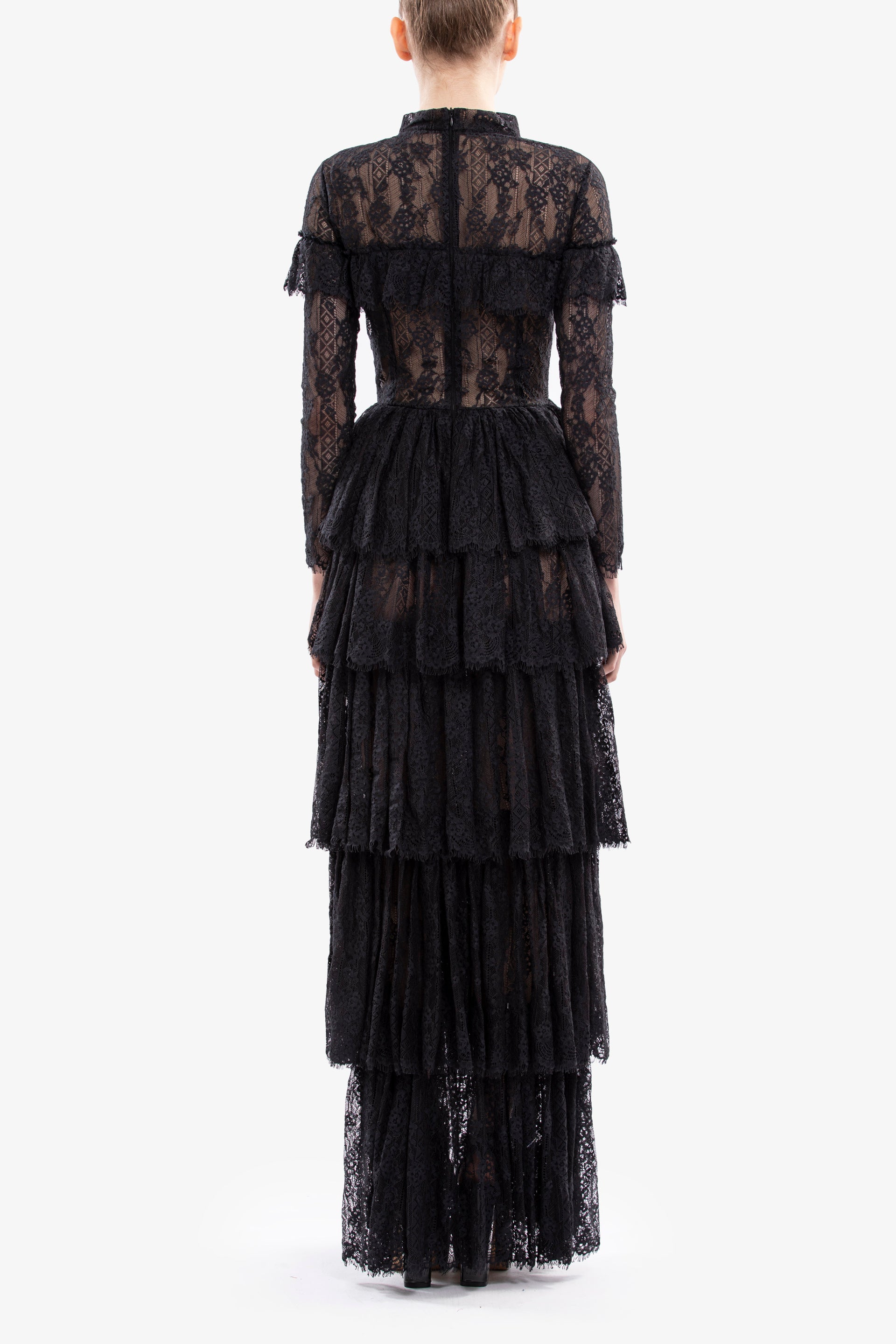يتميز هذا الفستان الطويل باللون الأسود الفاحم بأكمام طويلة وتنورة مجمعة بطبقات. يضفي تصميم الدانتيل المعقد ملمسًا وعمقًا، بينما يضفي الشكل الانسيابي لل تنورة المجمعة مظهرًا أنيقًا.