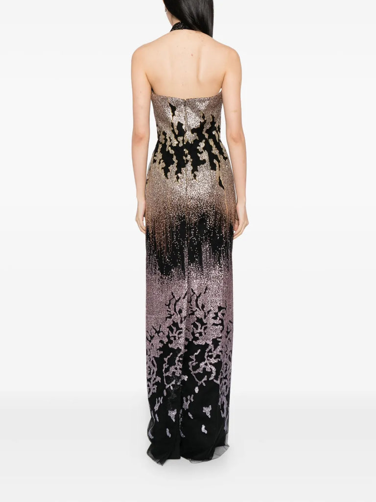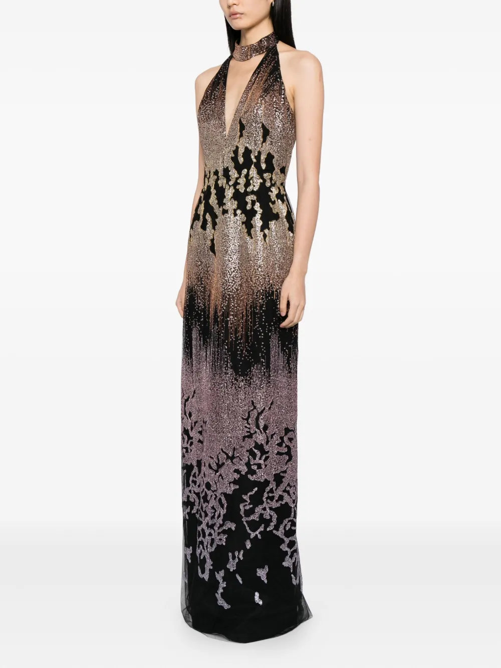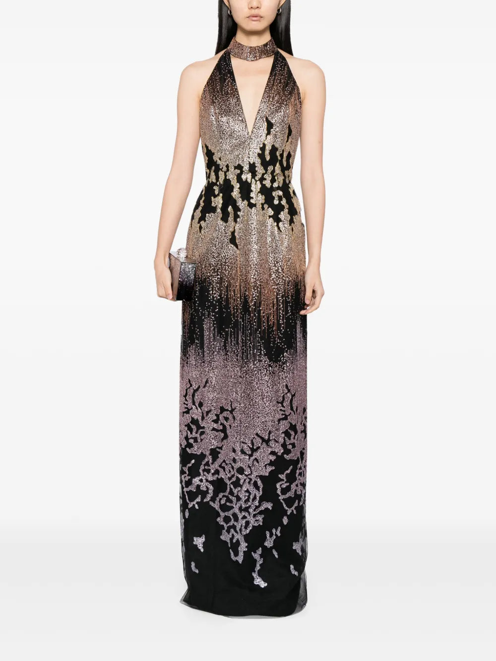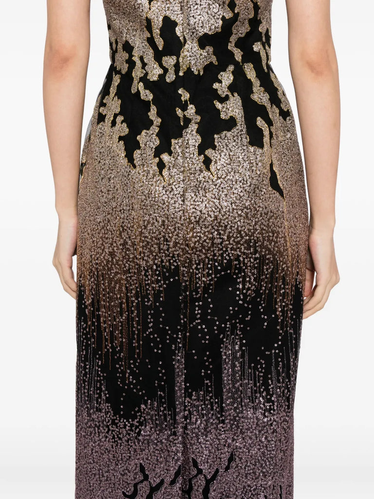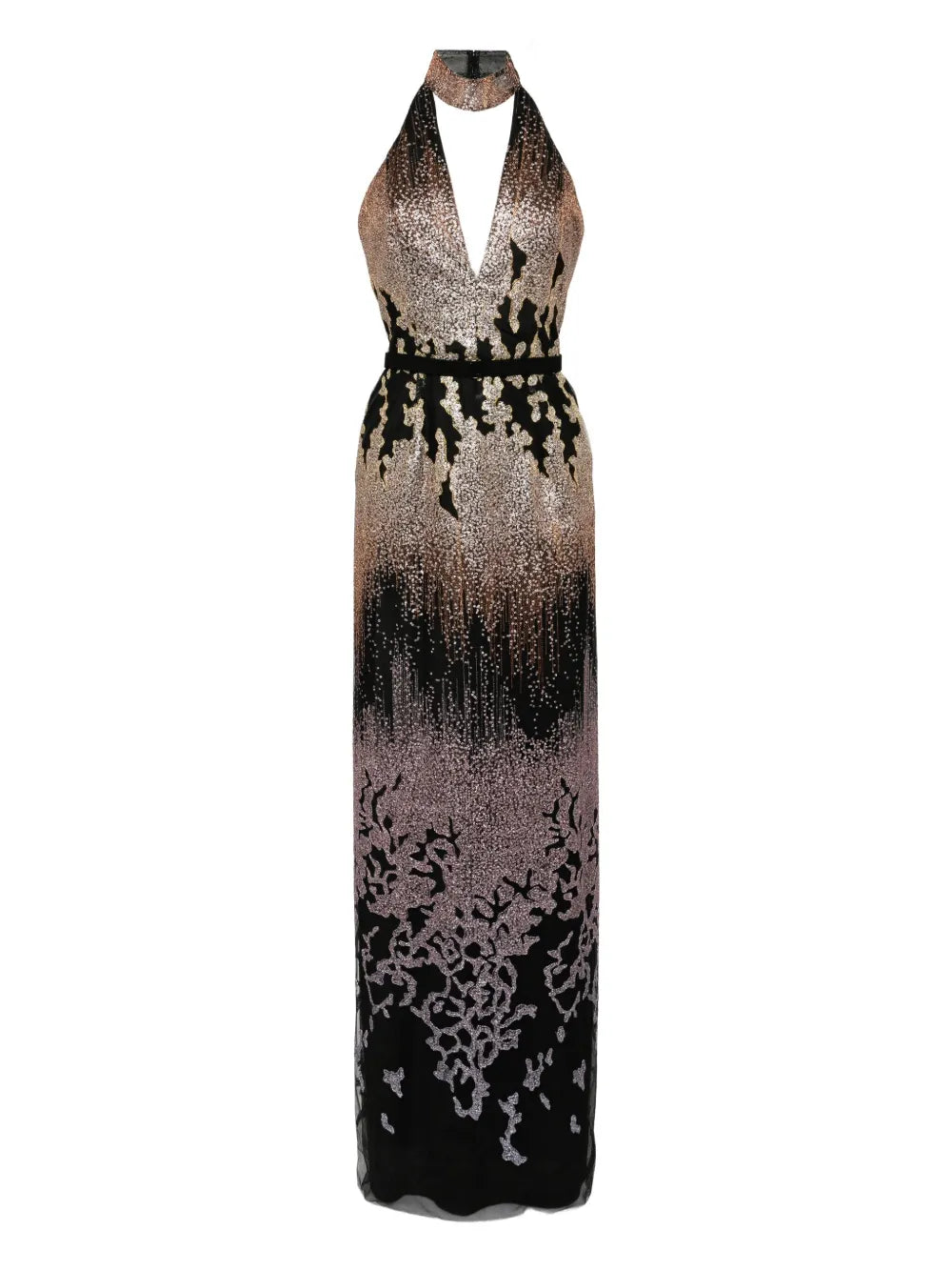 يتميز الفستان الطويل الضيّق المزخرف المصنوع من التل المزخرف بياقة على شكل حرف V عميق. يتحول التصميم المتلألئ من اللون الفضي في الجزء العلوي إلى اللون الأصفر الكمثري اللامع في الجزء السفلي. يتناسق الفستان مع حزام SK أسود أنيق باللون الأسود النفاث.