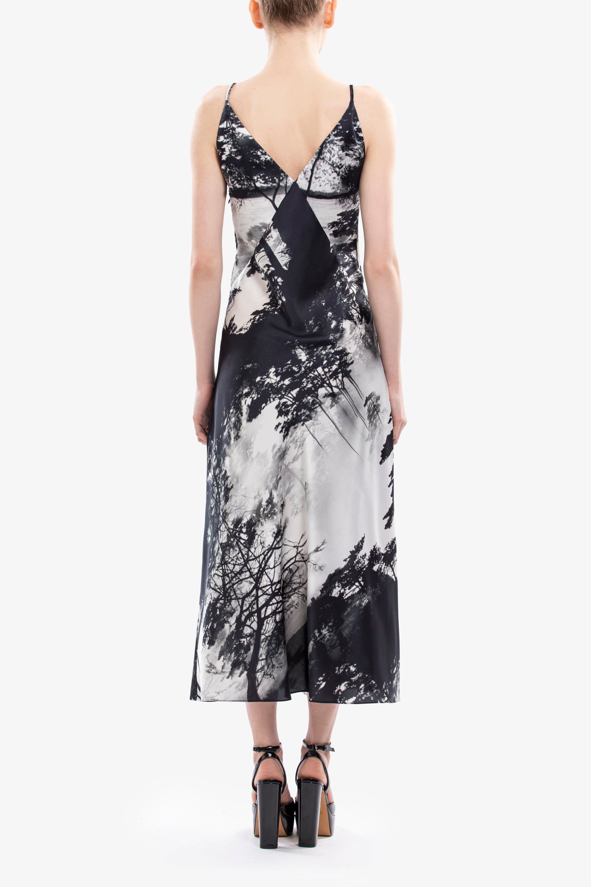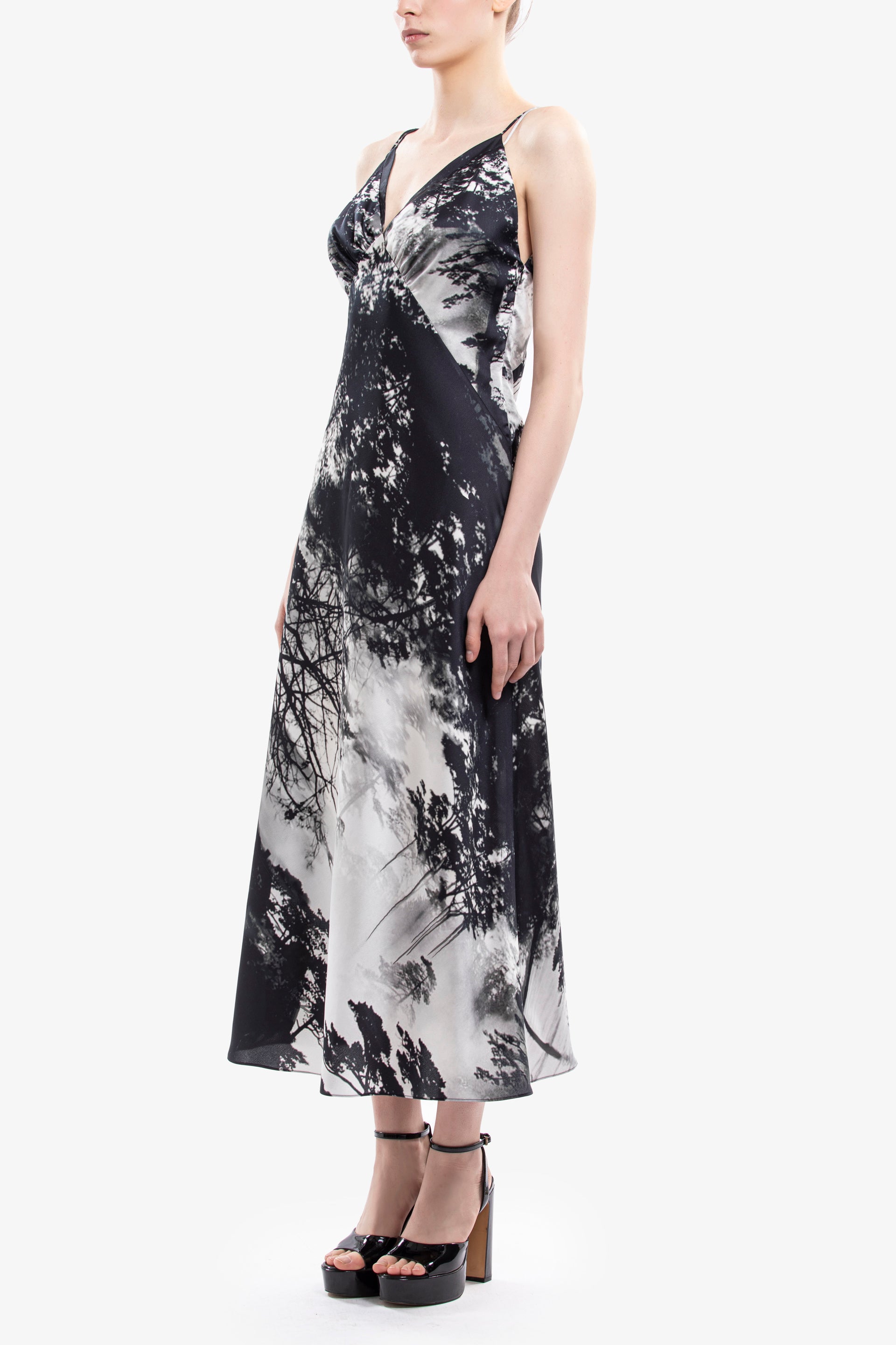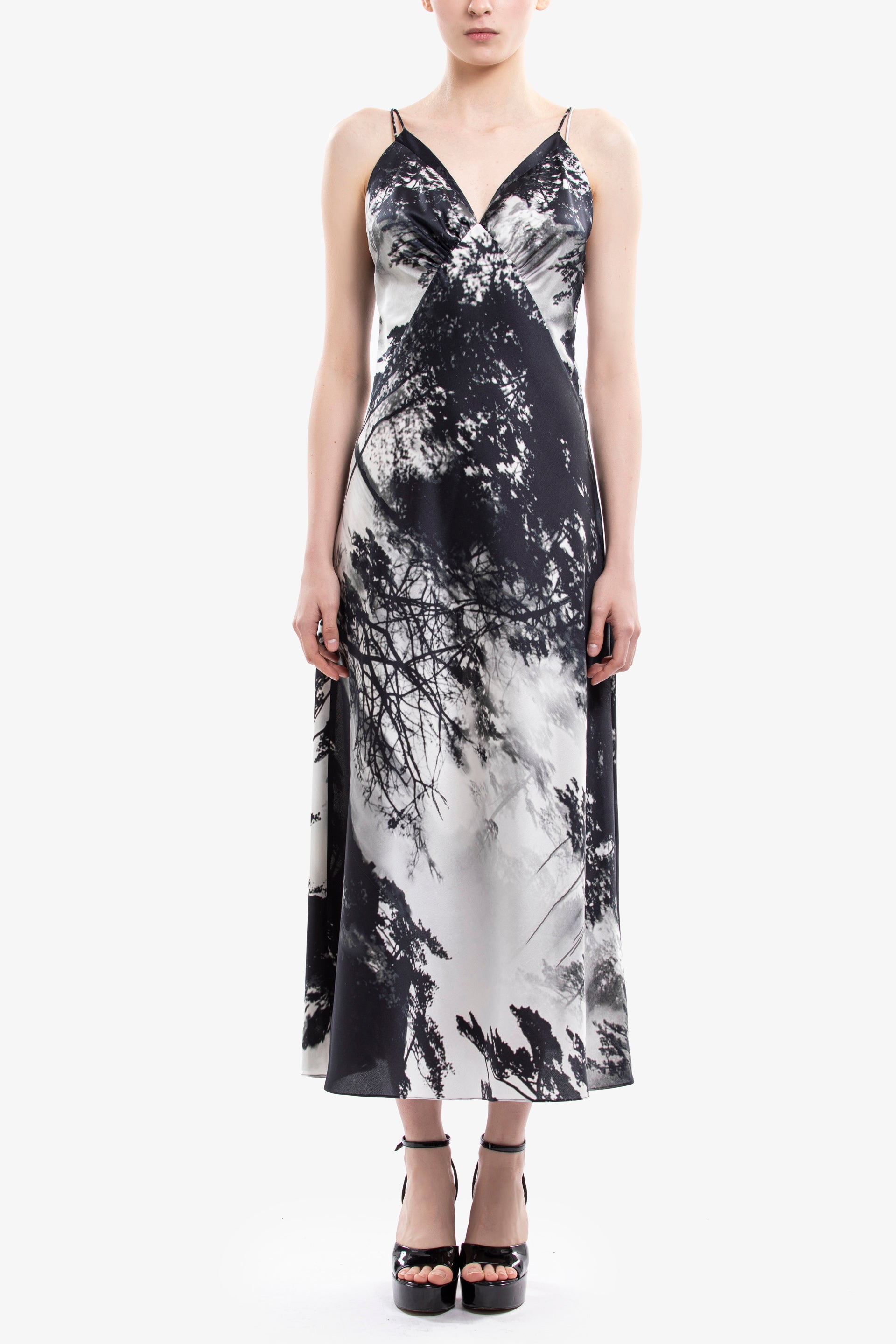 فستان ميدي مصنوع من الساتان الفاخر، ويتميز بطبعة نابضة بالحياة. يتميز بياقة على شكل V أنيقة، ومصمم بحمالات رفيعة لإضفاء لمسة أنيقة.