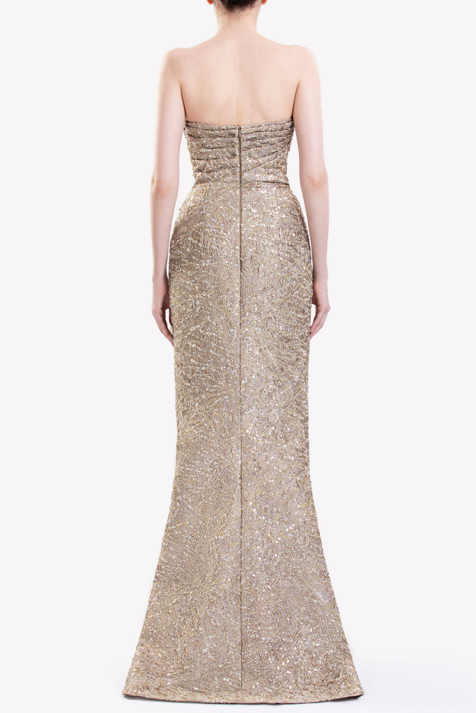 فستان مطرّز بالديباج الذهبي مع تقويرة مستقيمة بدون حمالات وقصّة ضيّقة، ويتميز بفتحة منسدلة غير متناسقة عند الخصر وشق أمامي. يتميز بحافة بطول يصل إلى الأرض.