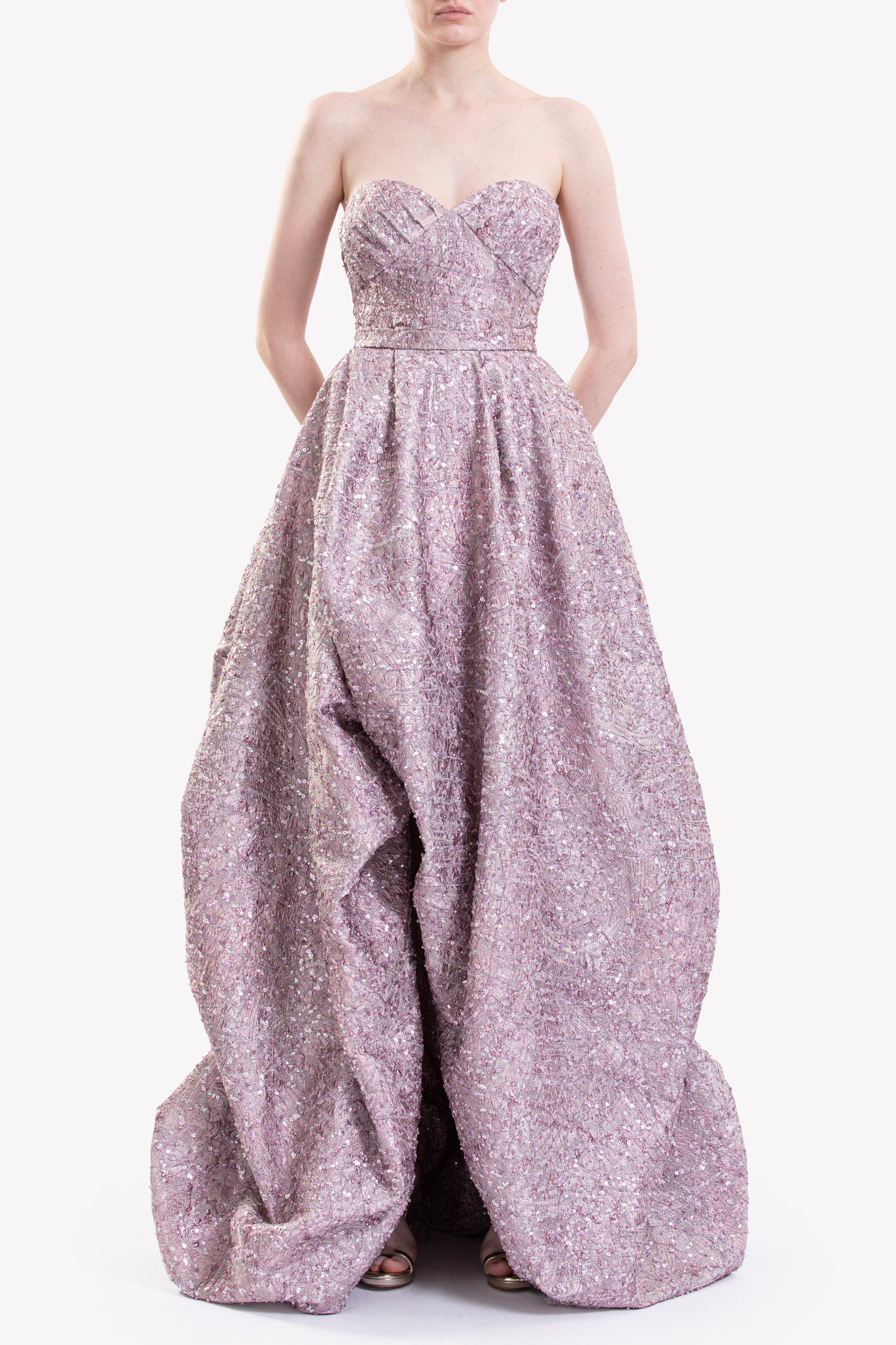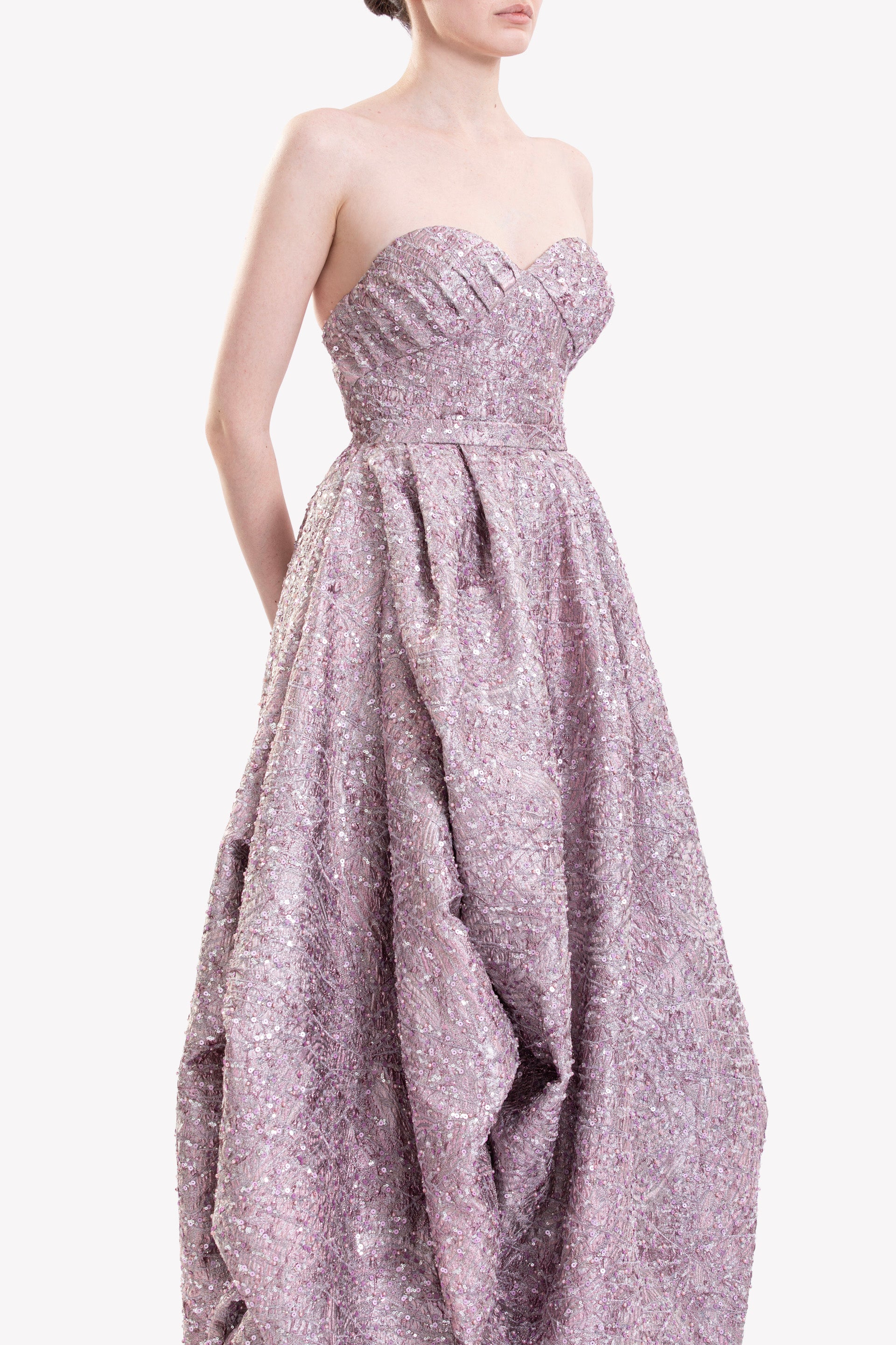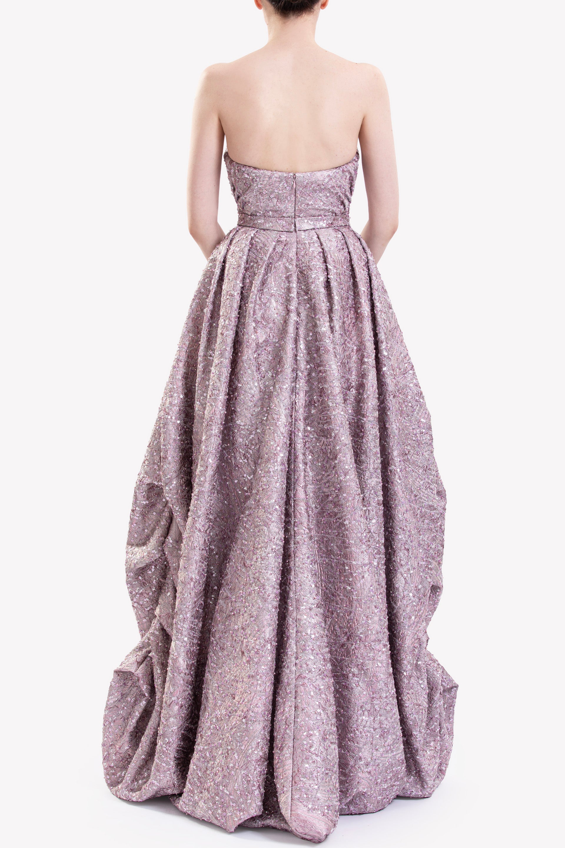 فستان من قماش البروكار باللون الوردي الفاتح مع خط رقبة على شكل قلب بدون أكمام وجسم ضيق، يتميز بخصر منظم وتنورة طويلة من الأمام وقصيرة من الخلف مع شق أمامي.