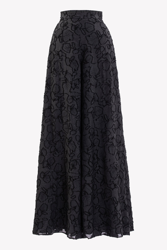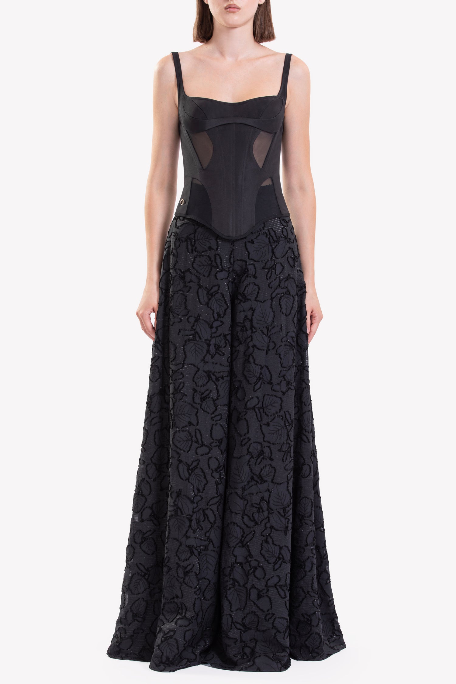 كورسيه أسود جيت بلون أسود جيت بقصة منظمة. يتميز بتول شفاف على اللوحة الجانبية مع بنطلون أسود جيت بلون أسود جيت أسود عالي الخصر وواسع الساقين.