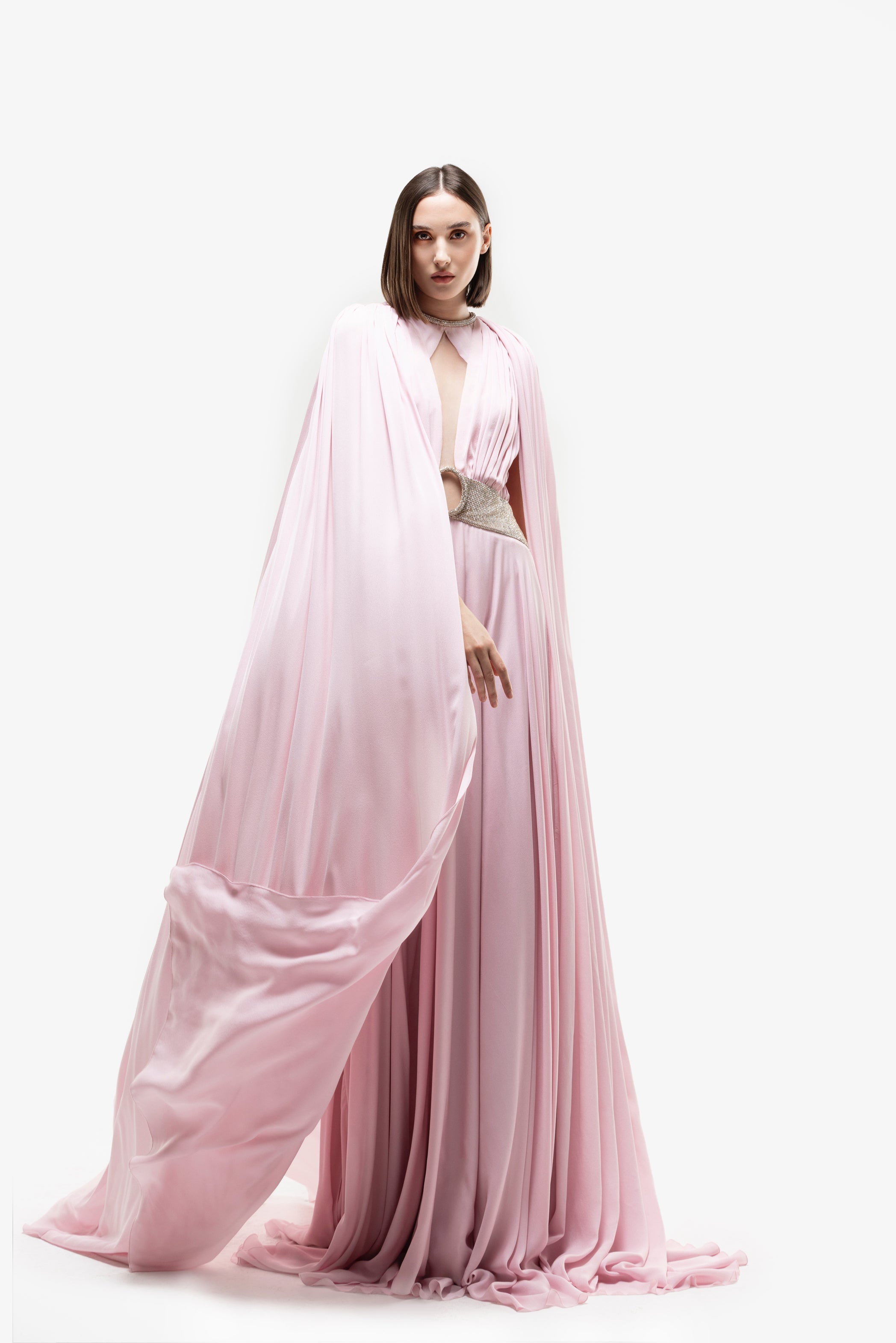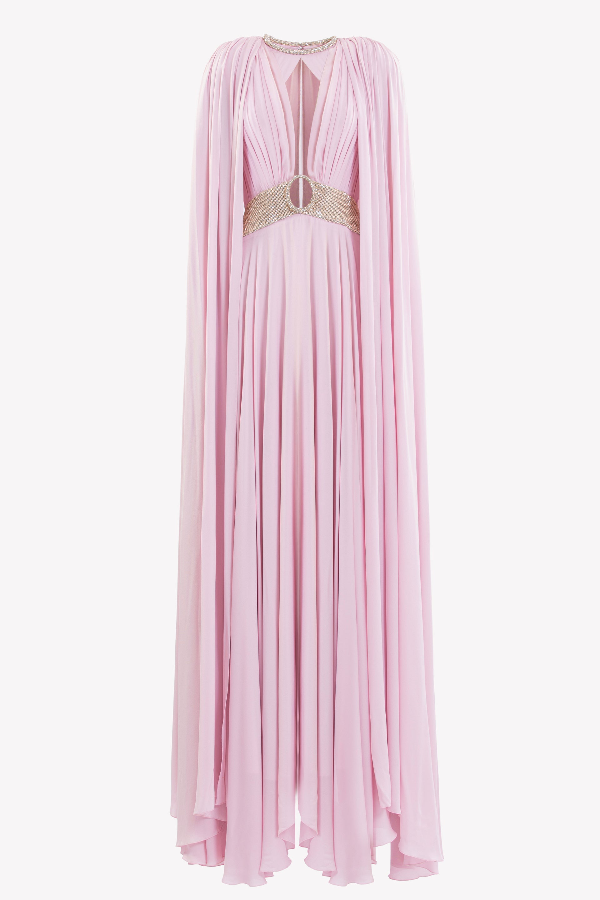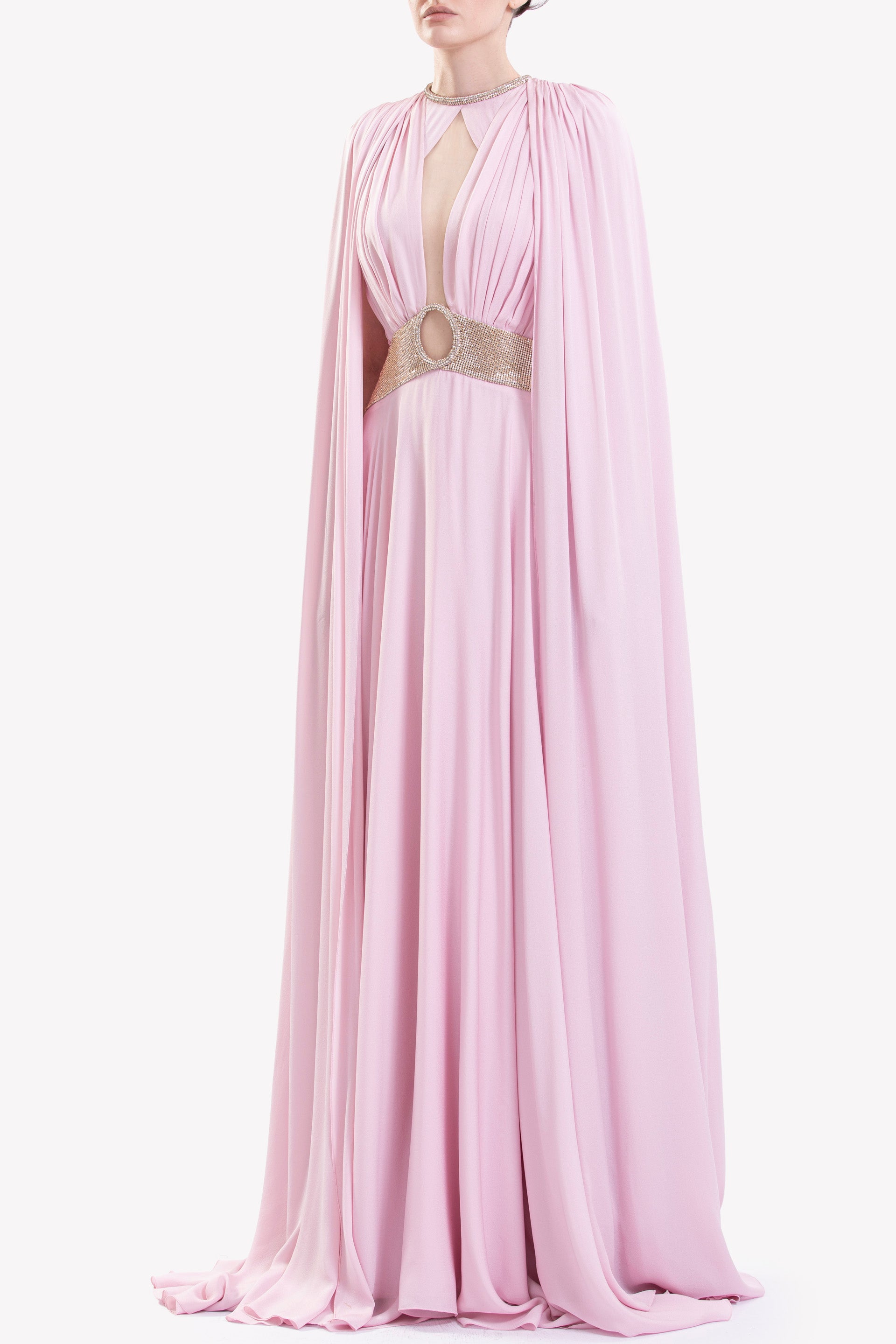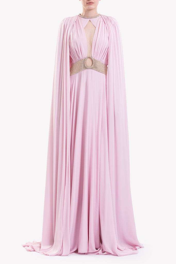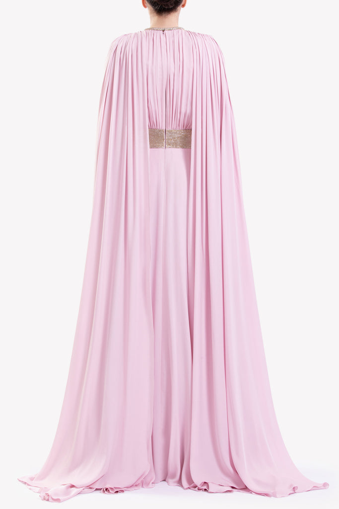 فستان Salsa Rosa من الكريب الجورجيت Salsa Rosa بفتحة عنق مطرزة ولمسات مطوية ومطوية على الصدر وحزام مطرز بفتحة بيضاوية في المنتصف. يتميز بكاب مرفق ينسدل من الأكتاف. ينسدل إلى تنورة بطول الأرض.