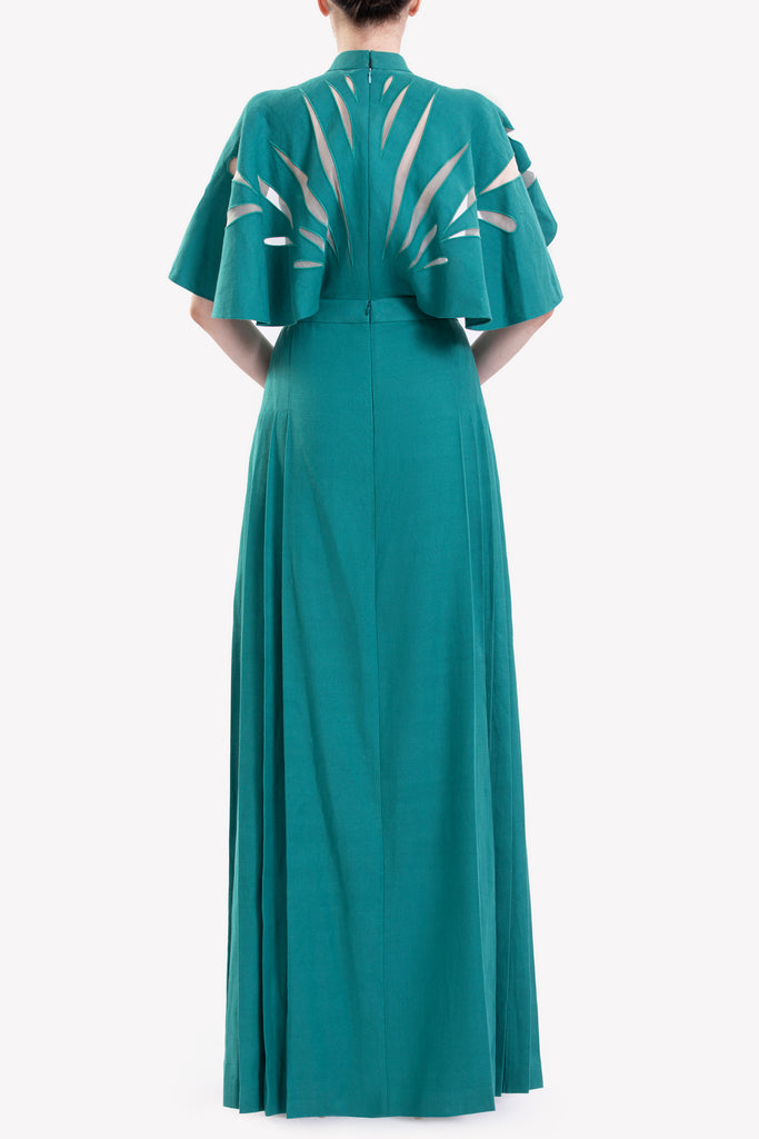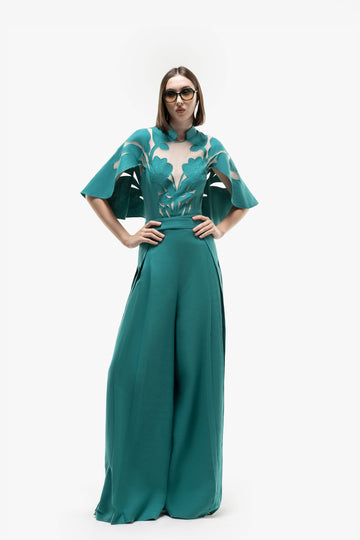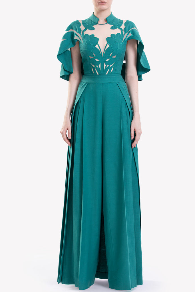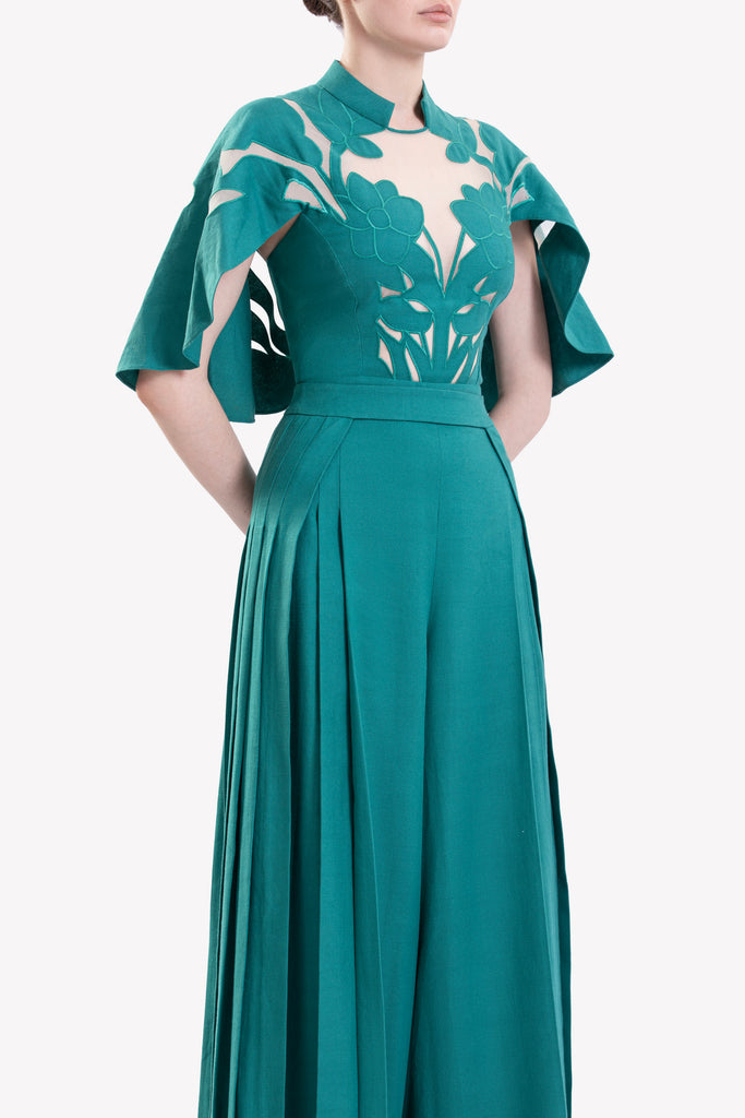جمبسوت من كتان بحر الشمال بفتحة رقبة عالية وبنطلون بكسرات واسعة الساقين. يتميز الصدّار بتطريزات زهور جريئة مطرزة بفتحات تمتد إلى أكمام قصيرة تشبه الكاب ومشدودة عند الخصر. ويزدان بتنورة فوقية مطابقة من بحر الشمال.