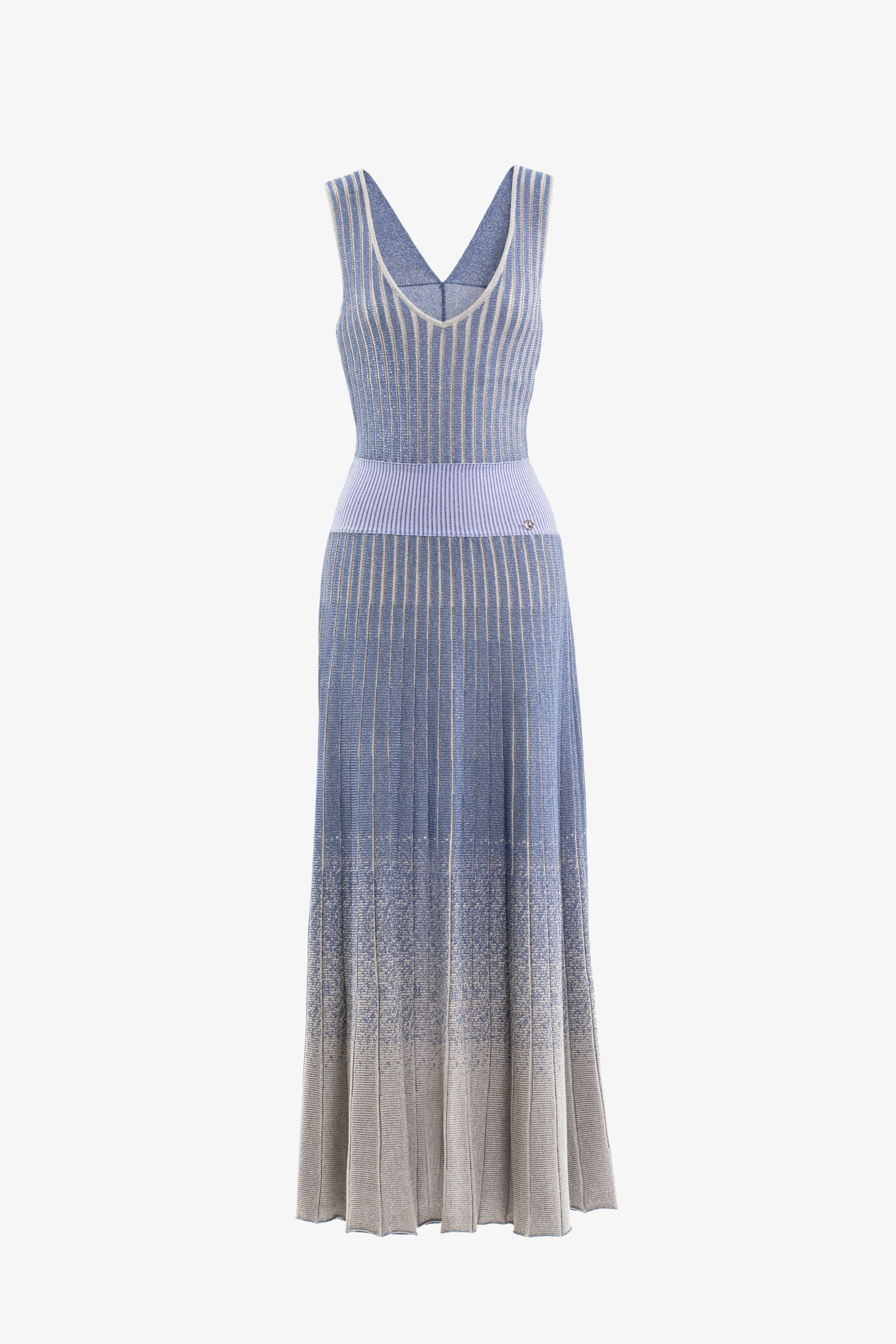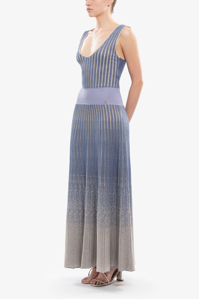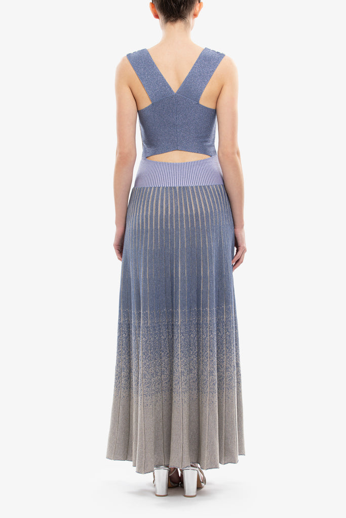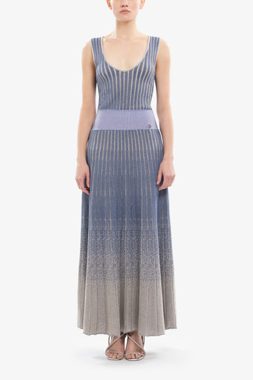 قطعة مارلن محبوكة متوسطة الطول بياقة على شكل V وتصميم بلا أكمام وشريط مطاطي منخفض الخصر. تظهر التنورة ذات القصّة المستقيمة بتأثير تحلل مذهل، وتنتقل بأناقة من المارلن إلى اللون العاجي، وتزدان بشعار SK على الخصر لإضفاء لمسة نهائية راقية.