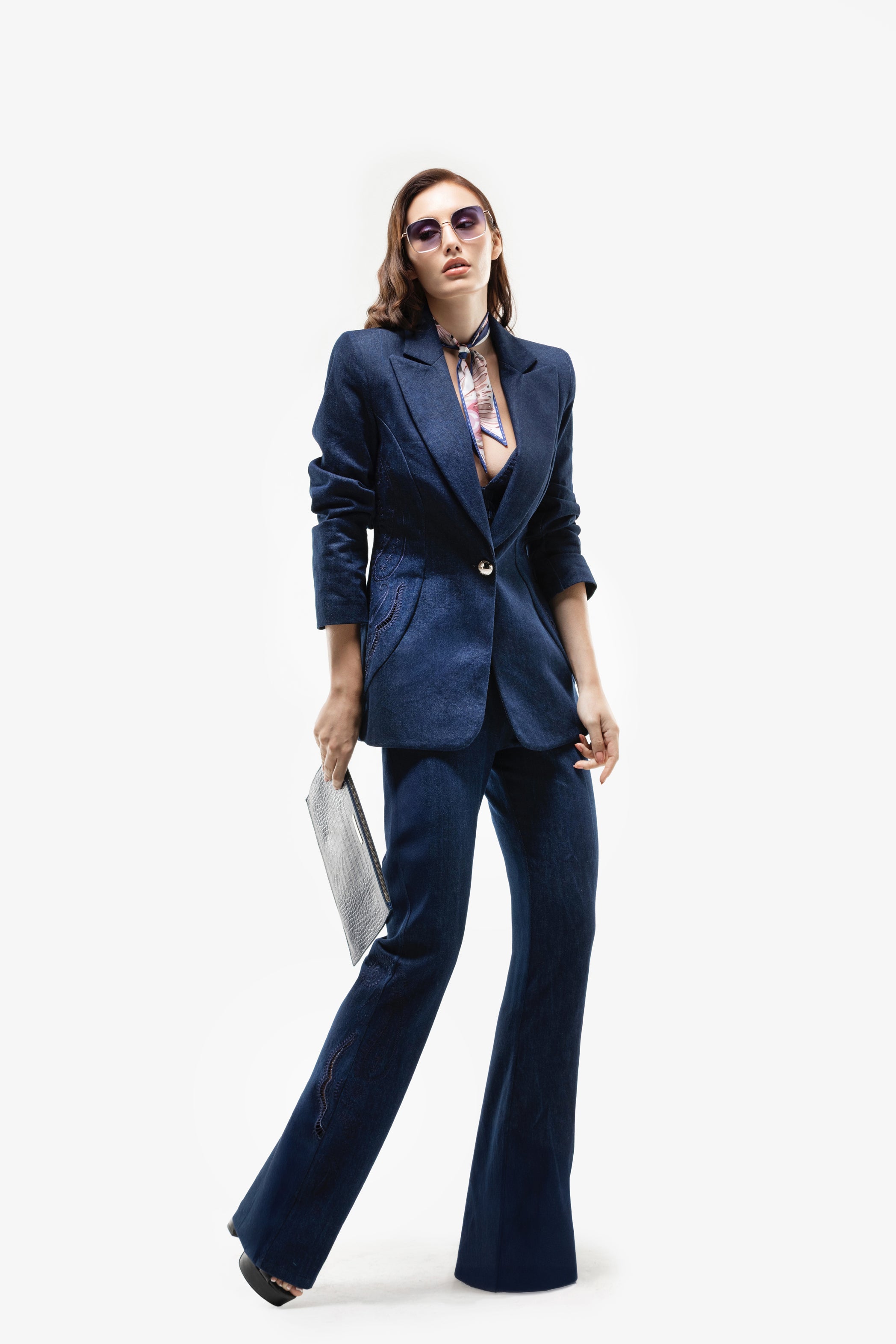يتميز هذا الجاكيت المصمم من الدنيم بتصميم أنيق وضيّق يمتد أسفل الورك مباشرة لإطلالة أنيقة. يبرز بتطريزات جانبية رقيقة مثقوبة، ويجمع بين الهيكل الكلاسيكي والتفاصيل الفنية الدقيقة. يُعد هذا الجاكيت مثاليًا لإضافة لمسة راقية إلى خزانة ملابسك، حيث يضفي لمسة عصرية راقية على إطلالتك.