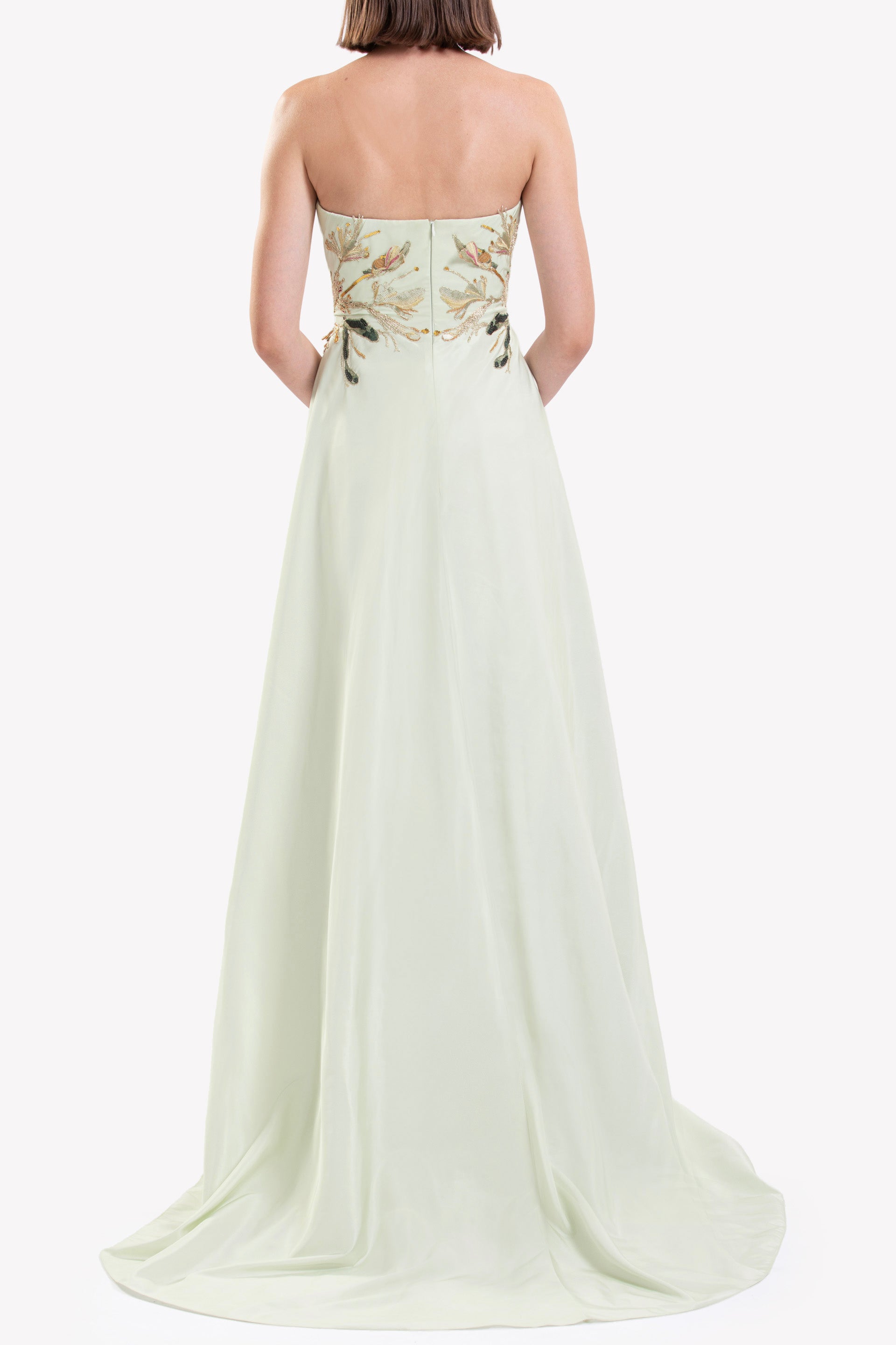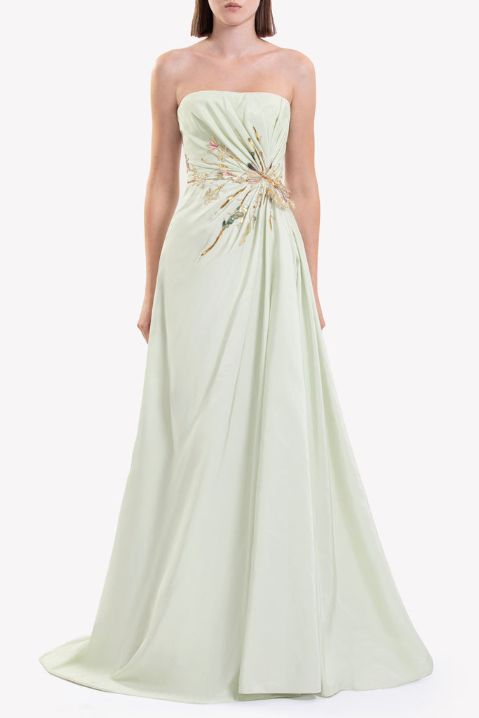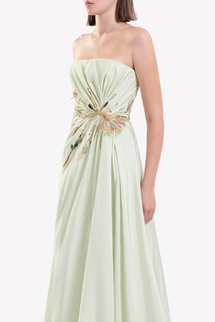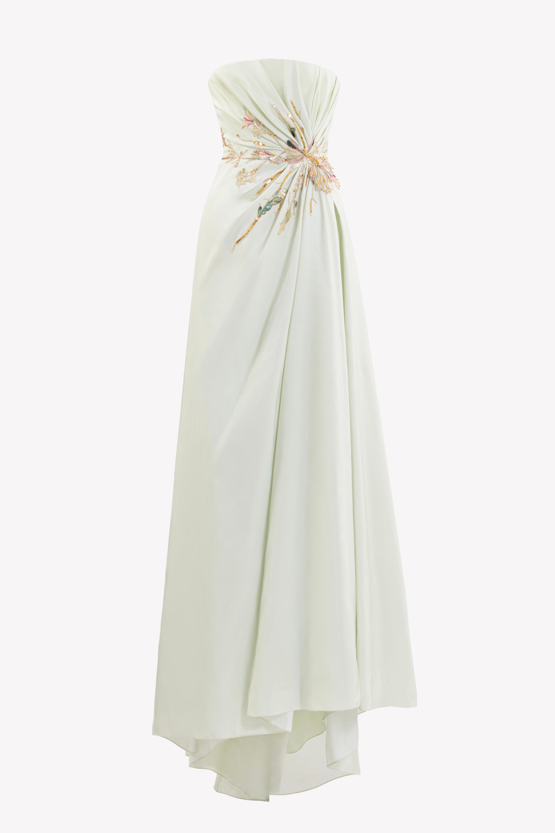 فستان من قماش التفتا من الريد مع تقويرة بدون حمالات وثنيات بارعة على الصدر، مزين بتطريزات ملونة، وينتهي بتنورة بطول الأرض تتميز بفتحة عالية.