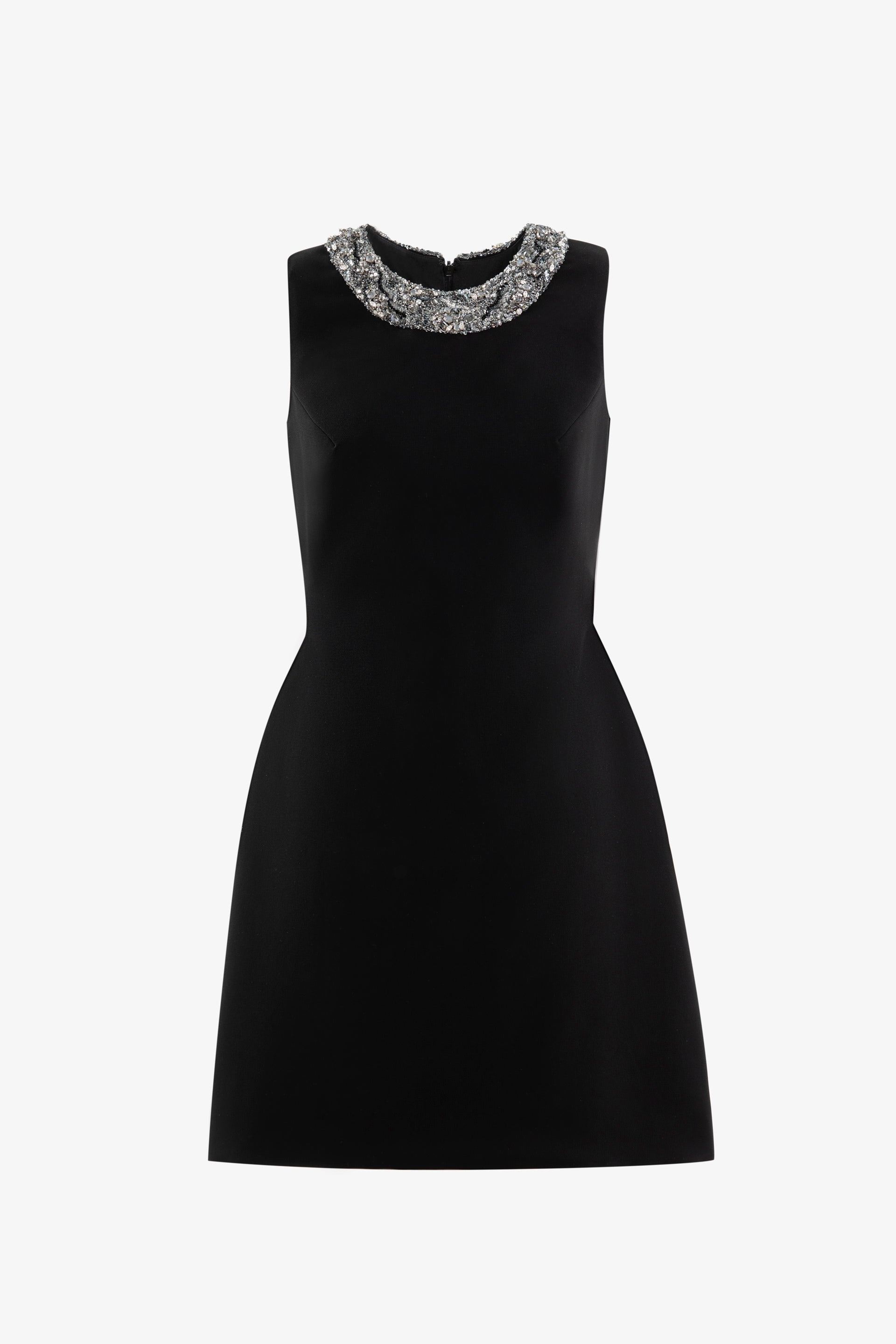 فستان قصير من الكريب الأسود الداكن مع تقويرة مزخرفة ومطرز بشكل معقد بالترتر واللؤلؤ والخرز باللونين الفضي والأنثراسيت.