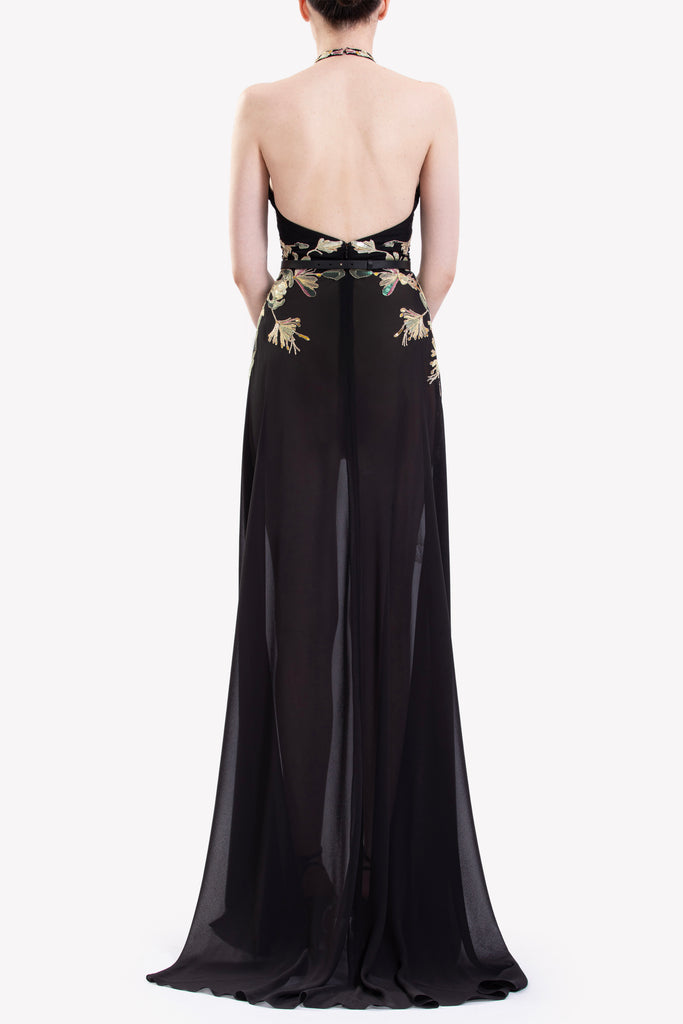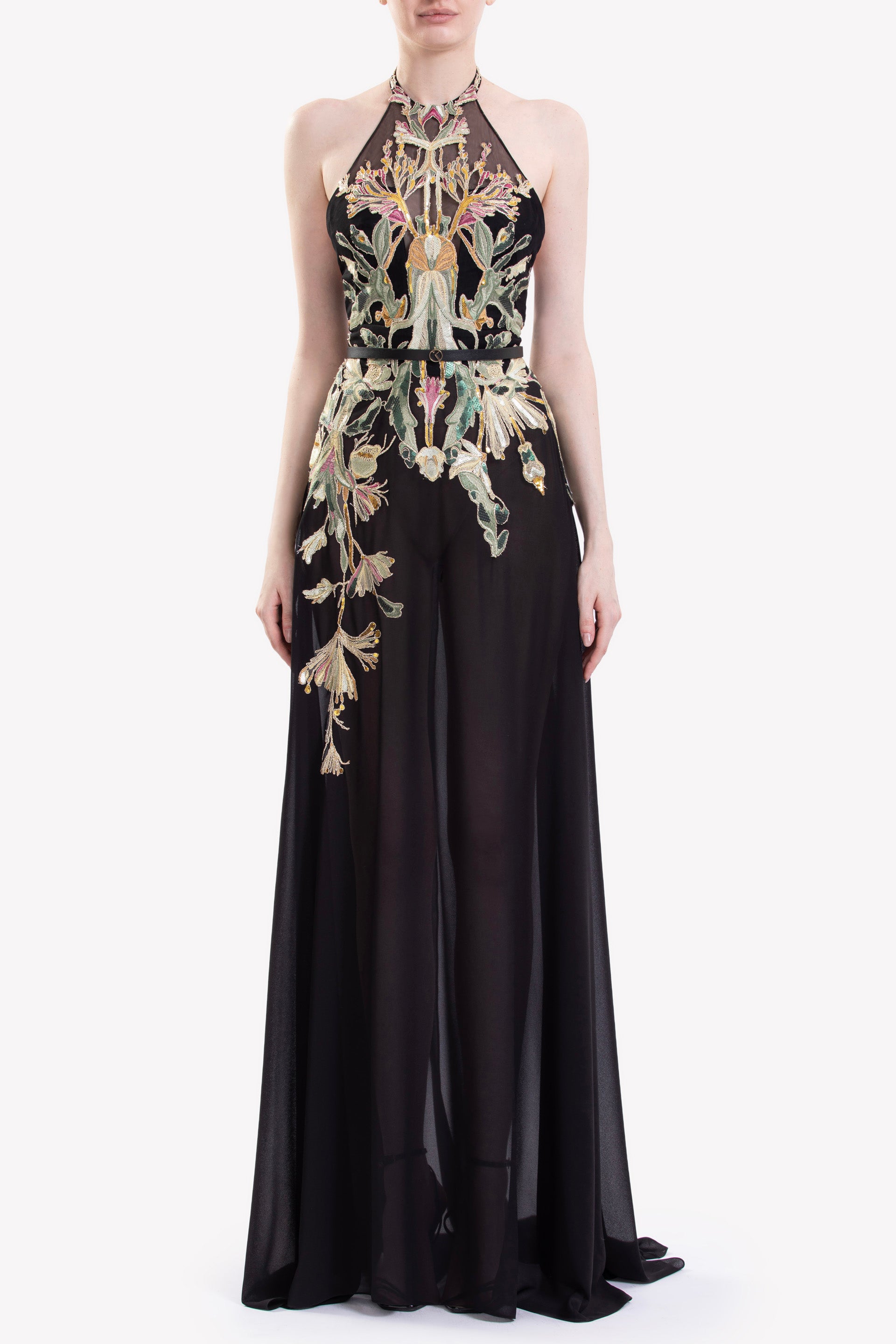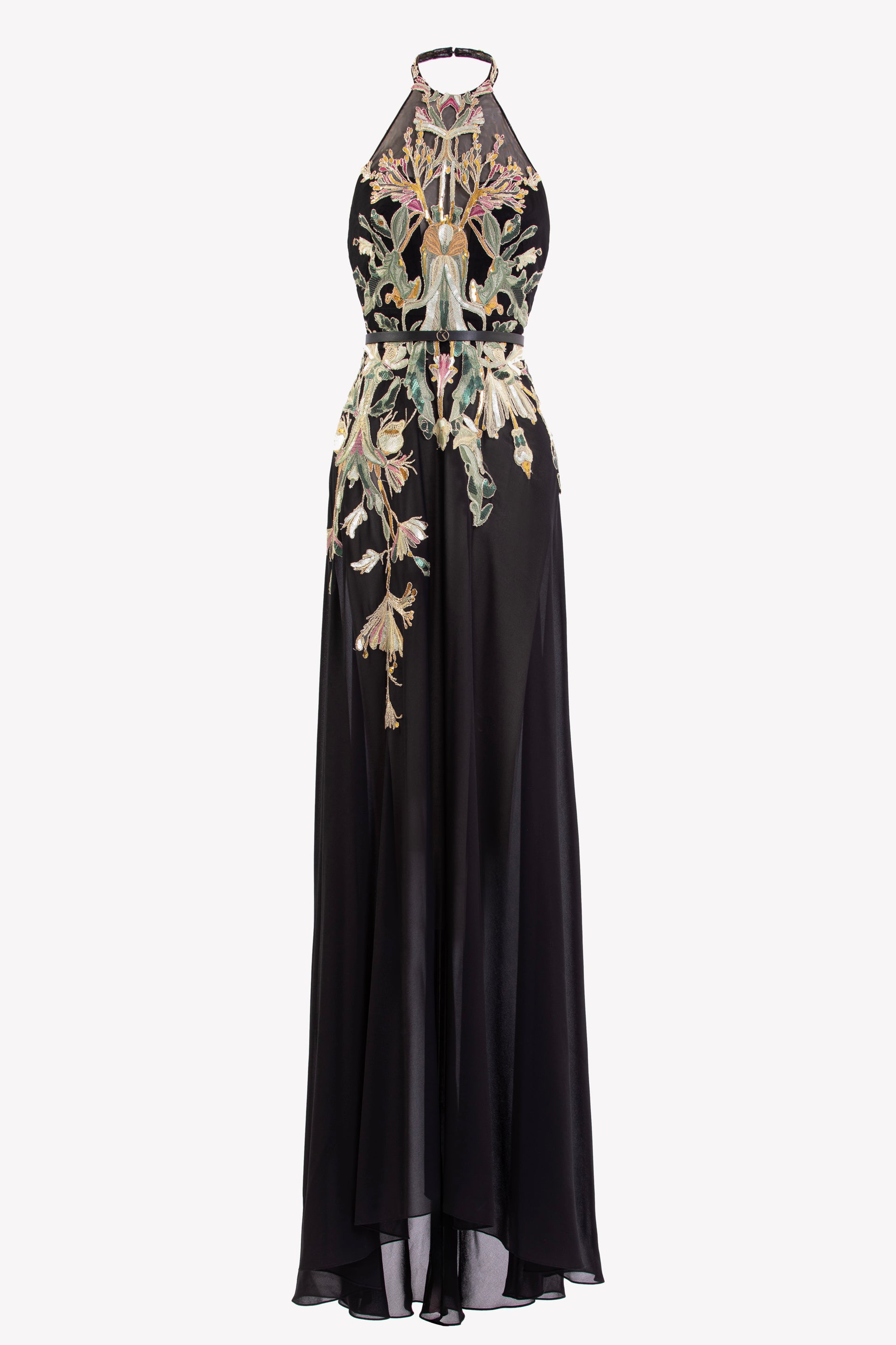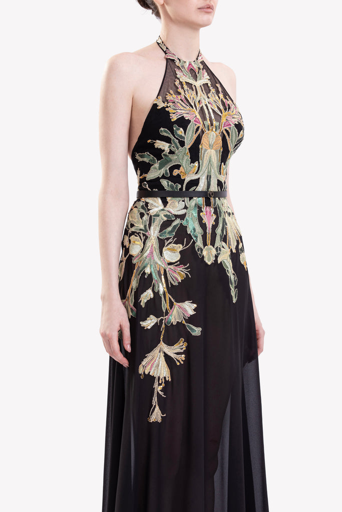 فستان كريب جورجيتي من الكريب الأسود الداكن مع تقويرة على شكل طوق وصدّار شفاف، ويتميز بتطريزات زهور متعددة الألوان متداخلة من الأمام. تنسدل التنورة بطول الأرض بطبقات انسيابية ناعمة.