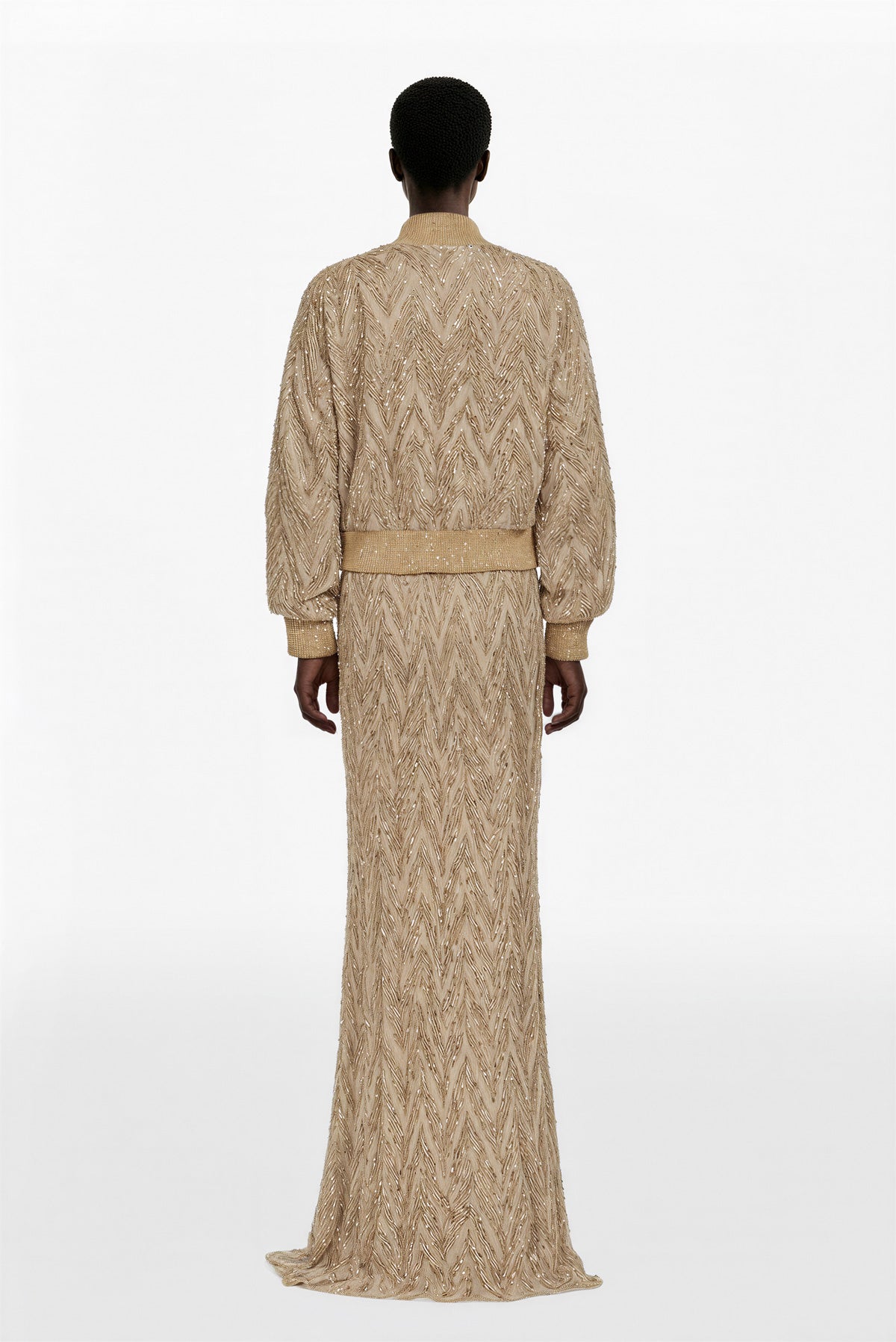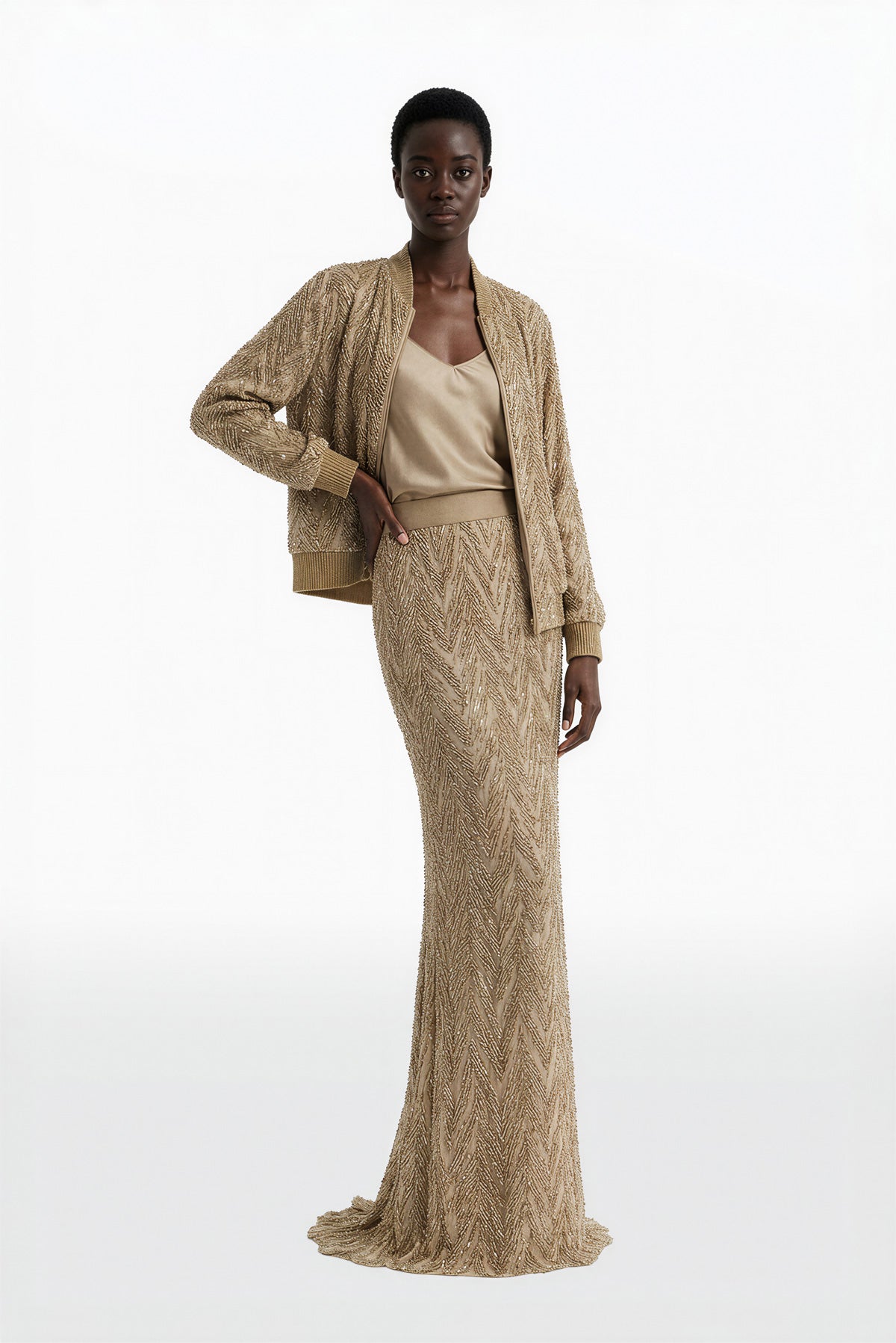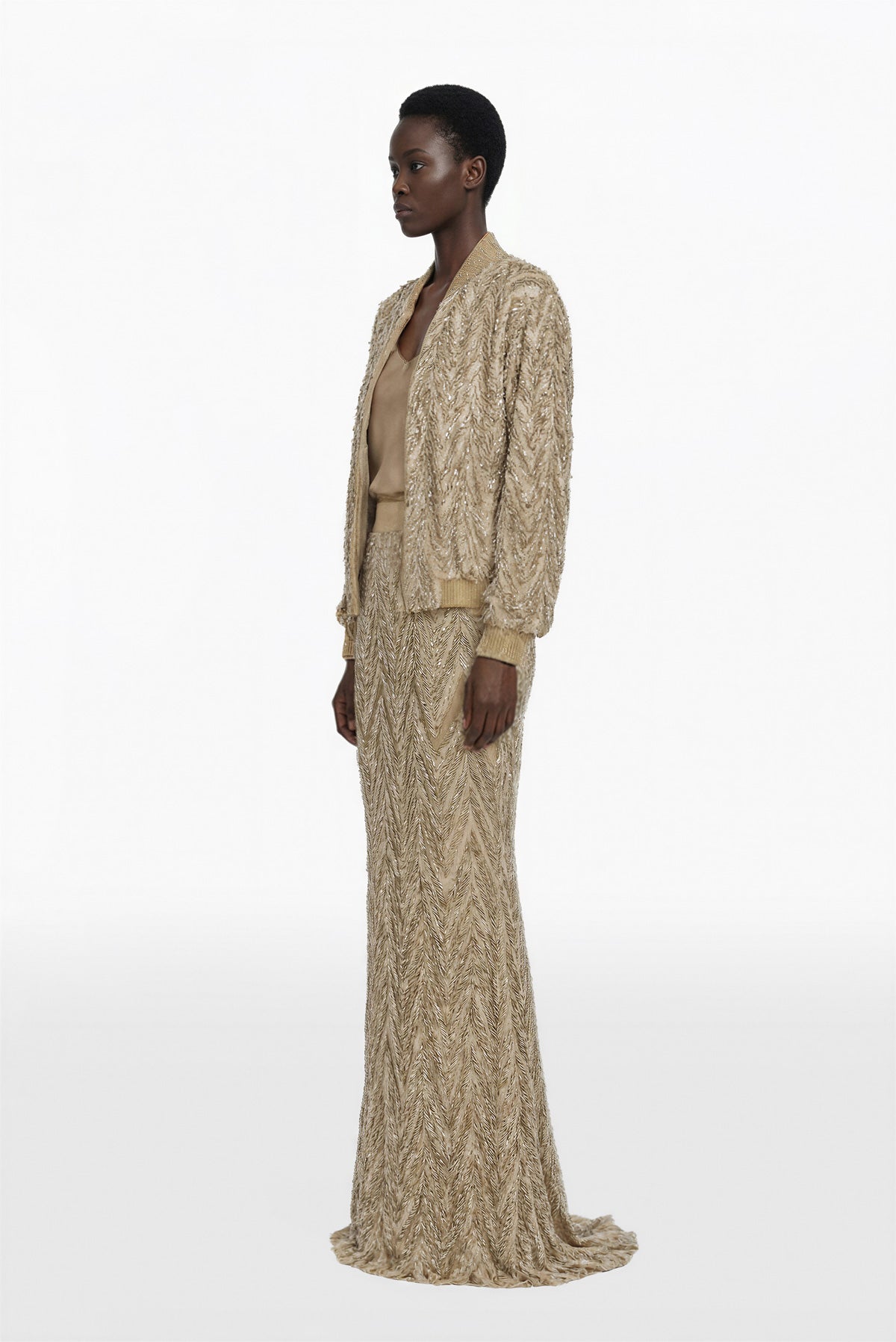 جاكيت مريح من قماش مطرز بالخرز بلون رمل مبيض، يتميز بنمط شيفرون ومزين بحواف مضلعة مع تنورة ذات أعمدة من قماش مطرز بالترتر بلون الرمال المبيضة بنمط شيفرون مع خط ممدود وذيل خلفي قصير مقترن بـ بلوزة من الساتان الكريب بلون رمل مبيض.