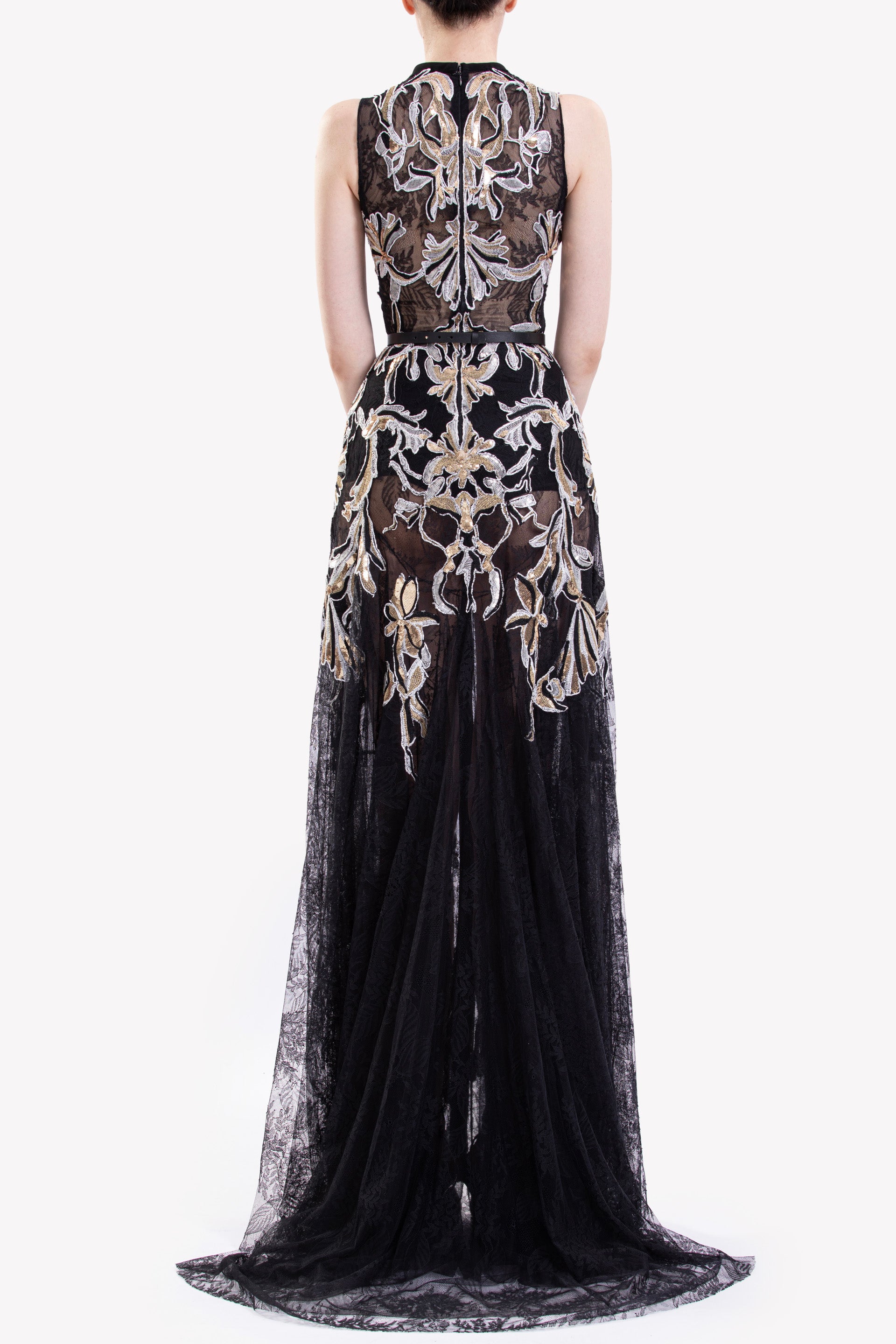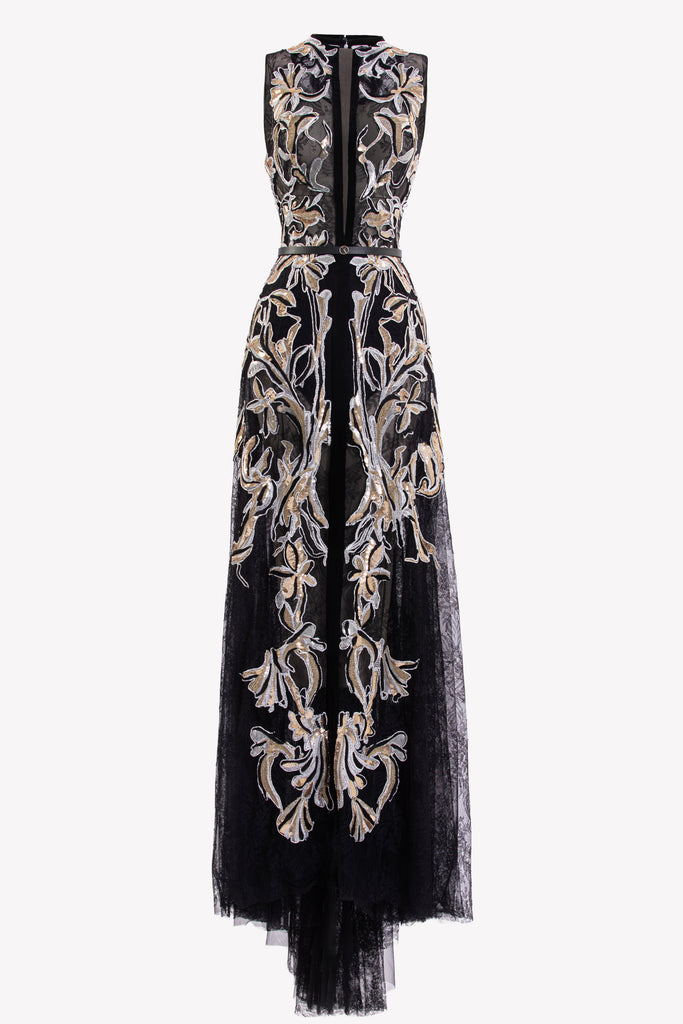 فستان من الدانتيل الأسود الداكن مع تقويرة مكشوفة وياقة قائمة وقصّة بدون أكمام وقصّة بطول الأرضية، ويتميز بتطريزات ذهبية وفضية معقدة بنقوش زهور جريئة تنسدل على التنورة فوق قاعدة شفافة.
