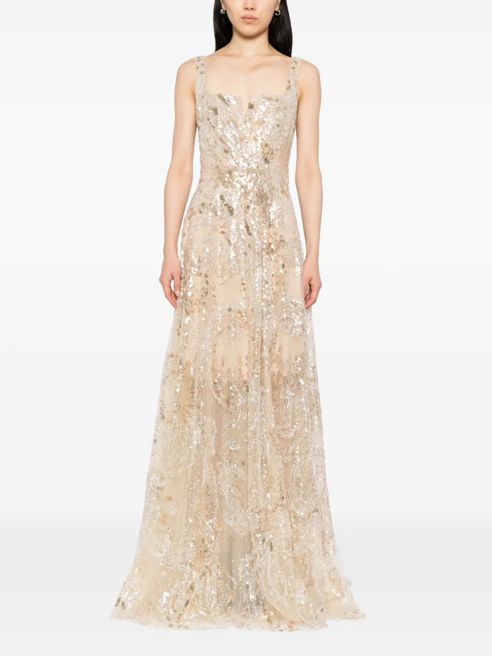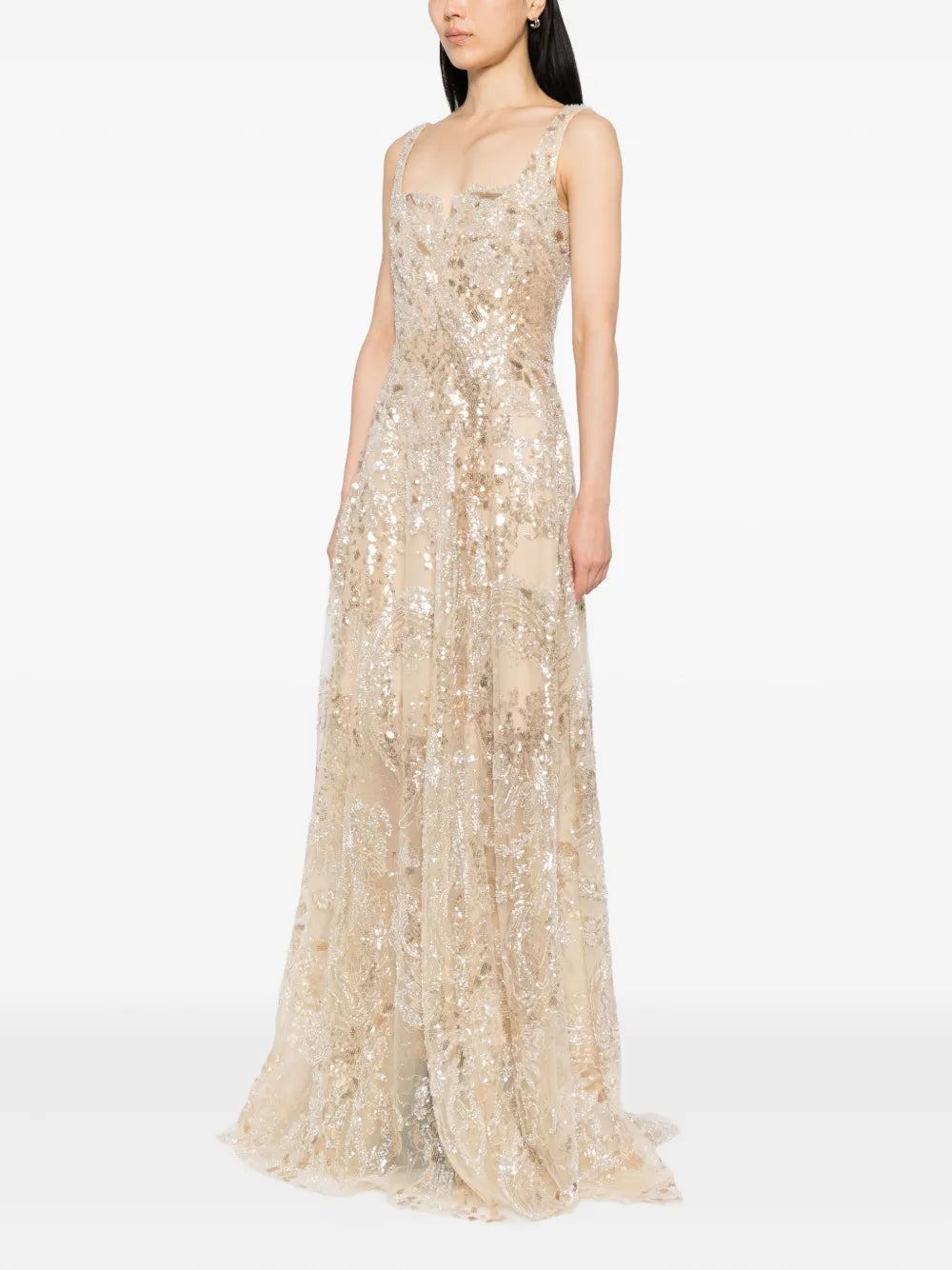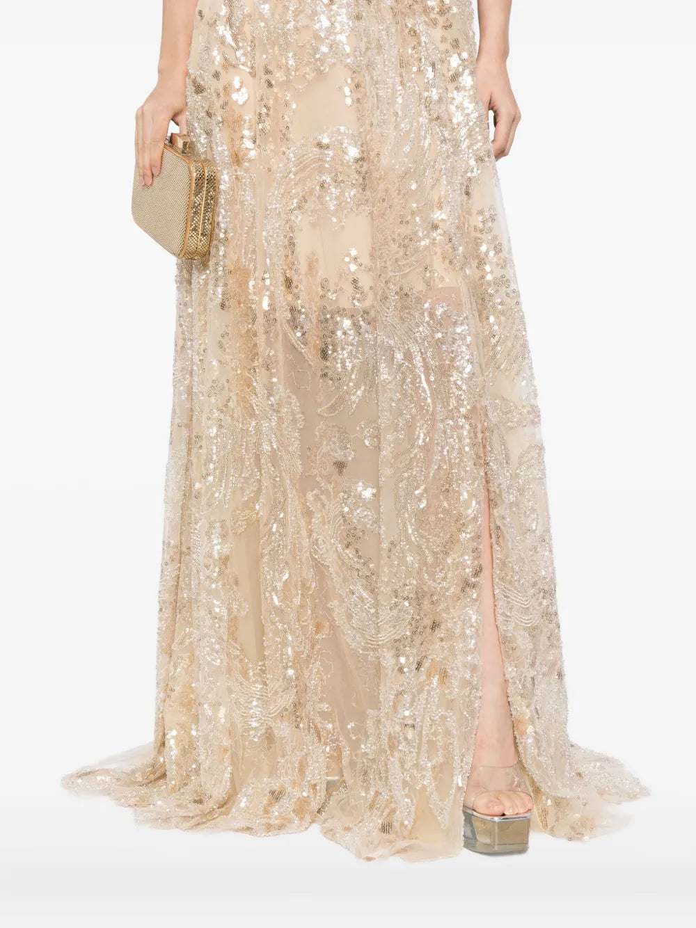 فستان أصفر مطرز بالتطريز الكمثري الأصفر بطول الأرض يتميز بنمط معقد من الكمثري الأصفر والترتر الفضي. يتميز الفستان بتفاصيل صغيرة على شكل حرف V على الصدر وفتحة عالية على التنورة.