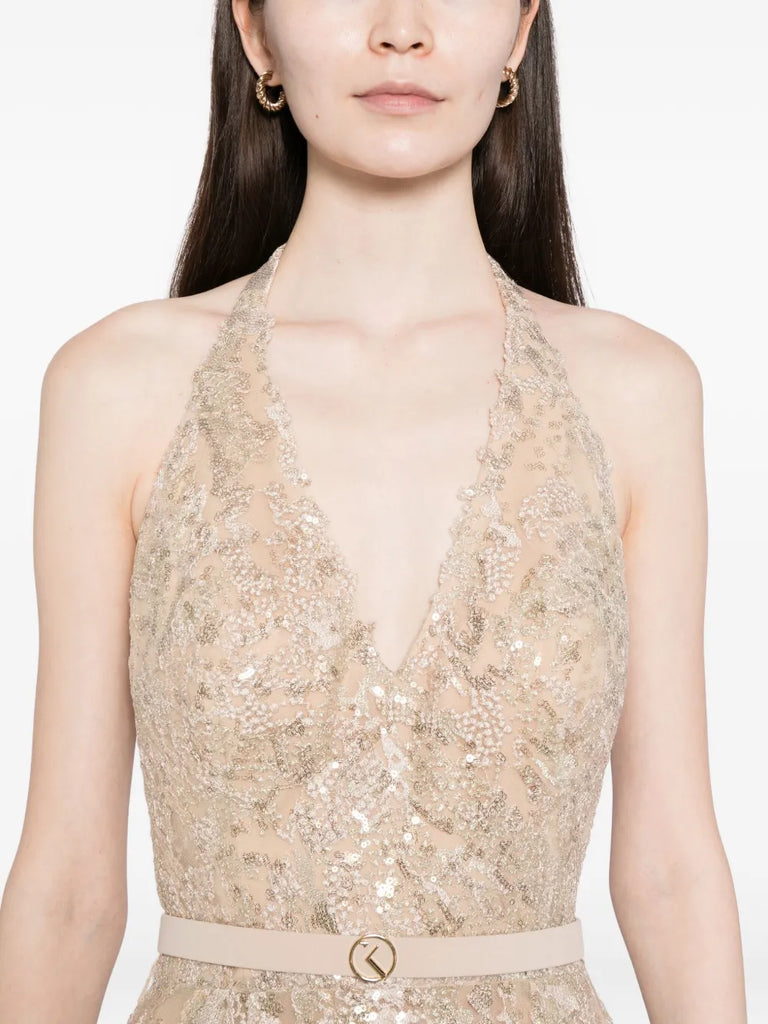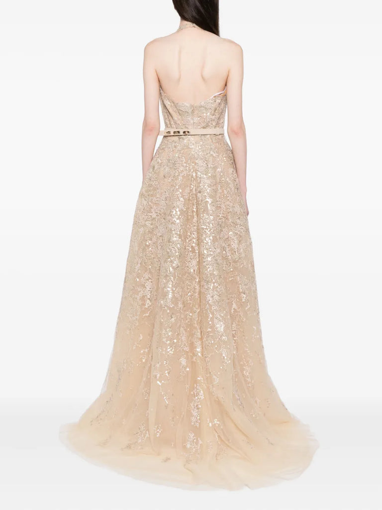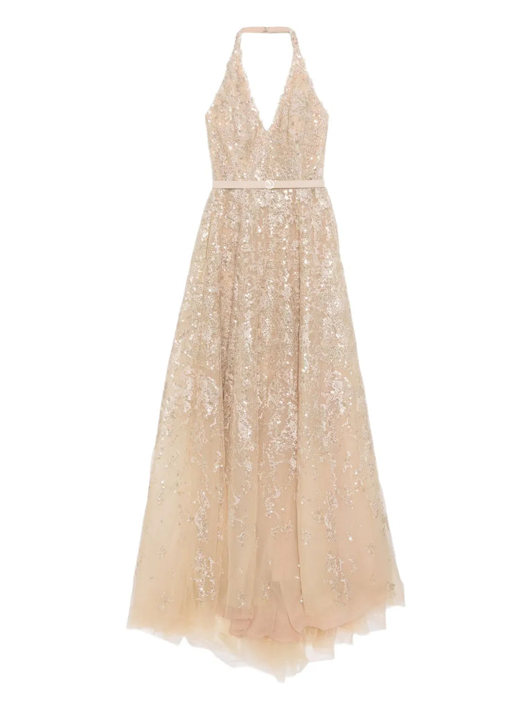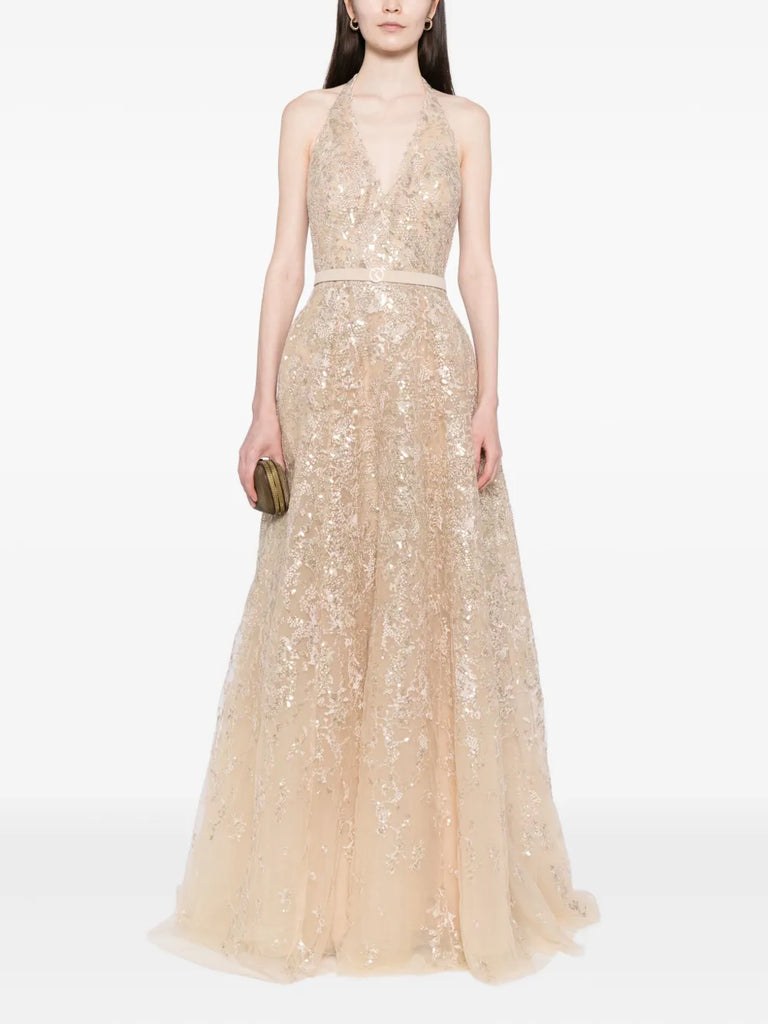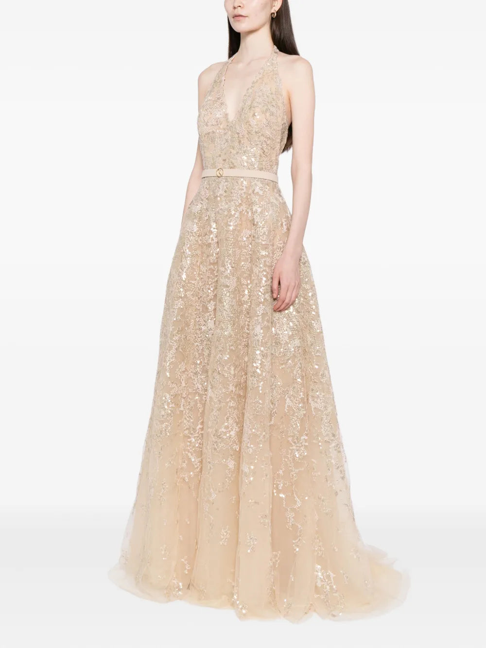 فستان أصفر طويل مطرز بالكامل على شكل كمثرى أصفر مع تنورة على شكل حرف A وياقة عميقة على شكل V. الفستان مطرز بشكل معقد بخيوط الكمثرى الصفراء والترتر ويتضمن جيوب مريحة. يقترن مع حزام الكمثرى الأصفر SK.