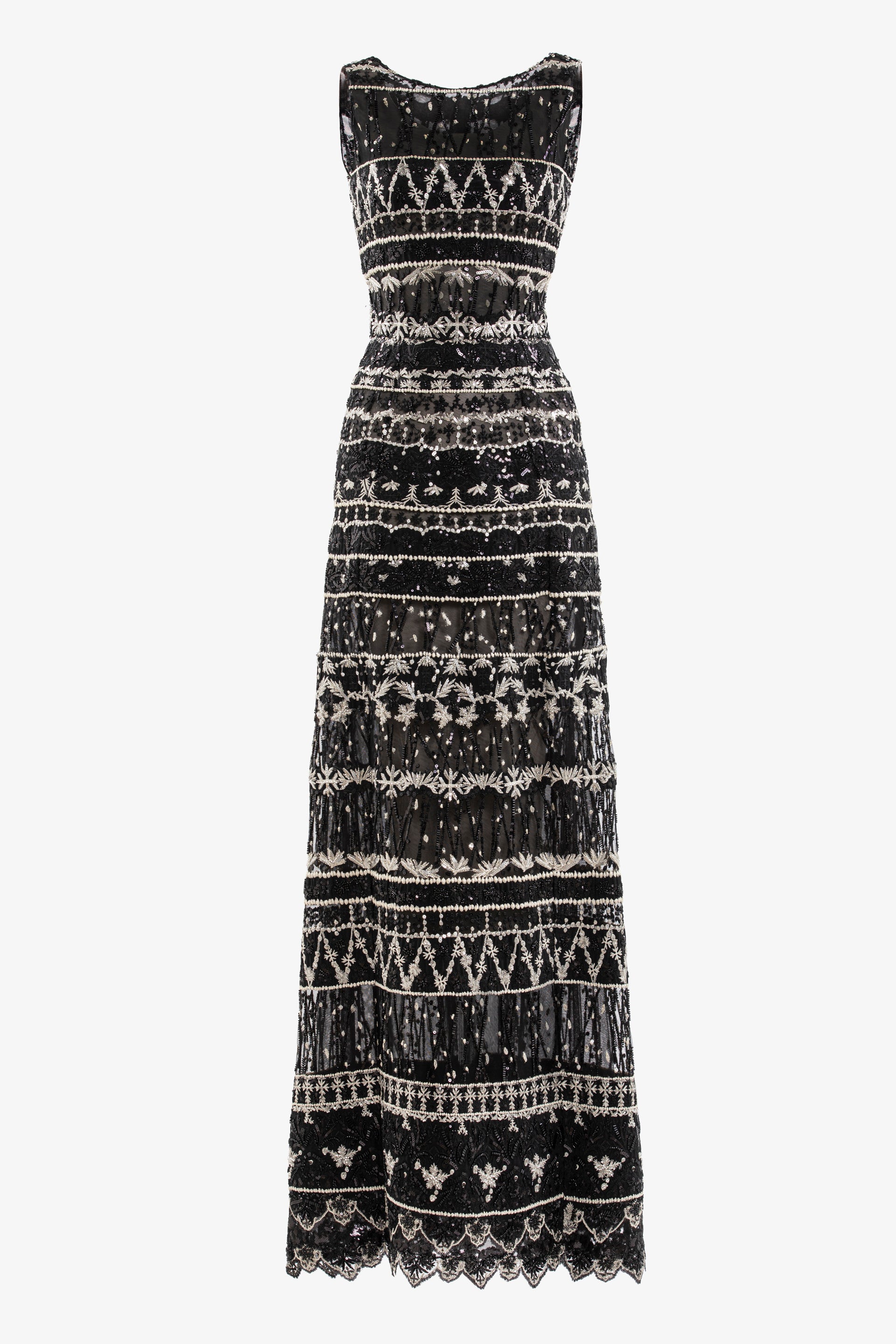 فستان من التول الأسود الفاحم مزين بالخرز مع خط رقبة على شكل قارب، يتميز بتصميم معقد من الخرز والزخارف المصنوعة من الخيوط والخرز والترتر باللون الأسود الفاحم والأبيض المائل للرمادي، مع عباءة كبيرة من التفتا الأسود الفاحم.