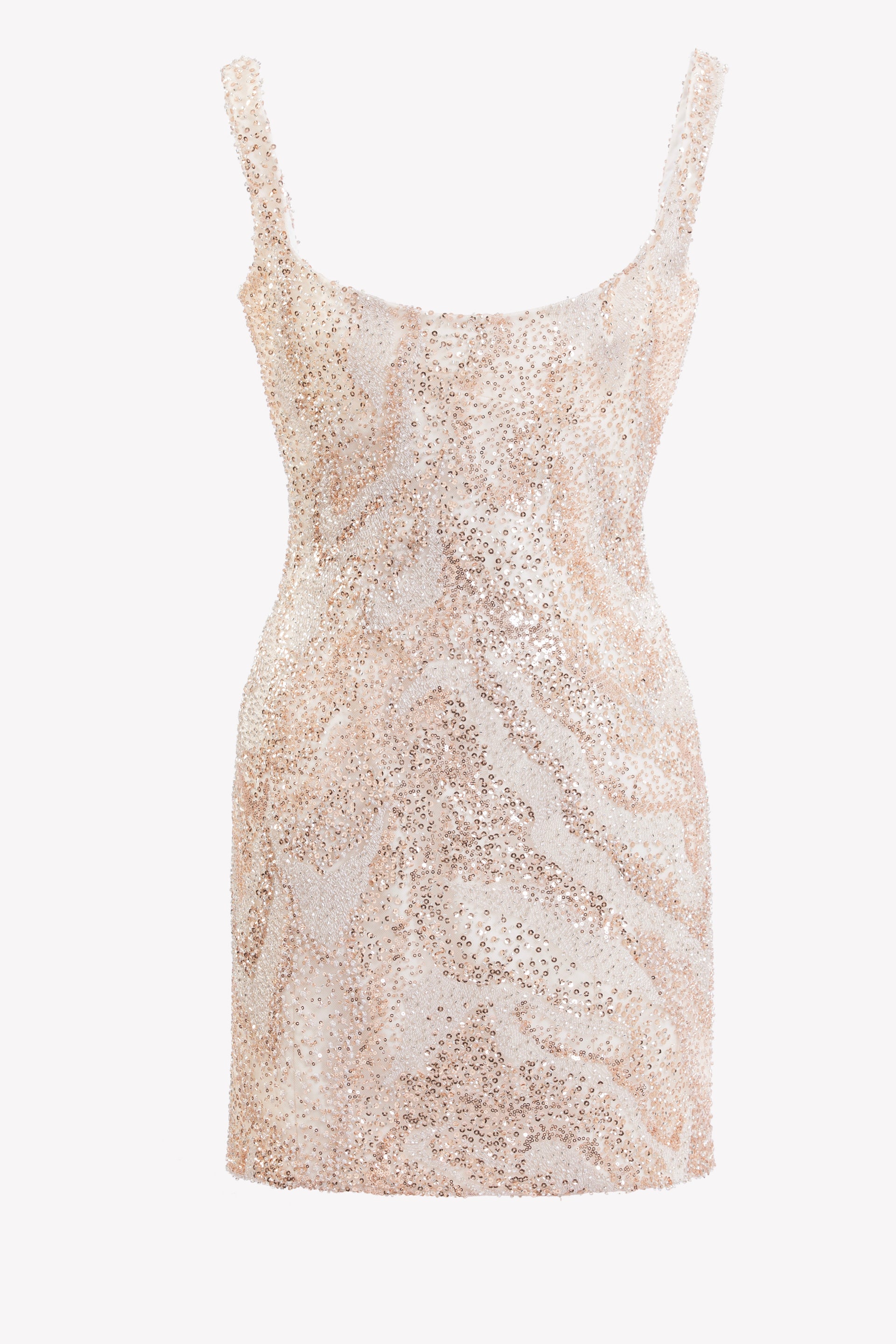 فستان قصير ذهبي فاتح بياقة مربعة وتطريزات على كامل الفستان ووشاح ملون متناسق عند الرقبة.