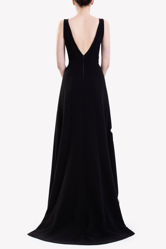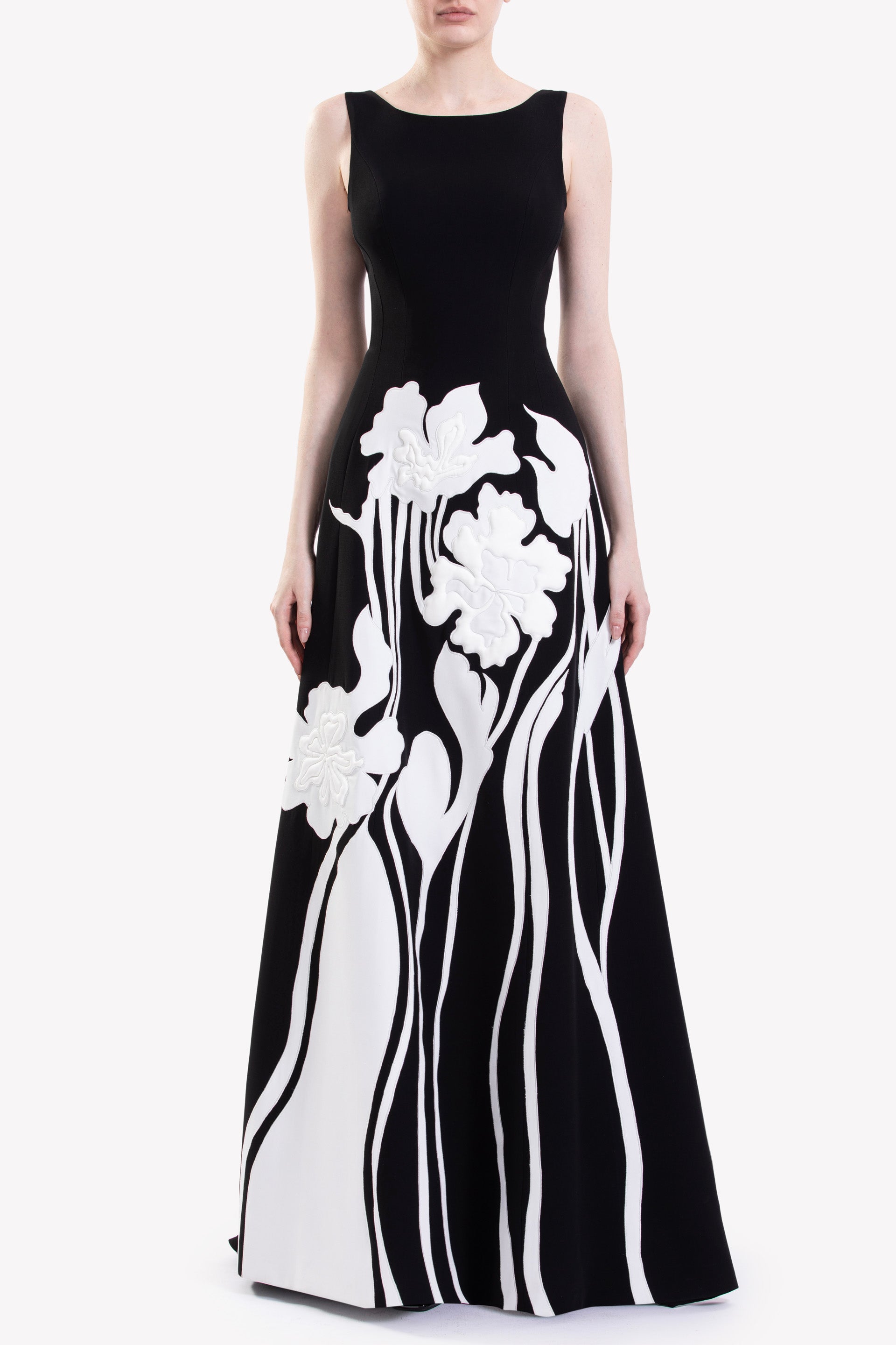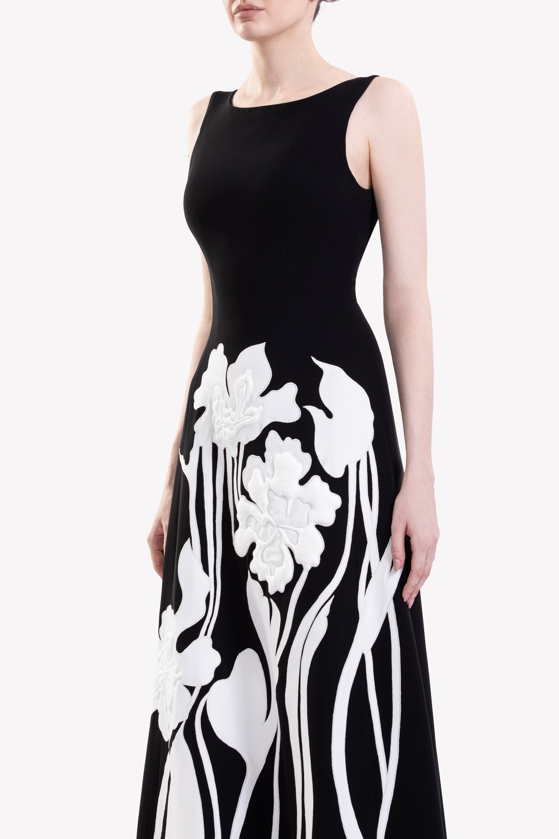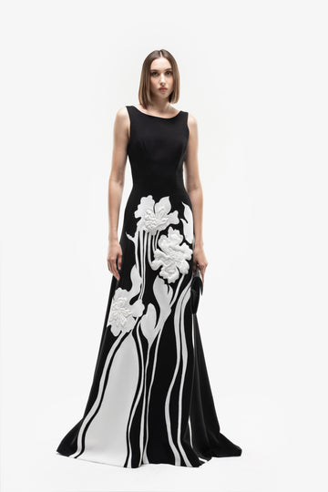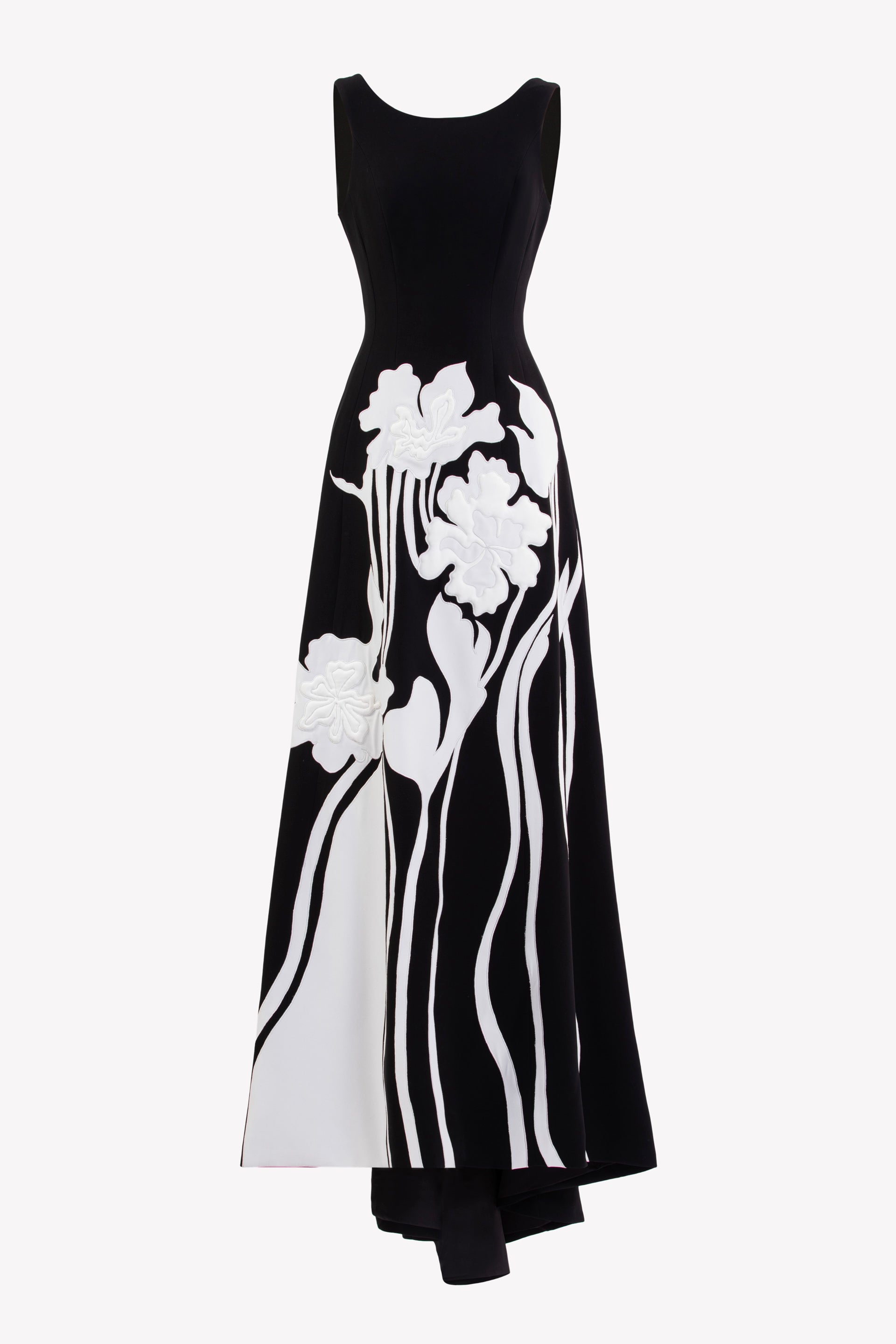 فستان من الكريب الأسود الداكن بقصّة ضيّقة بدون أكمام وقصّة ذات شكل هرمي بطول الأرضية، ويتميز بتطريز زهور بيضاء كبيرة الحجم مع تطريزات زهور بيضاء معززة بتفاصيل مبطنة لتأثير ثلاثي الأبعاد.