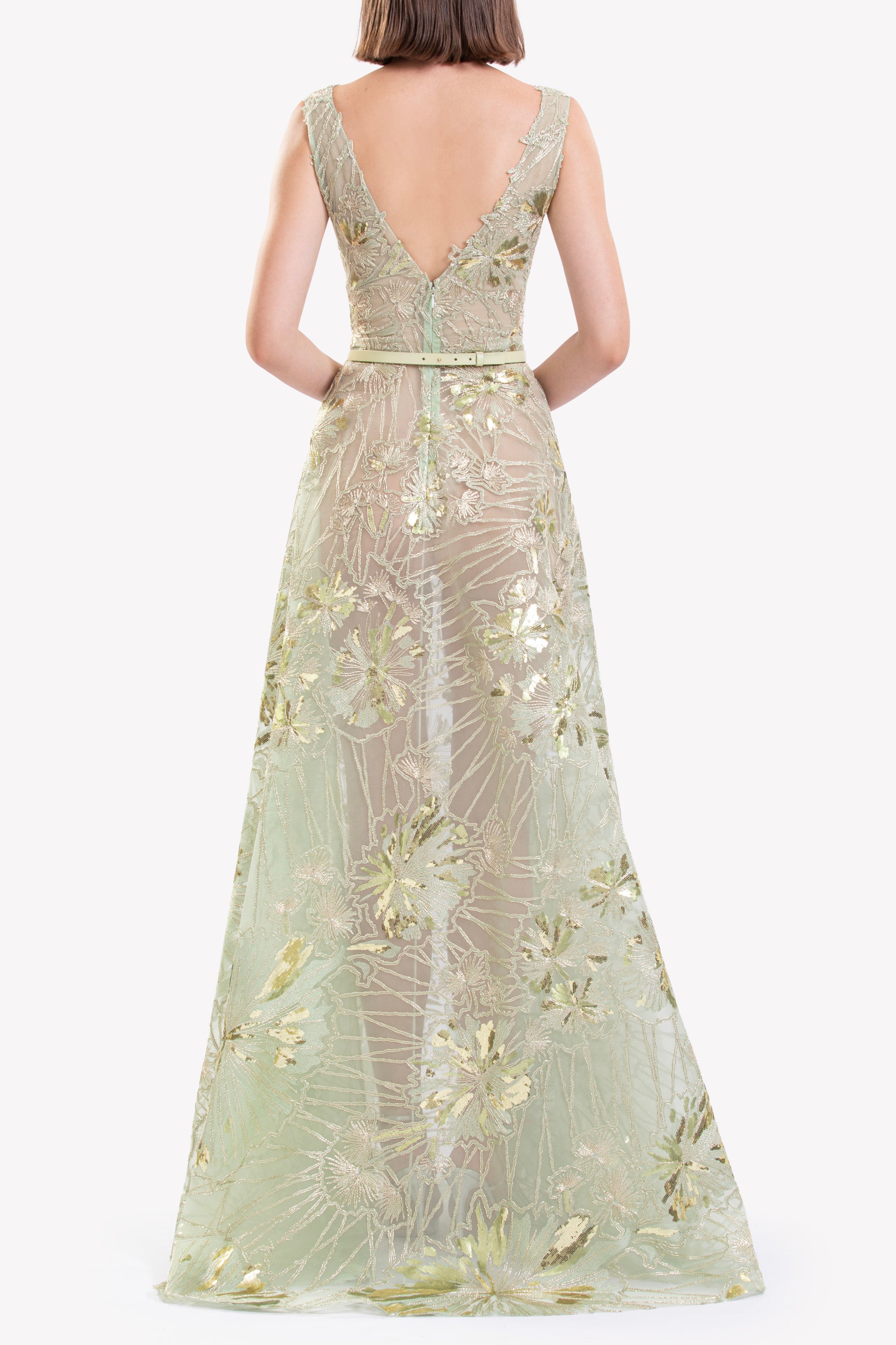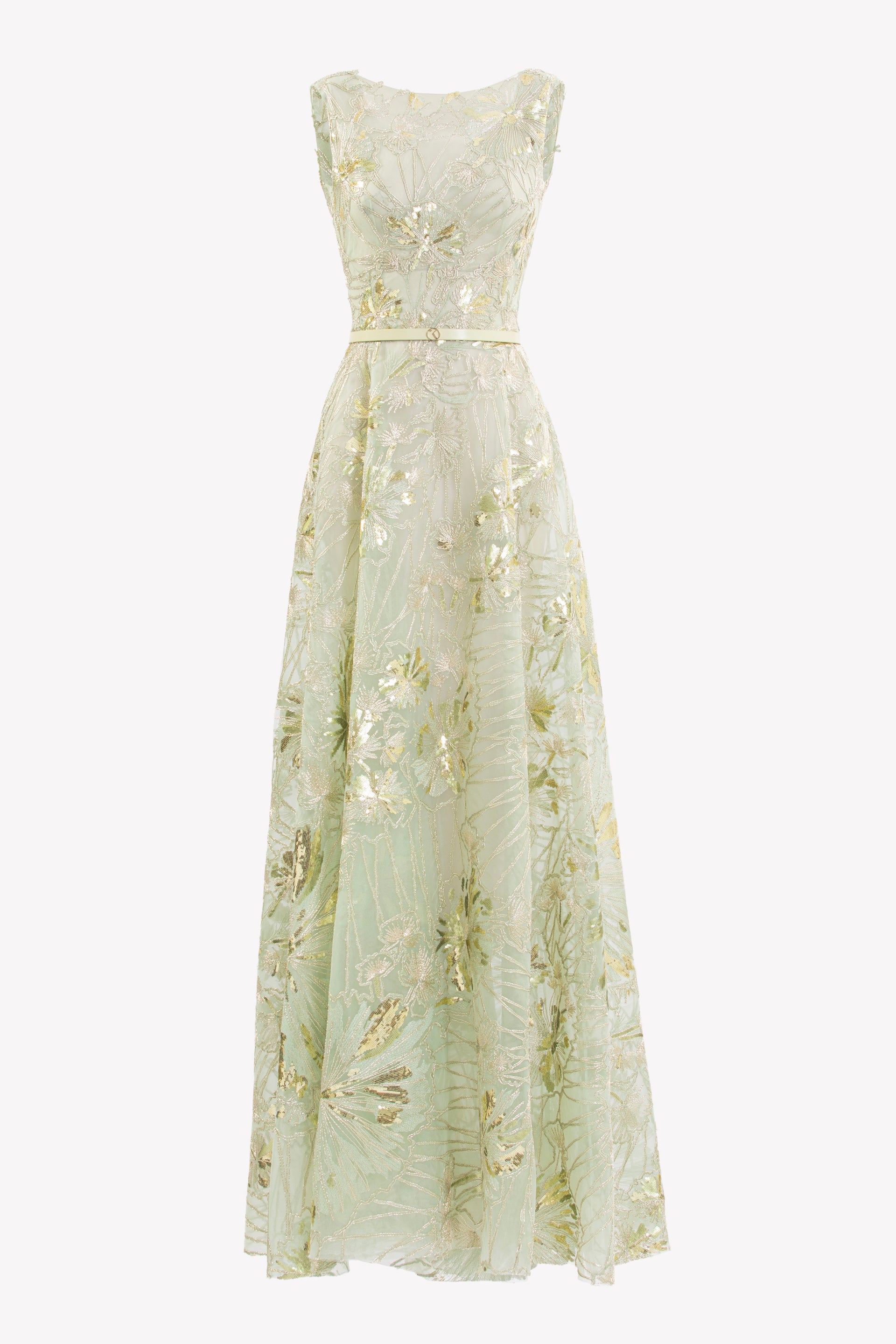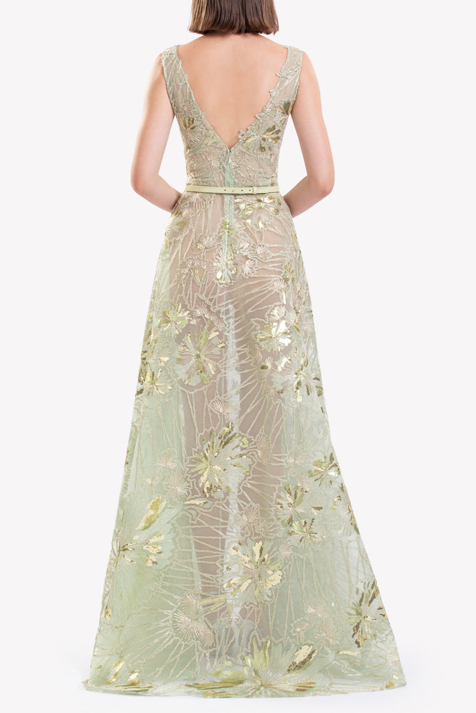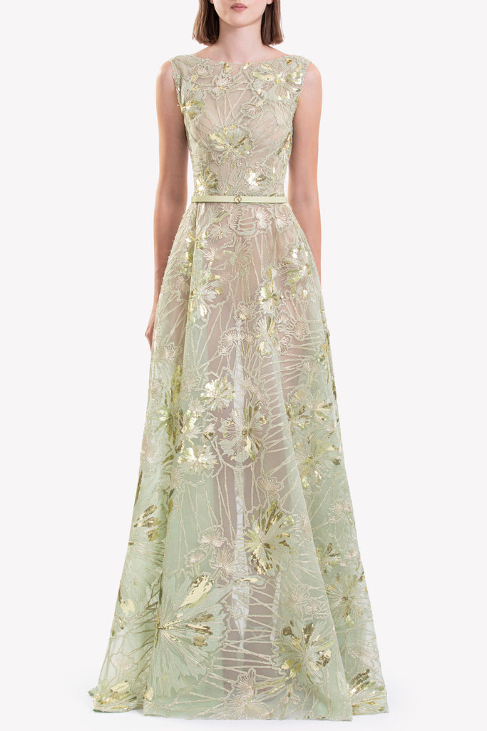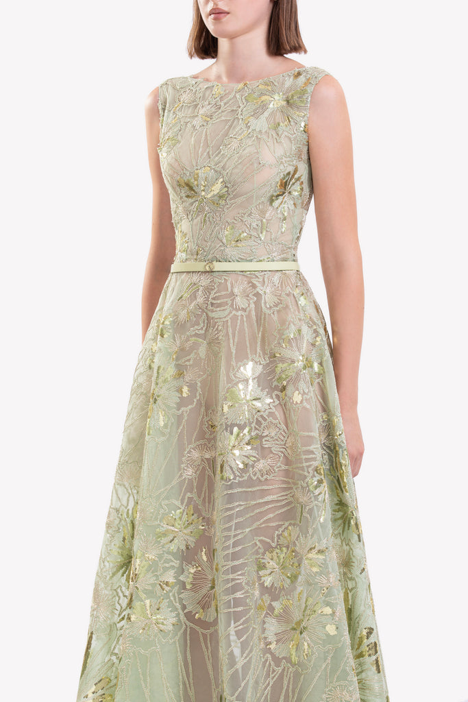 فستان مطرز من قماش التول المطرز من الريد مع تقويرة عريضة بدون أكمام وتنورة انسيابية بطول الأرضية، مزين بتطريزات رقيقة مستوحاة من الهندباء.