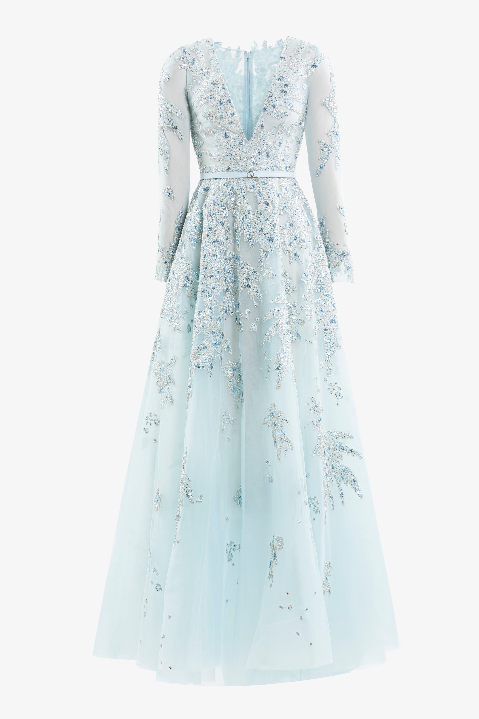 فستان أزرق ثلجي يتميز بياقة عميقة على شكل حرف V وأكمام طويلة وتنورة على شكل حرف A، مطرز بالكامل بتصاميم معقدة باللونين الفضي والأزرق باستخدام مواد مثل الترتر والخرز والكريستال. ويزدان الفستان بأناقة مع حزام SK من الجلد المطابق بنسبة 100%.