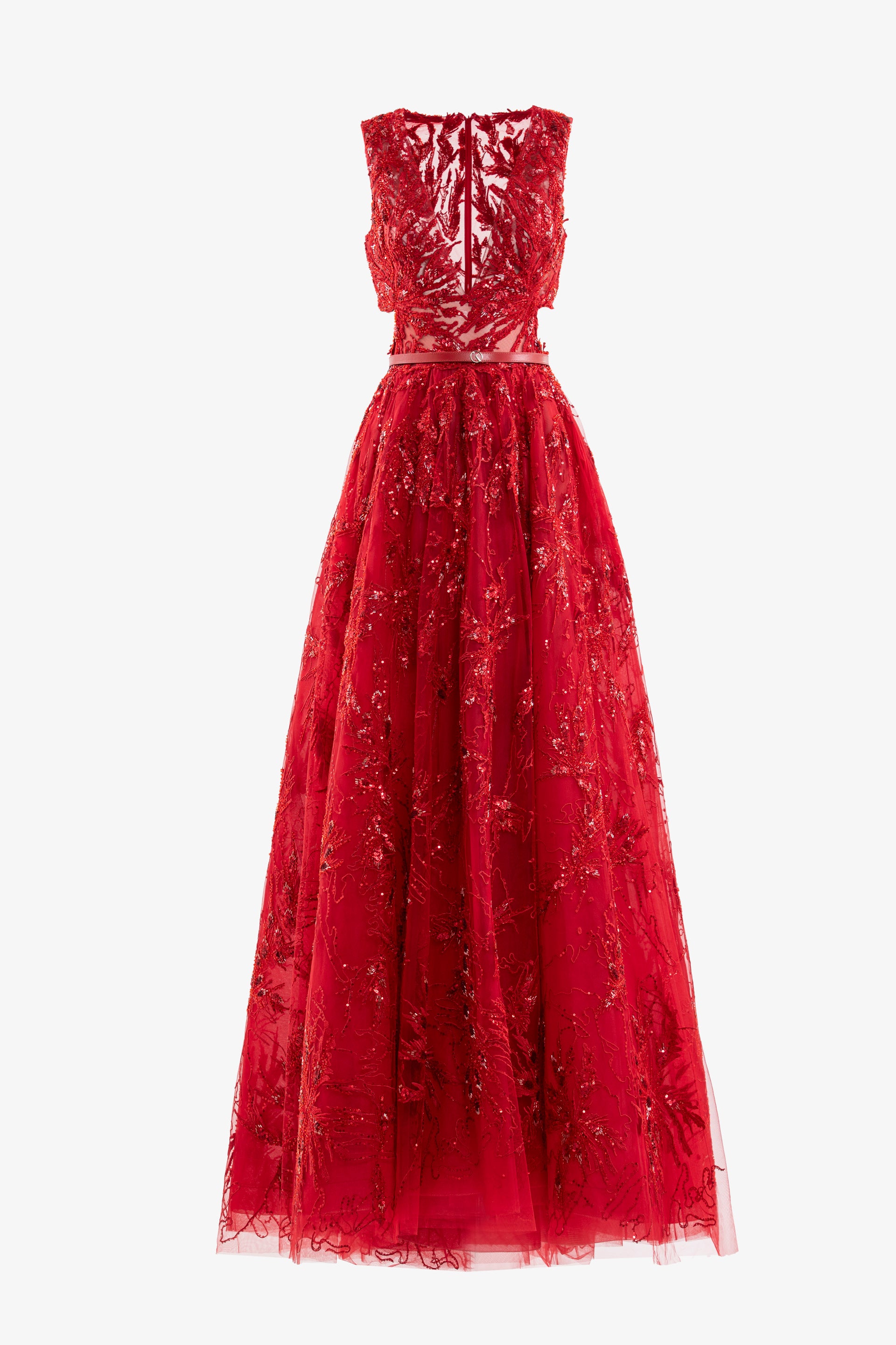 فستان سكوتر بطول أرضي يتميز بياقة على شكل V وتنورة على شكل حرف A، مطرز بالكامل بتصاميم معقدة من الخيوط والترتر والخرز مما يضفي مظهرًا أنيقًا. يقترن بحزام SK من الجلد 100%.