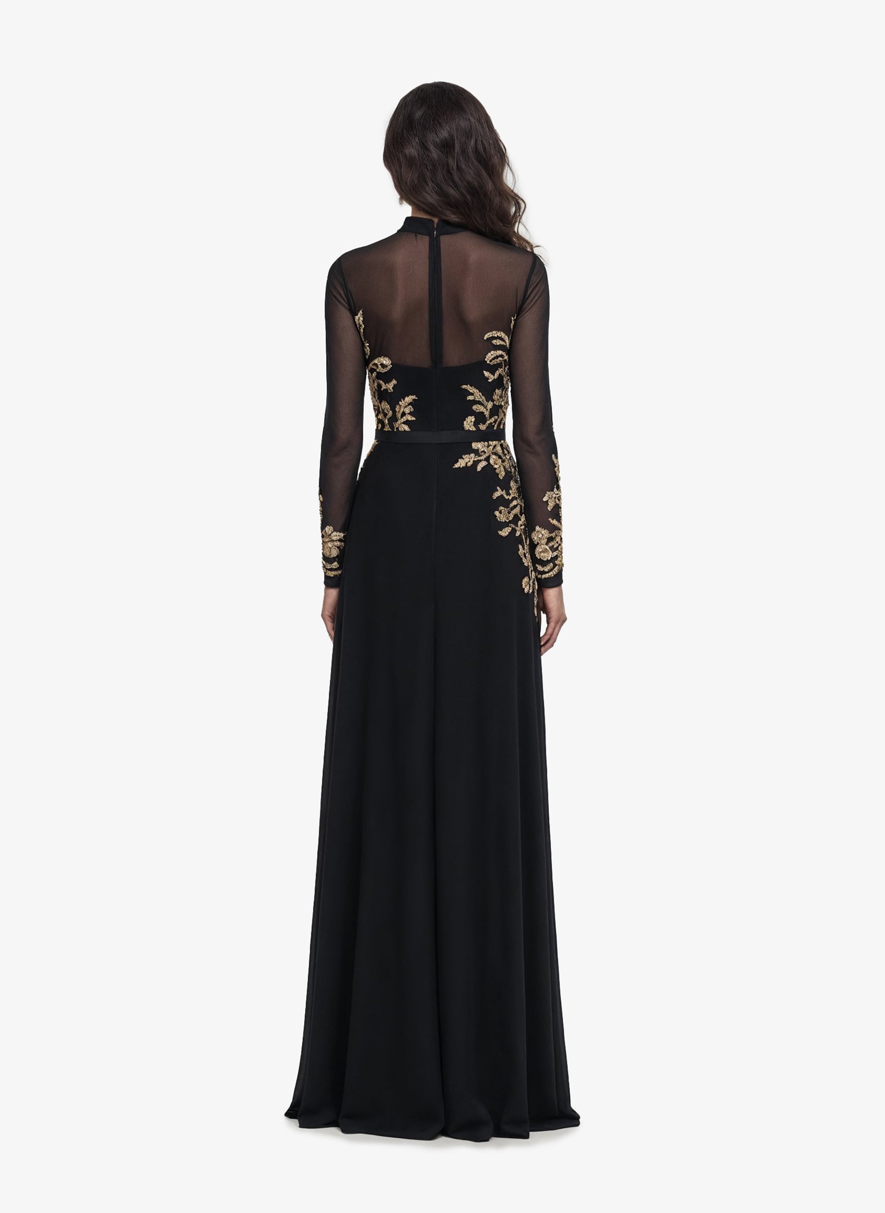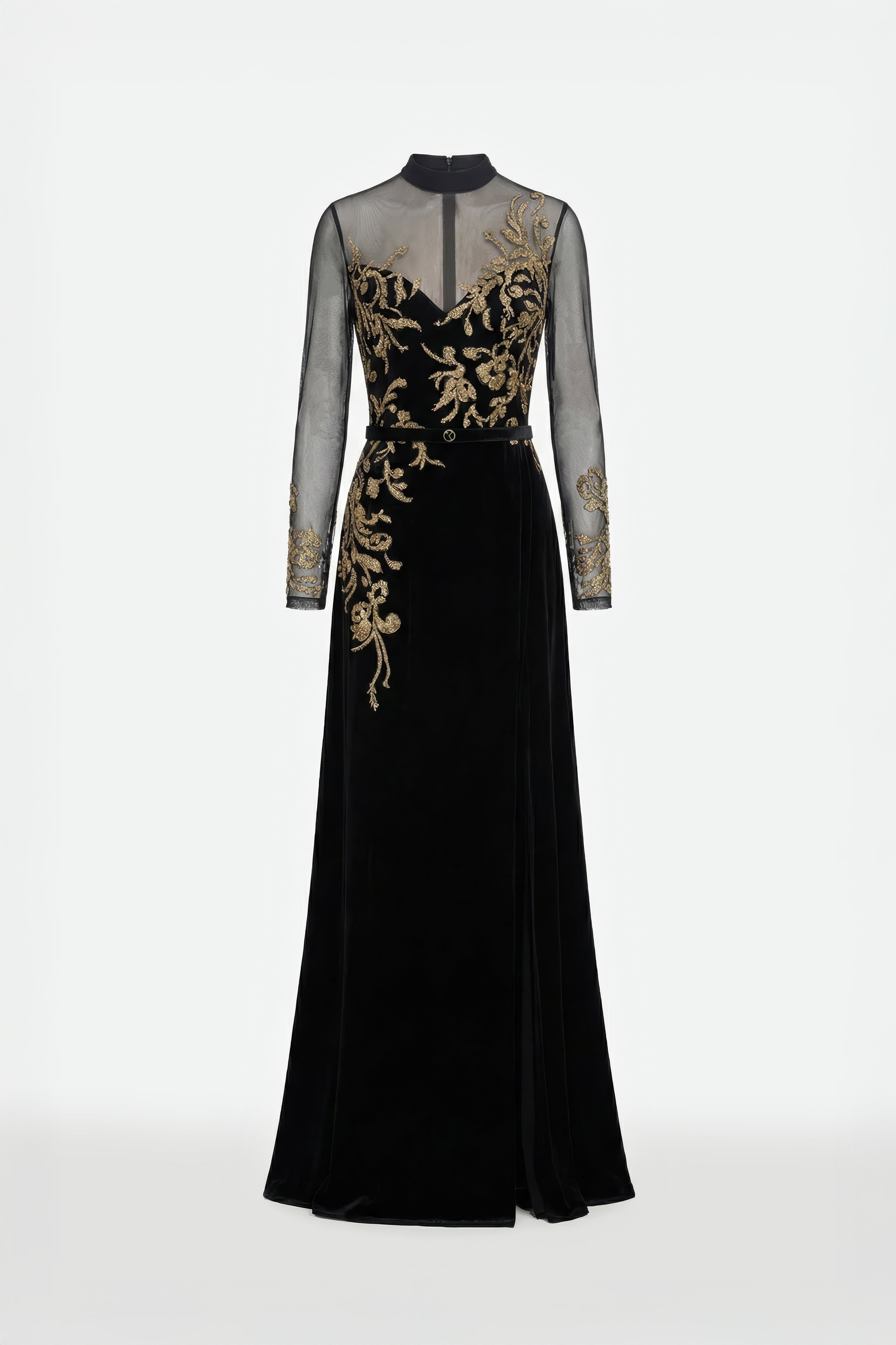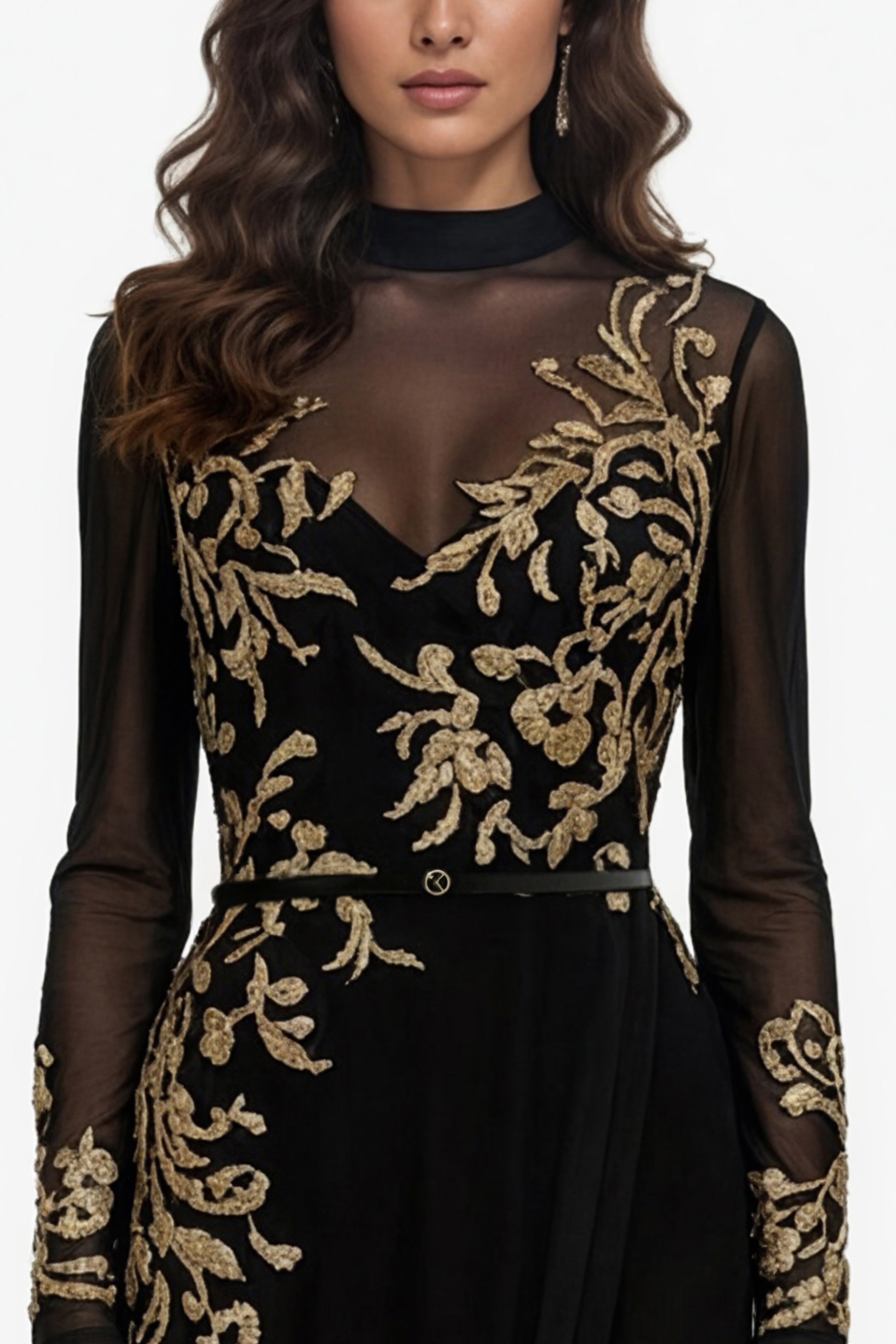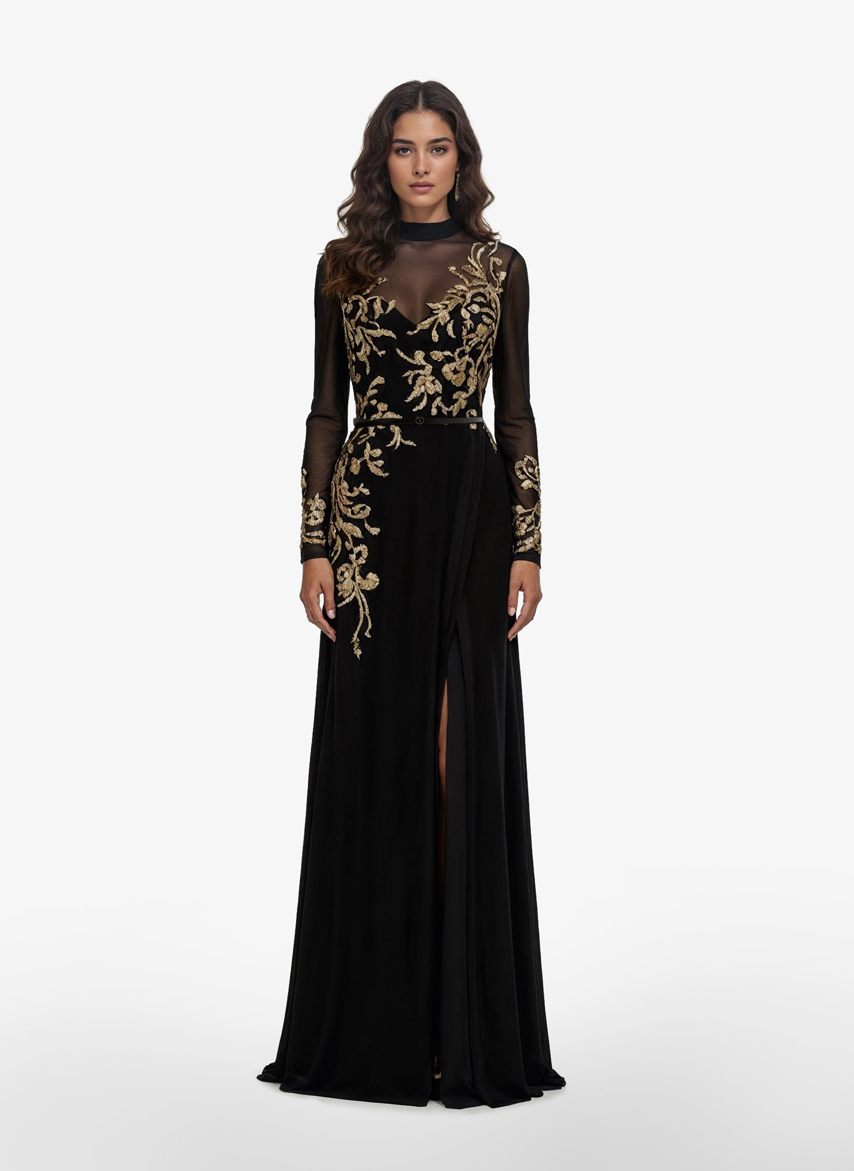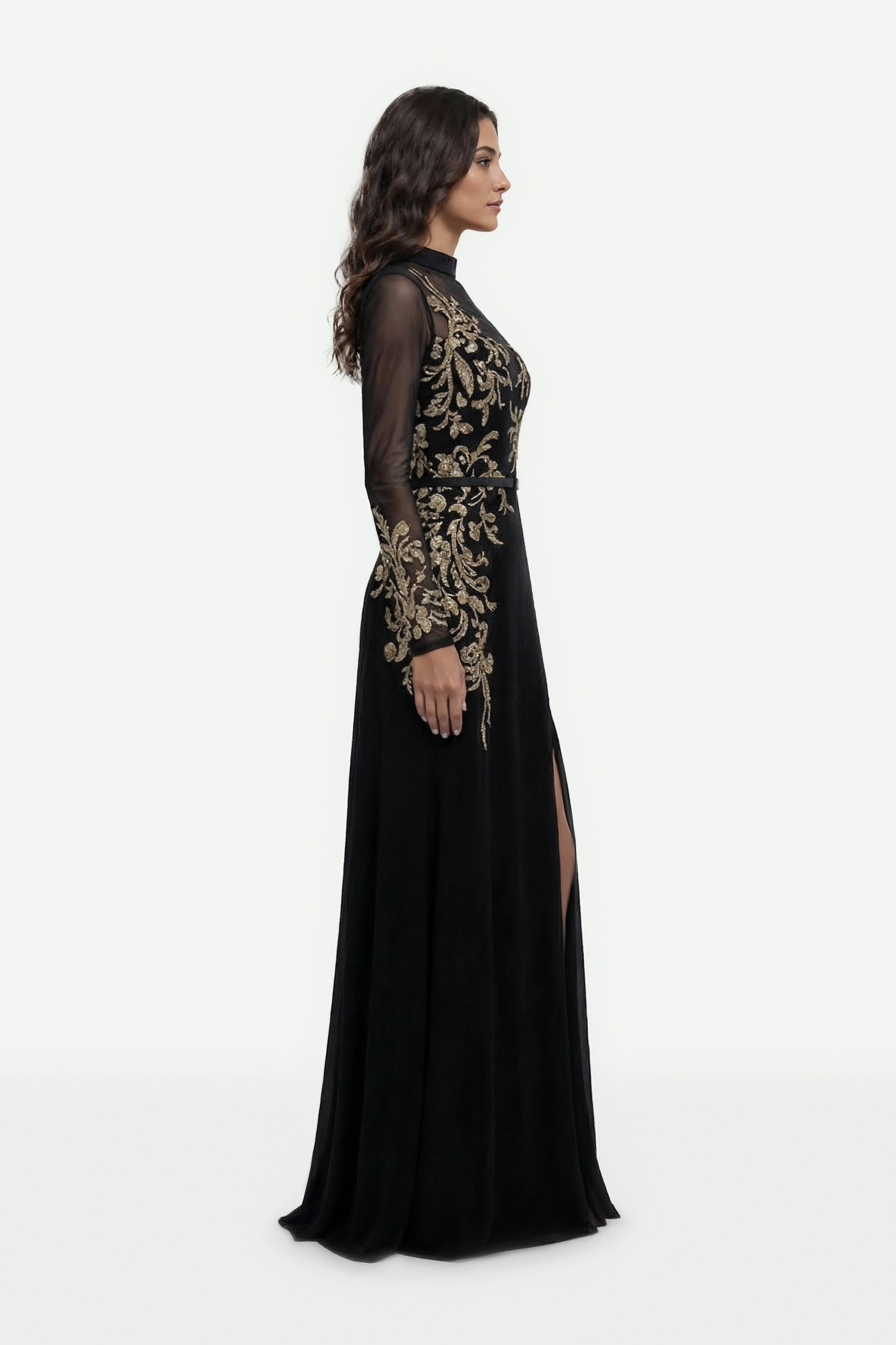 فستان أسود داكن يتميز بياقة عالية أنيقة وأكمام طويلة وتنورة غير متناسقة مزينة بشق ملفت للنظر. يتميز الجسم بتطريز ذهبي معقد، يتكرر بشكل جميل على طول حافة الأكمام لإضفاء لمسة نهائية متناسقة وفاخرة.