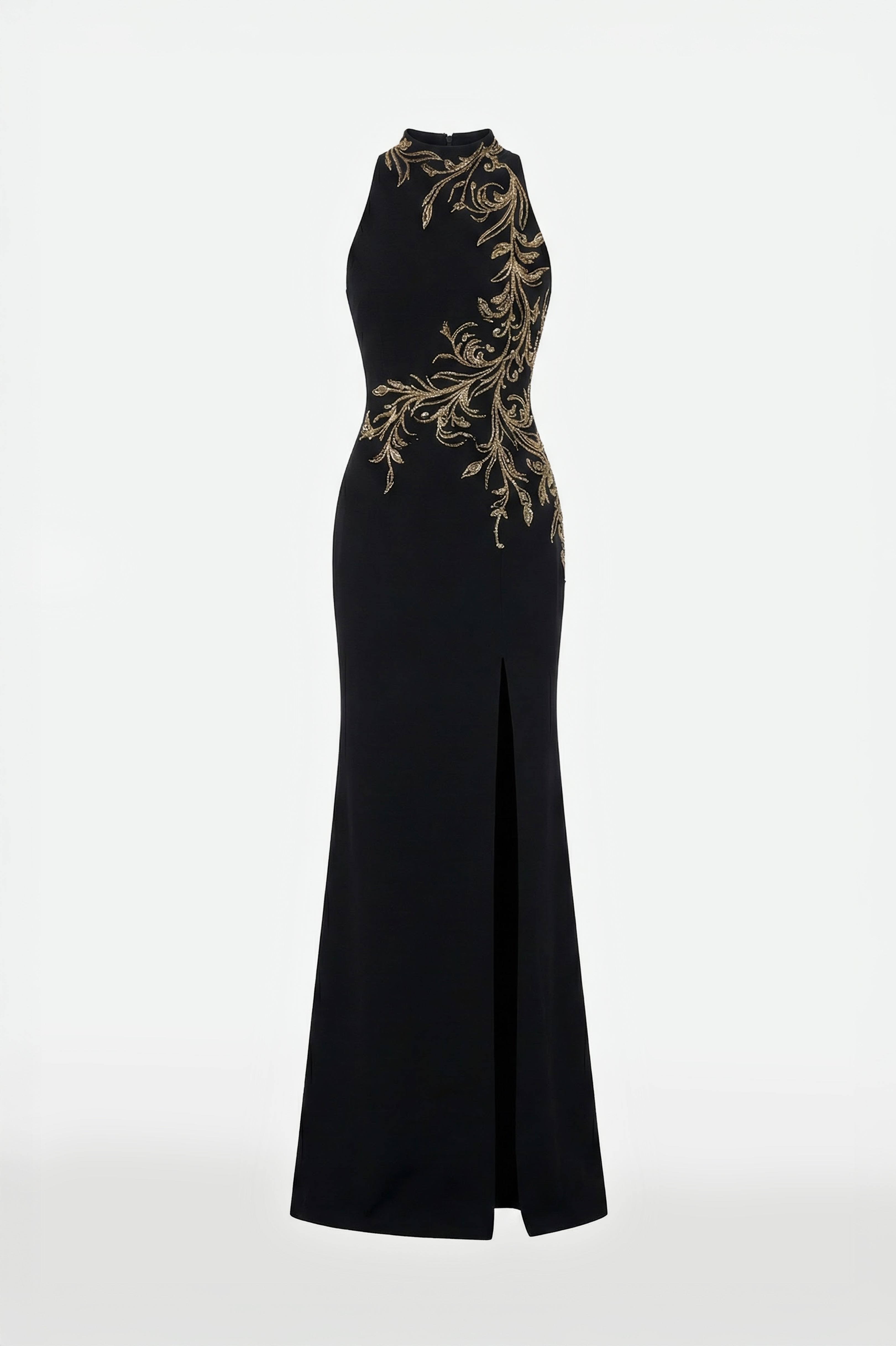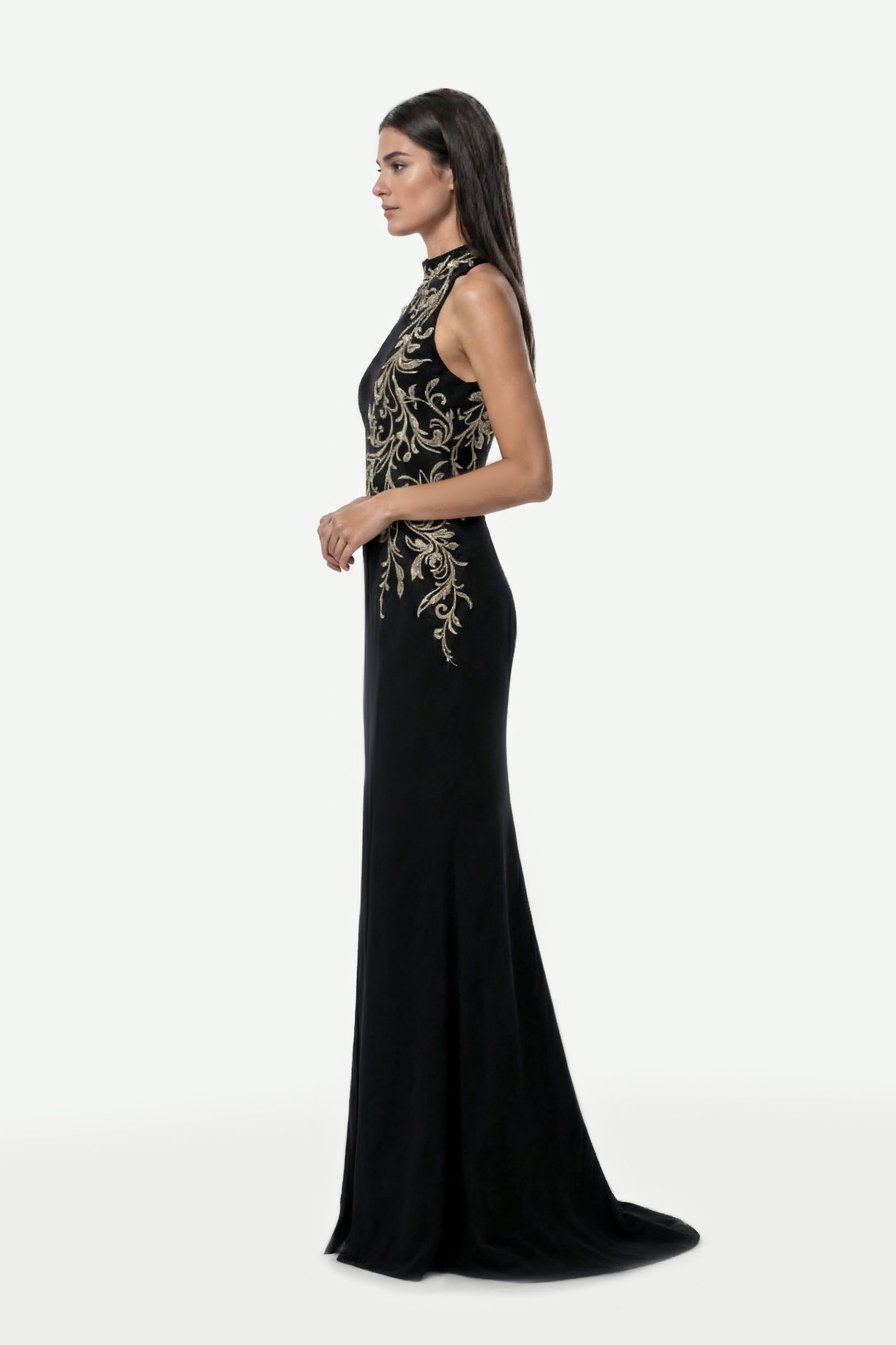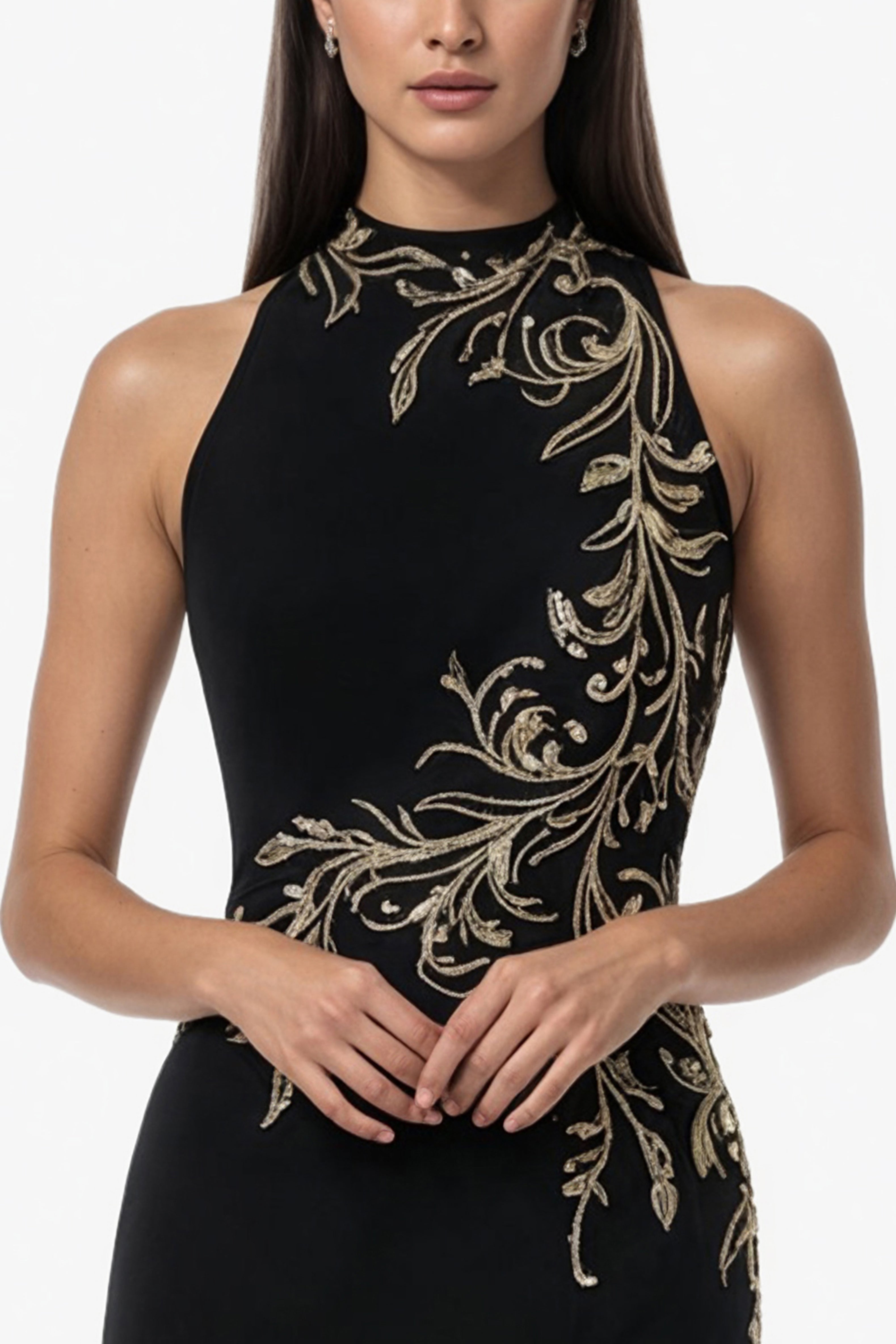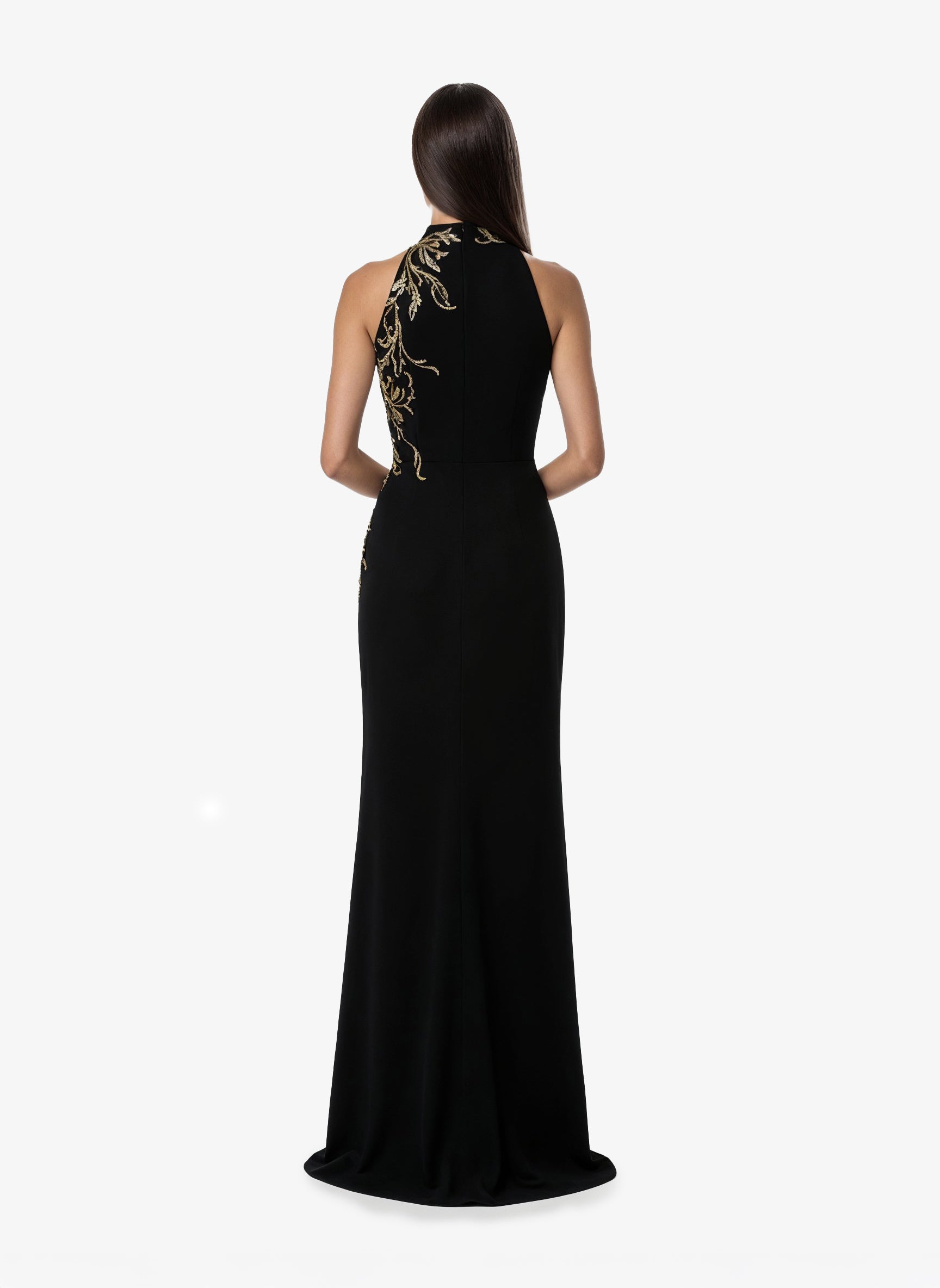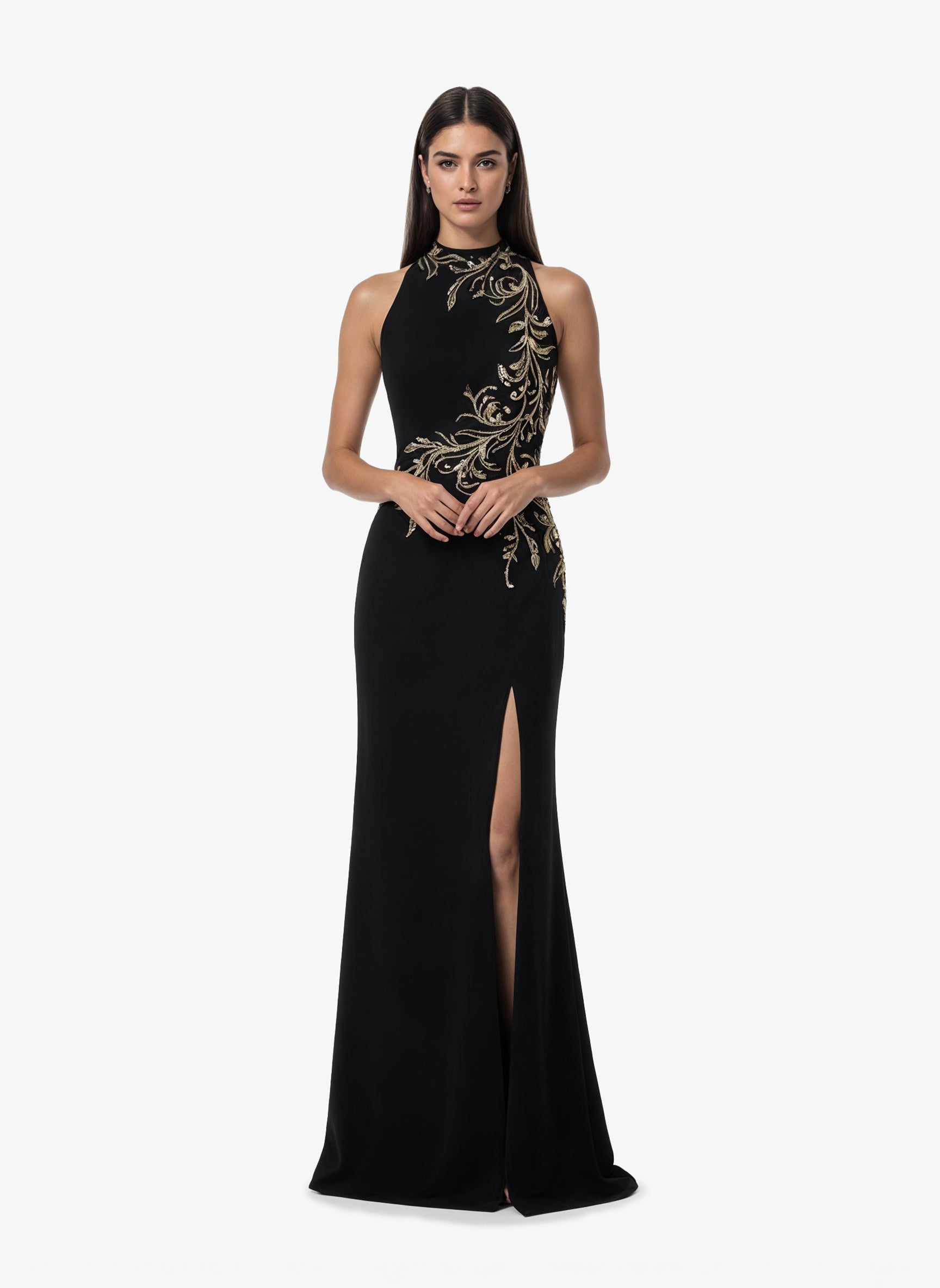 فستان أسود فاحم من الكريب برقبة حبال، يتميز بزخارف غير متناظرة تتدلى بأناقة من خط العنق إلى الوركين. يضفي الشق الطويل حتى الفخذ لمسة خفية من الجاذبية، مما يعزز انسيابية الصورة ويخلق حركة رشيقة.