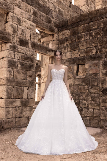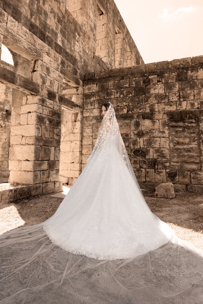 فستان آسر من التول الأبيض الفاتح مع تقويرة منسدلة بدون حمالات، مزين بخيوط بيضاء وخرز وترتر يتدلى برشاقة على التنورة. الفستان مزيّن بتطريزات زهور تجريدية متشابكة تتميز بتصميم عضوي ينساب بسلاسة على كامل التصميم. يقترن مع طرحة متناسقة بطول 3.25 متر.