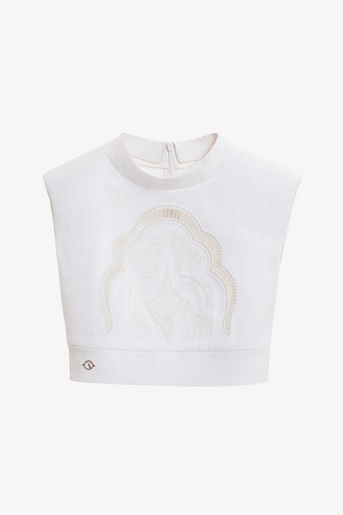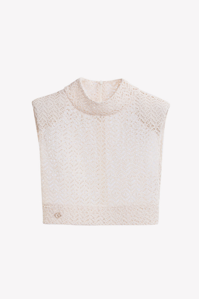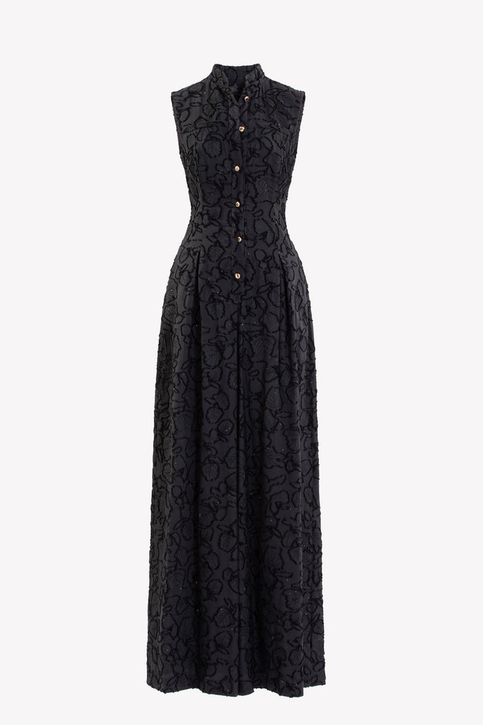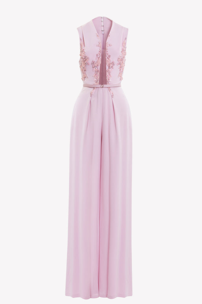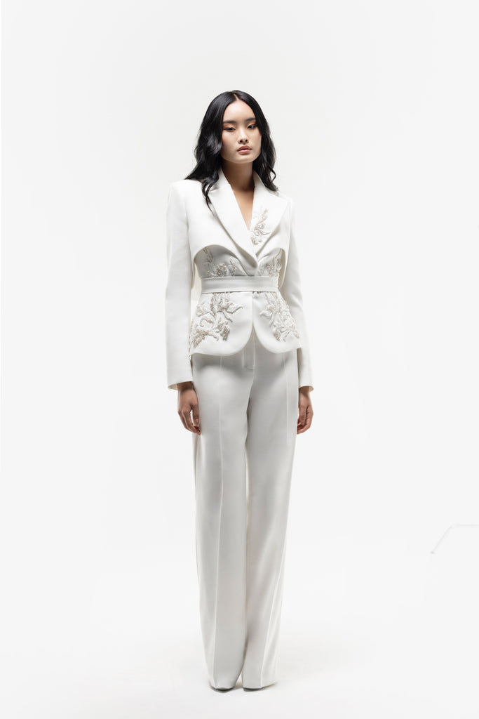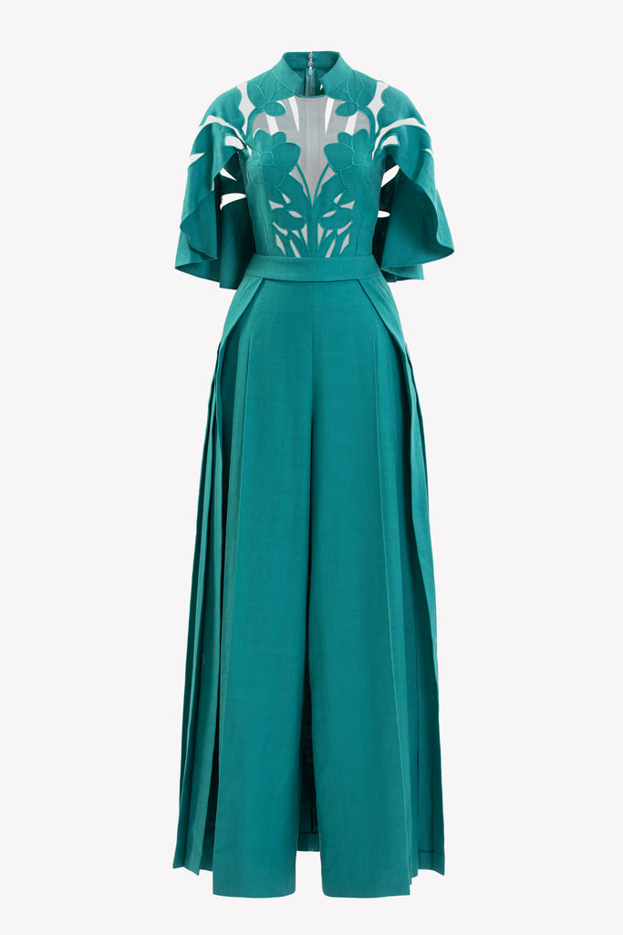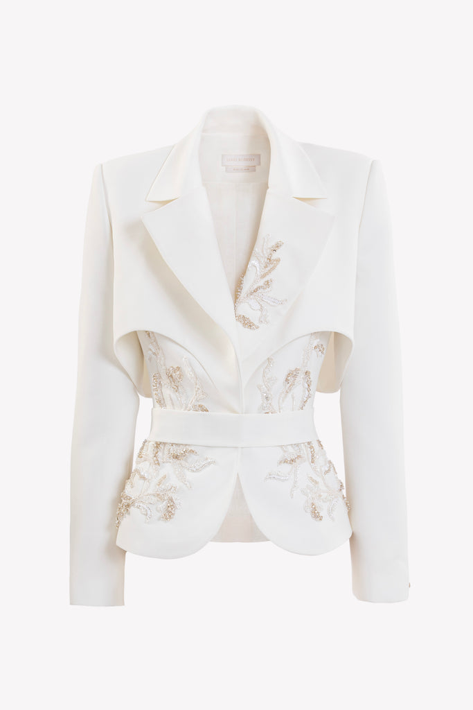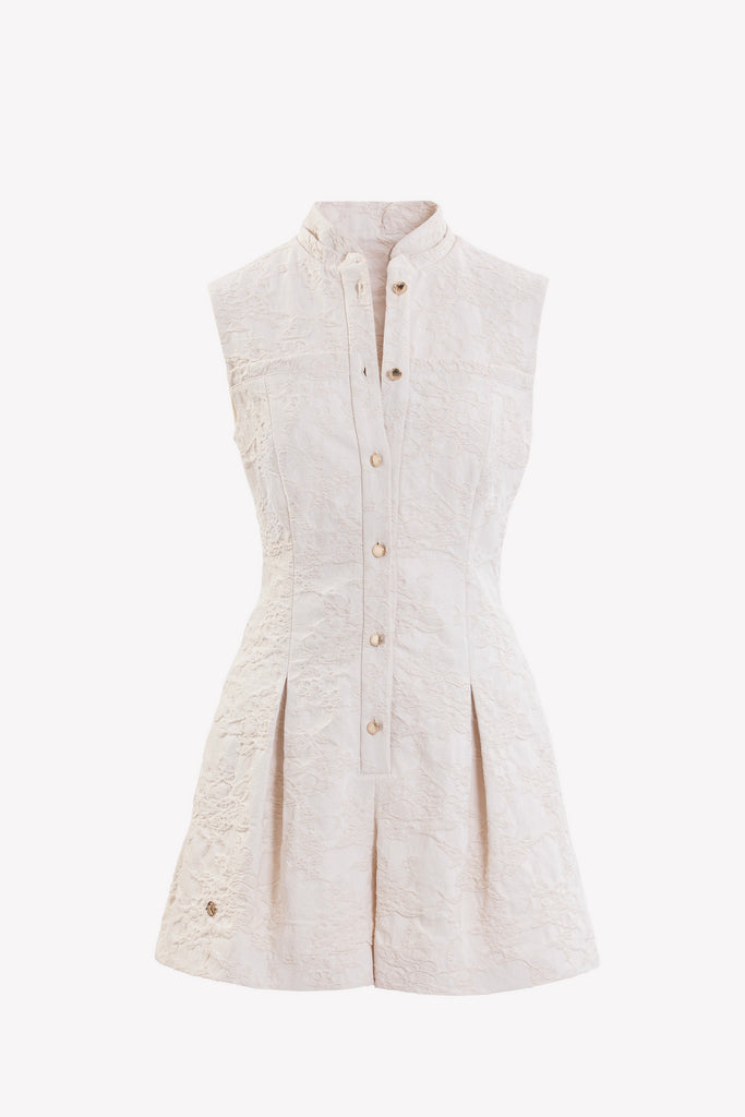 جمبسوت من الجاكار العاجي بدون أكمام بياقة قائمة وأزرار أمامية بأزرار من الأمام، ويتميز بقصّة ضيقة وشورت بطيات منظمة وجيوب جانبية وطول متوسط الفخذ.