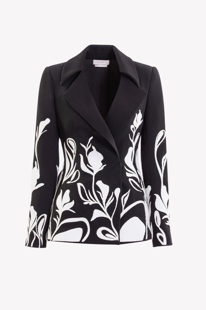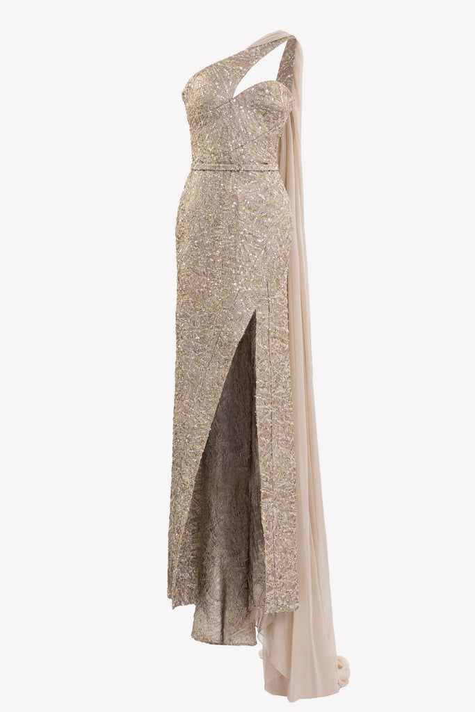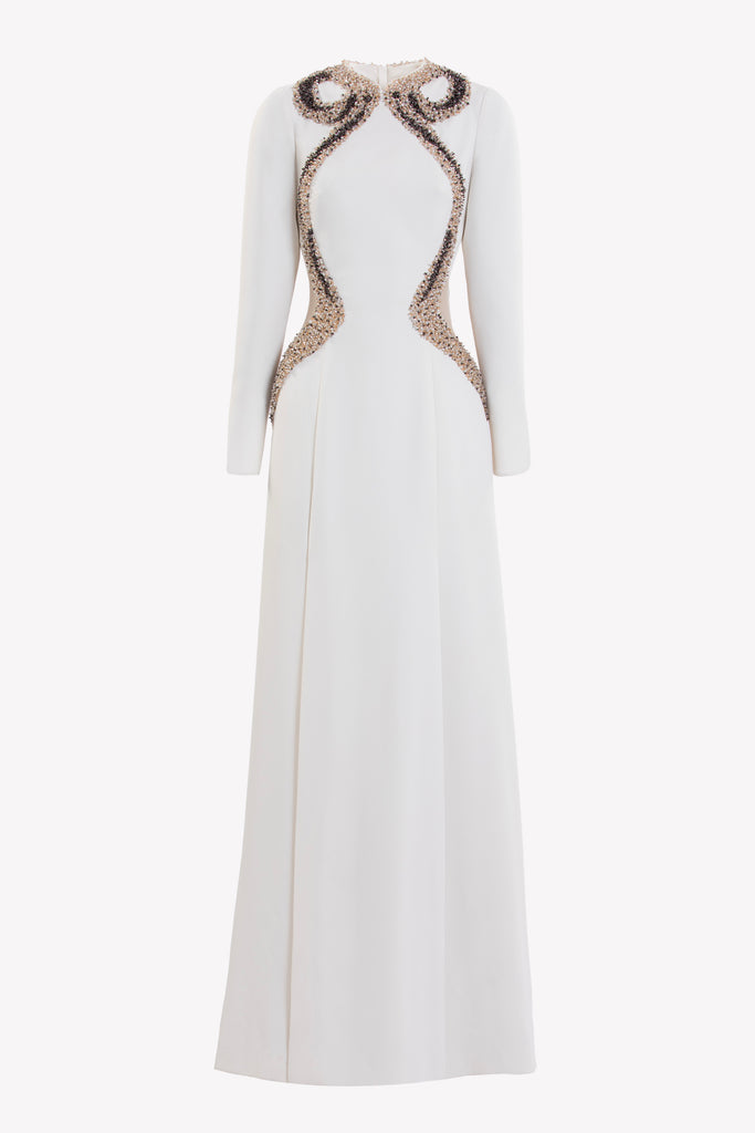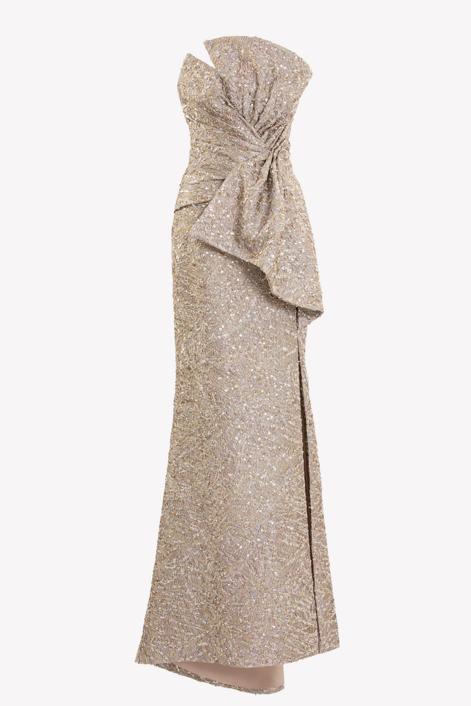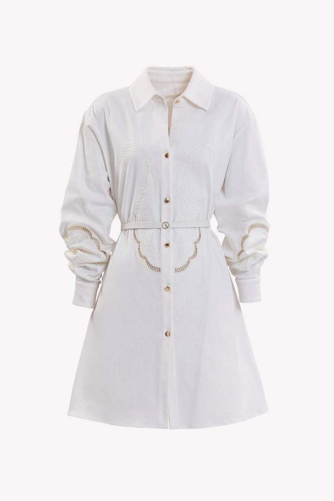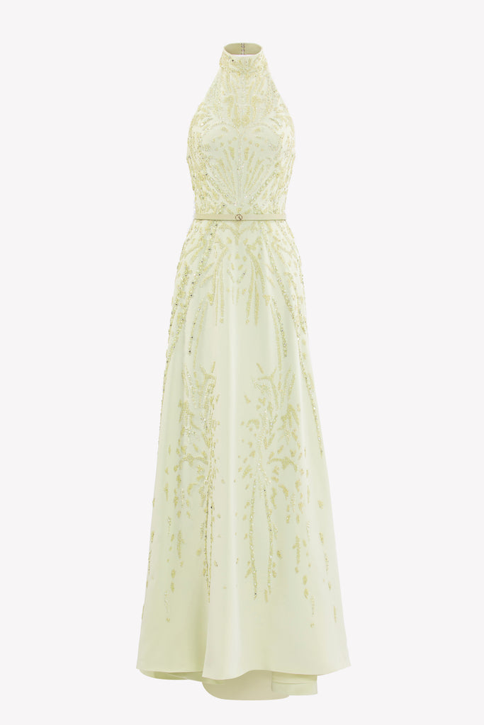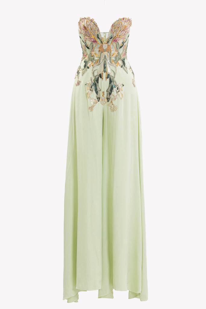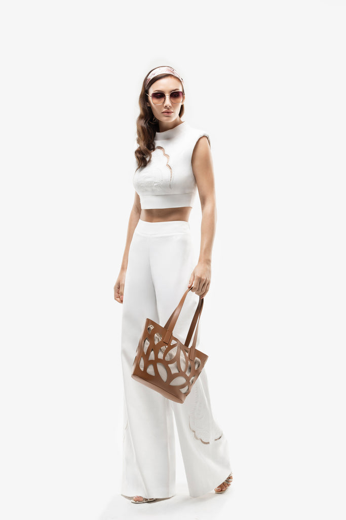 جمبسوت من الجاكار العاجي بدون أكمام بياقة قائمة وأزرار أمامية بأزرار من الأمام، ويتميز بقصّة ضيقة وشورت بطيات منظمة وجيوب جانبية وطول متوسط الفخذ.