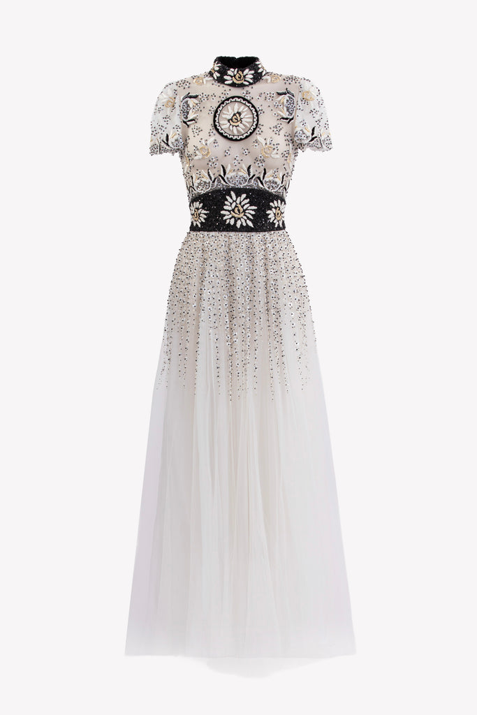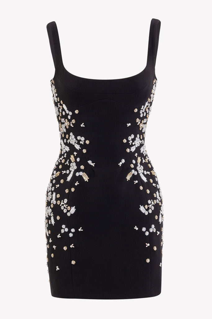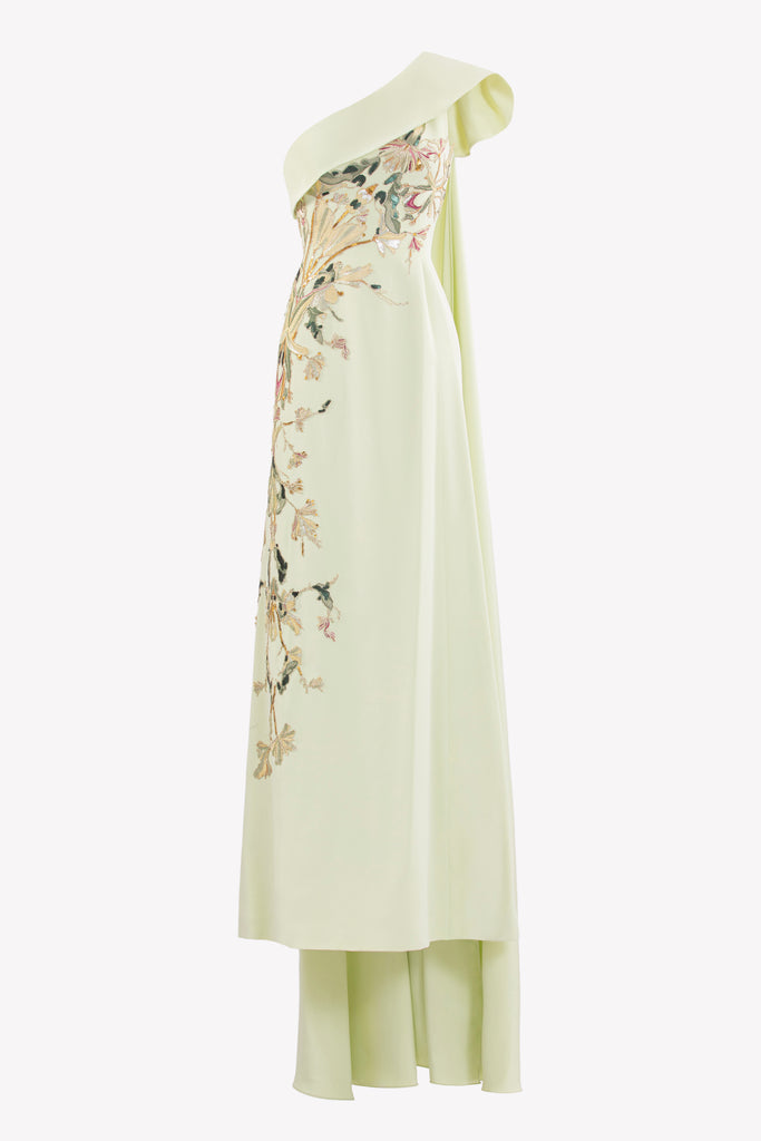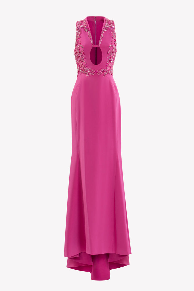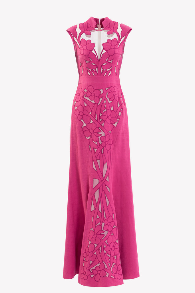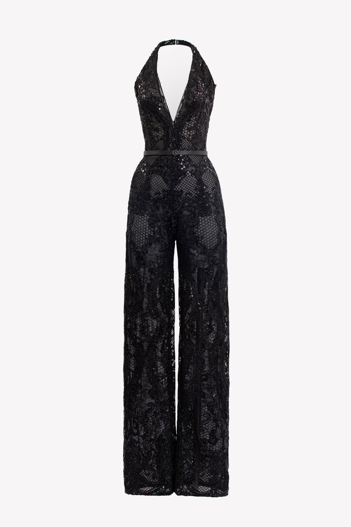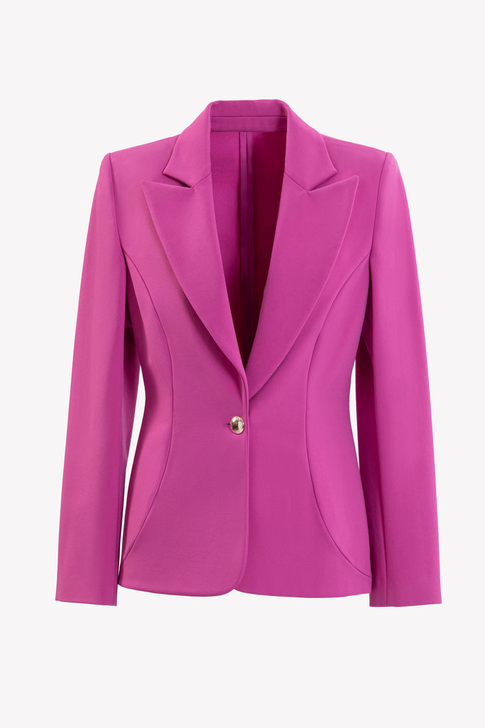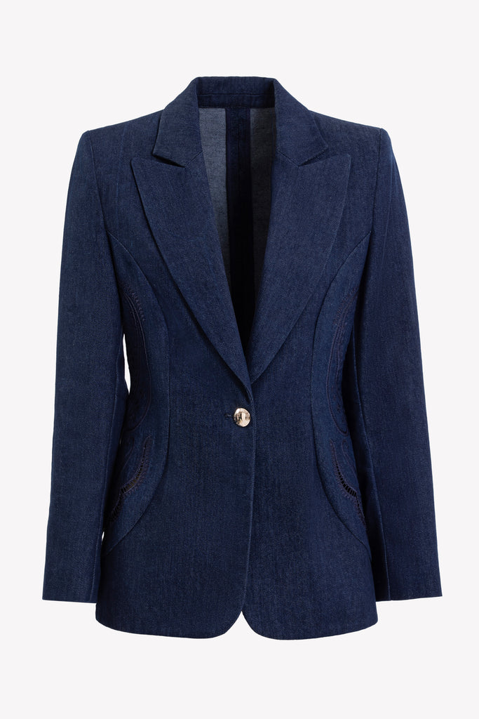 جمبسوت من الجاكار العاجي بدون أكمام بياقة قائمة وأزرار أمامية بأزرار من الأمام، ويتميز بقصّة ضيقة وشورت بطيات منظمة وجيوب جانبية وطول متوسط الفخذ.