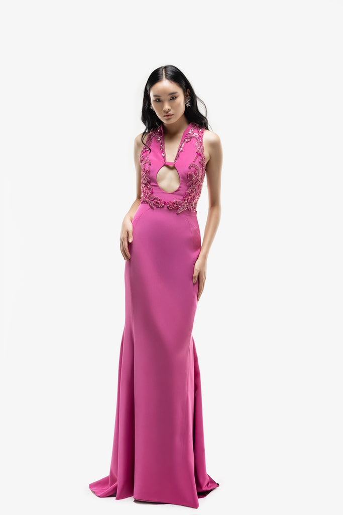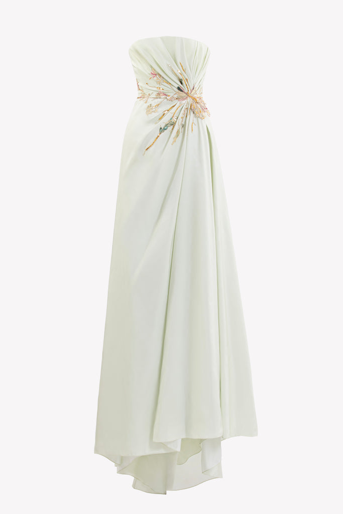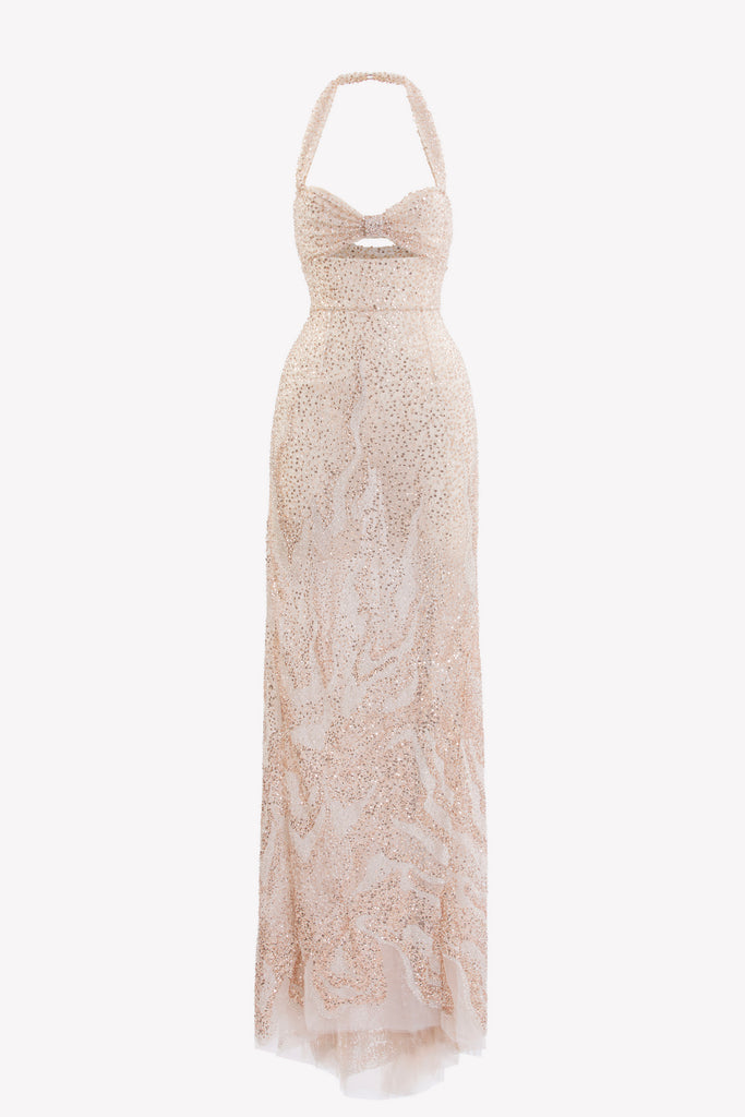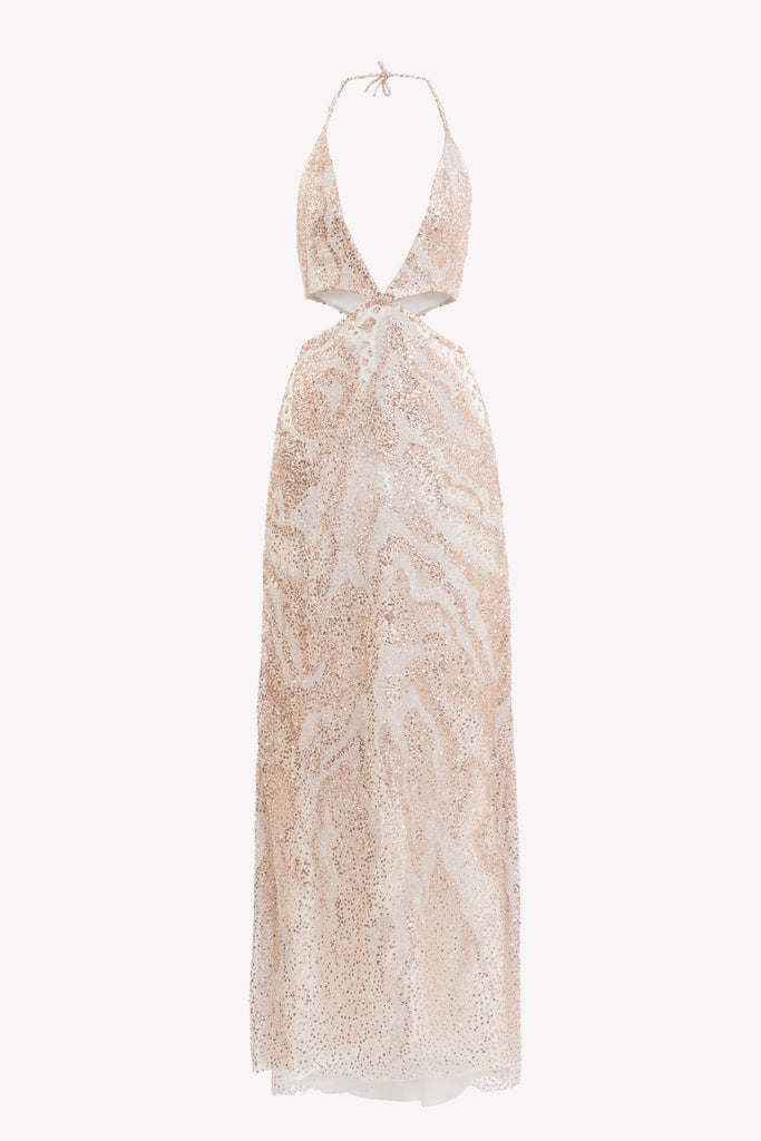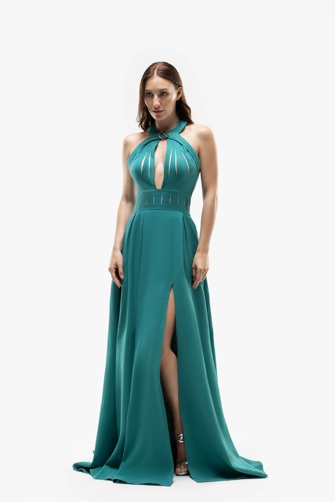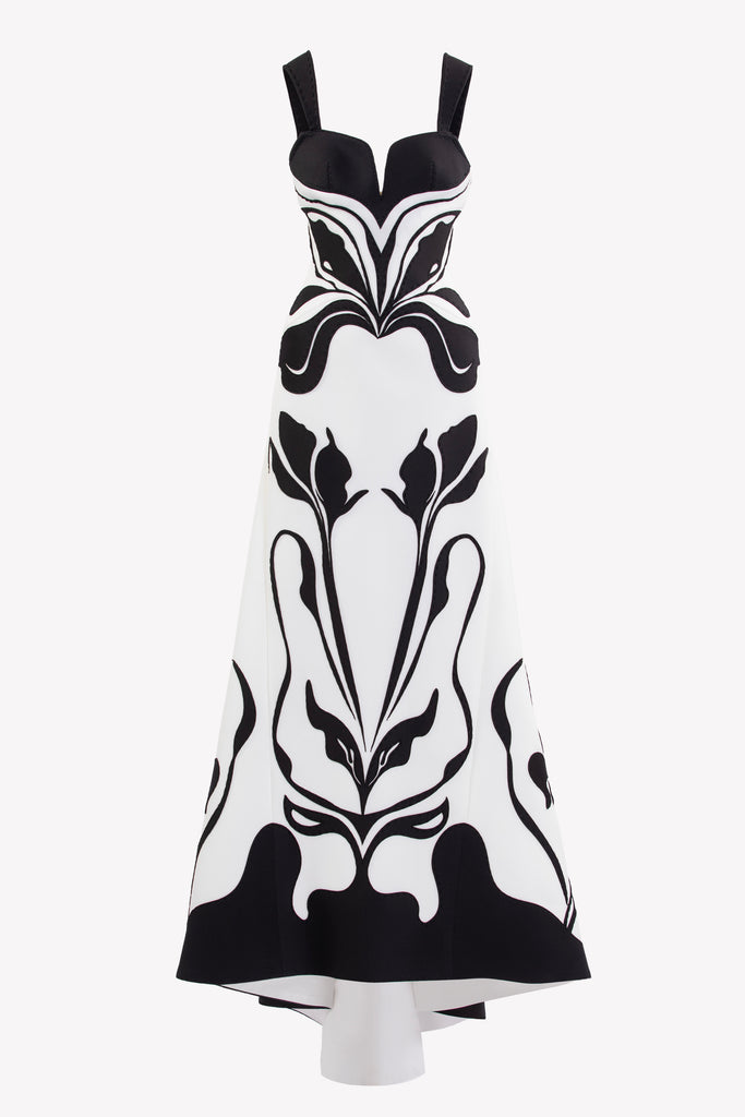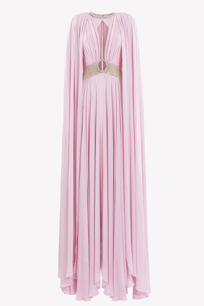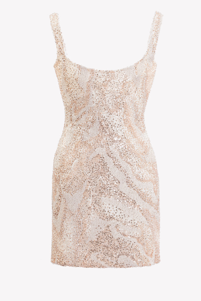جمبسوت من الجاكار العاجي بدون أكمام بياقة قائمة وأزرار أمامية بأزرار من الأمام، ويتميز بقصّة ضيقة وشورت بطيات منظمة وجيوب جانبية وطول متوسط الفخذ.