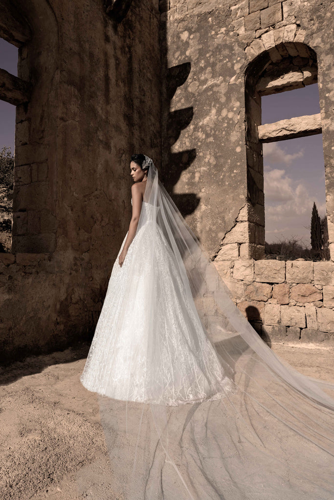 فستان من التول المطرّز باللون الأوف وايت مع تقويرة مستقيمة بدون حمالات وصدرية منظمة بقصّة الكورسيه. التنورة الكاملة مطرزة بتطريزات غنية بنقوش خطية في جميع الأنحاء. يتميز الظهر بقصّة أنيقة وعصرية تنساب إلى ذيل رشيق. يمكن إقرانه مع طرحة سادة بطول 3.25 أمتار متناسقة.