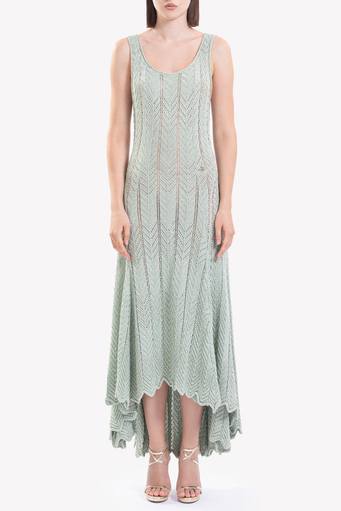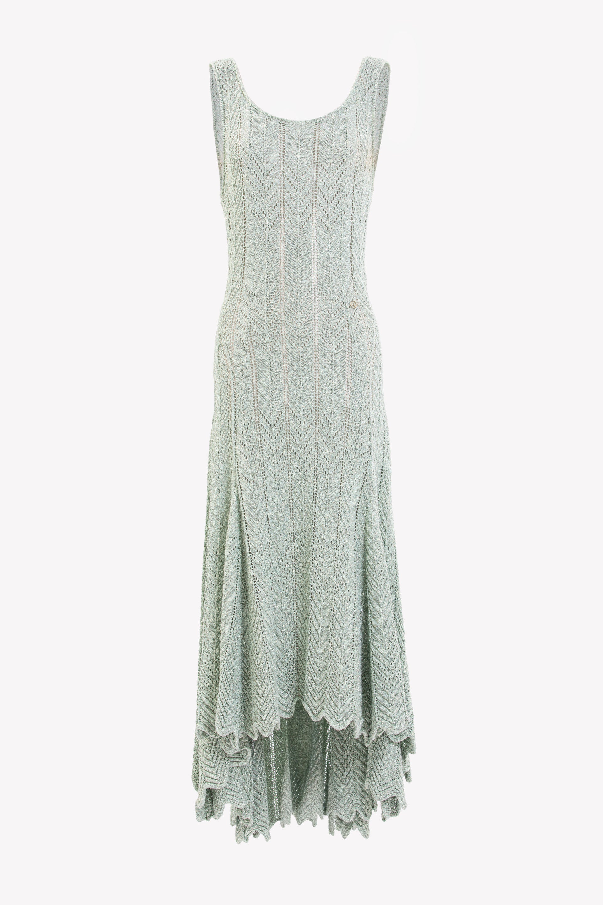 فستان متوسط الطول محبوك من ريد بنقشة هندسية وخياطة مفتوحة، يتميز بفتحة رقبة بفتحة صدر، وقصة انسيابية وحافة غير متساوية عالية ومنخفضة، مزينبشعار SK.