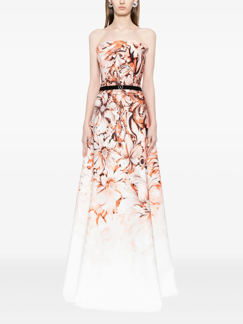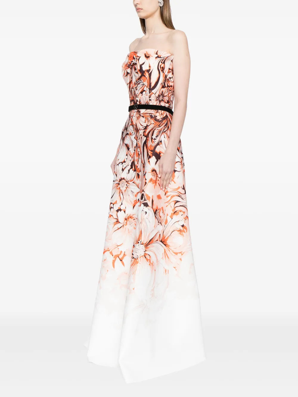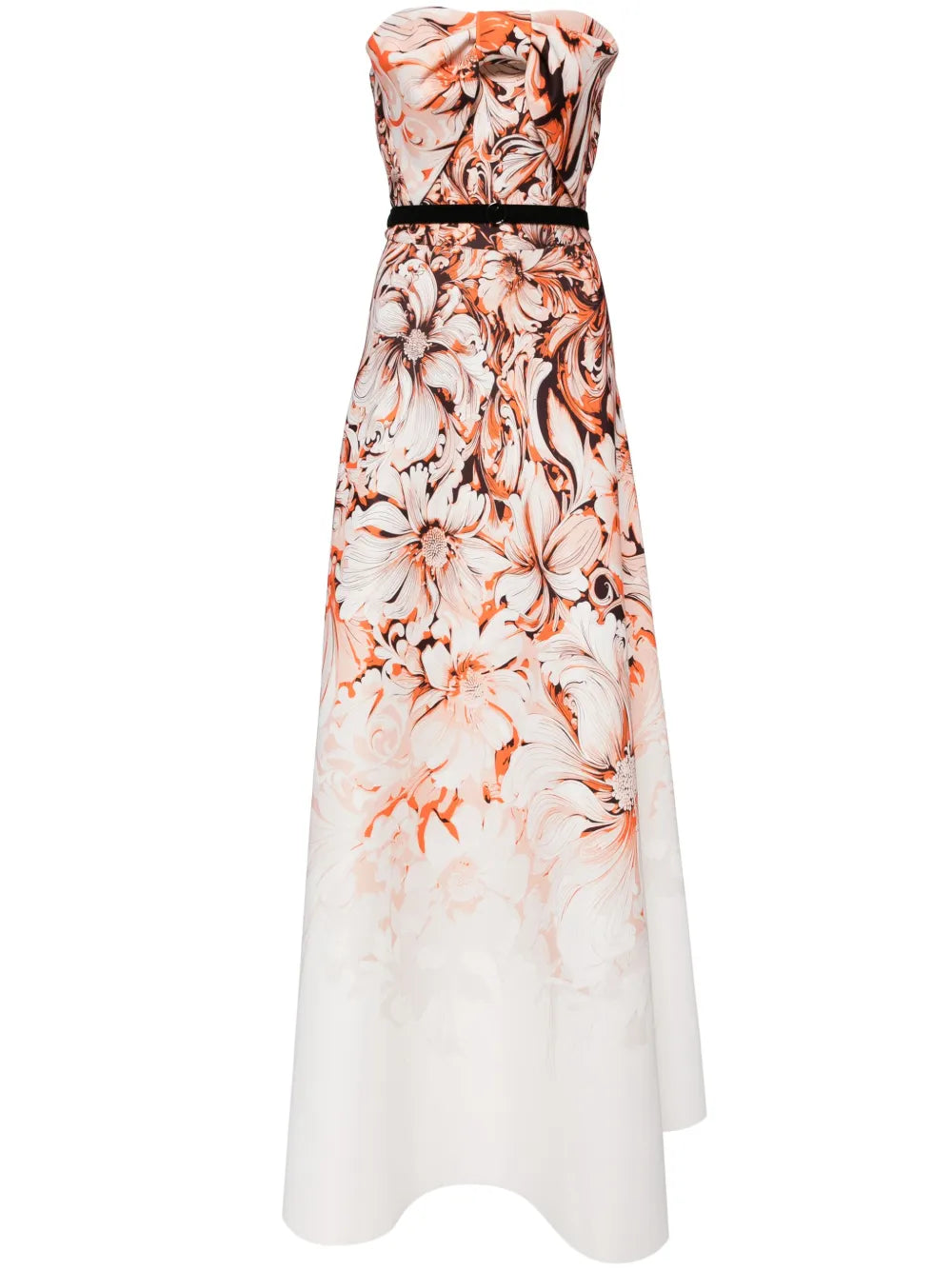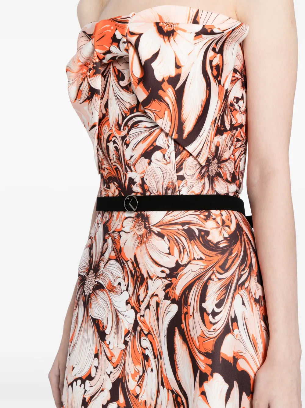 فستان باللون الأرجواني مطبوع من النيوبرين وبدون حمالات وتنورة على شكل حرف A وفيونكة متناسقة في الأعلى. تتركز الطباعة في الأعلى وتنتشر نحو حاشية التنورة. مقترن بحزام SK Jet الأسود.