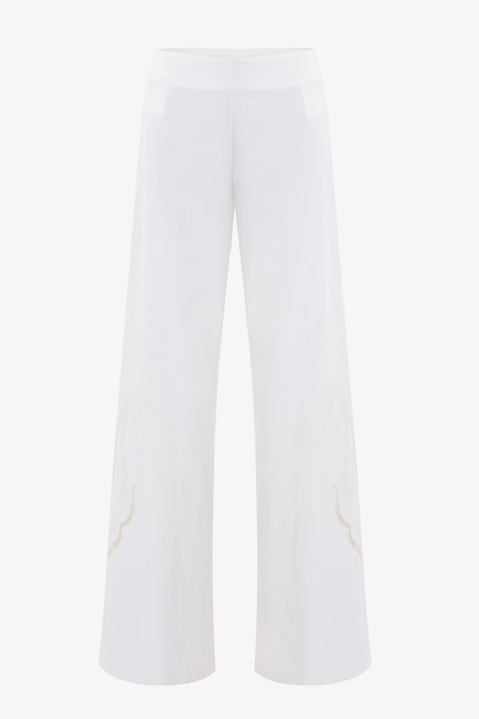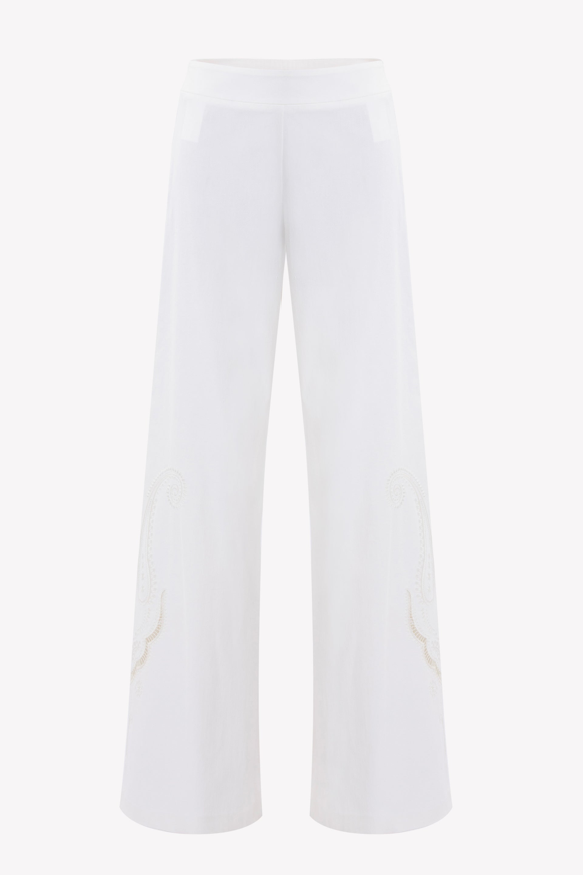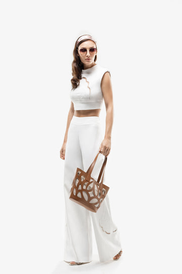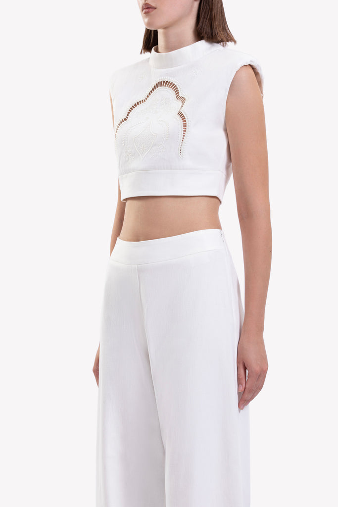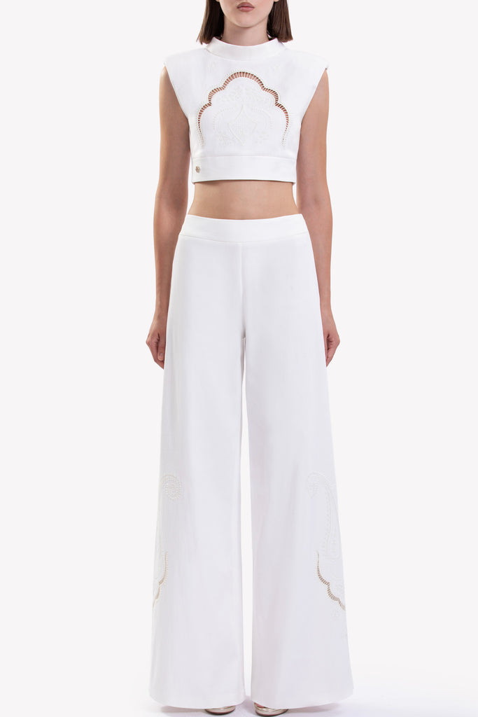 بلوزة قصيرة بلا أكمام باللون العاجي من قماش الدنيم المثقب بياقة مثقبة بياقة قائمة تتميز بنقشة زهور رقيقة مثقبة. مزينة بشعار SK ومزينة بسحاب خلفي مع بنطال دنيم عالي الخصر عريض الخصر باللون العاجي يتميز بنقشة زهور رقيقة لإضفاء مزيد من الملمس والتفاصيل.