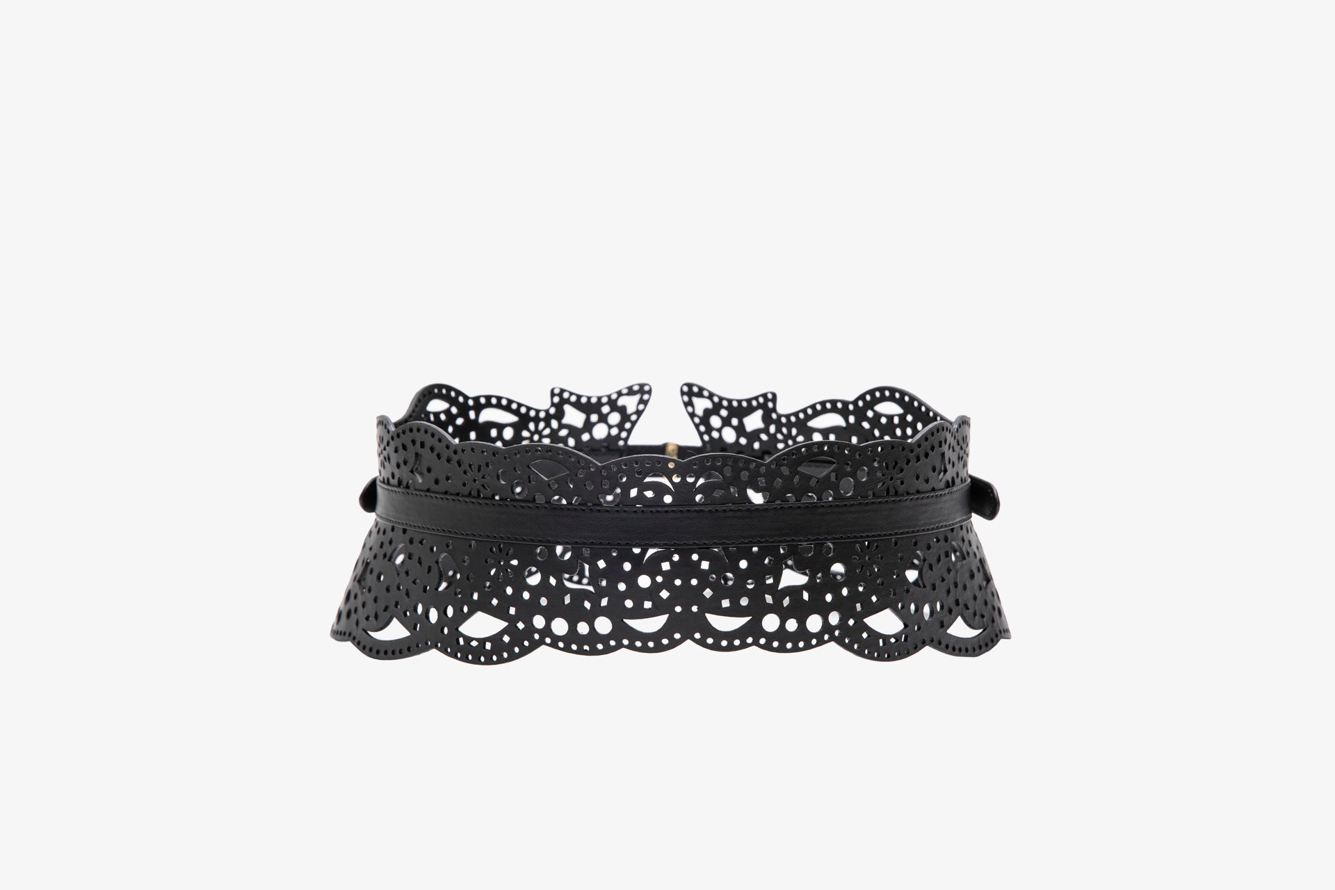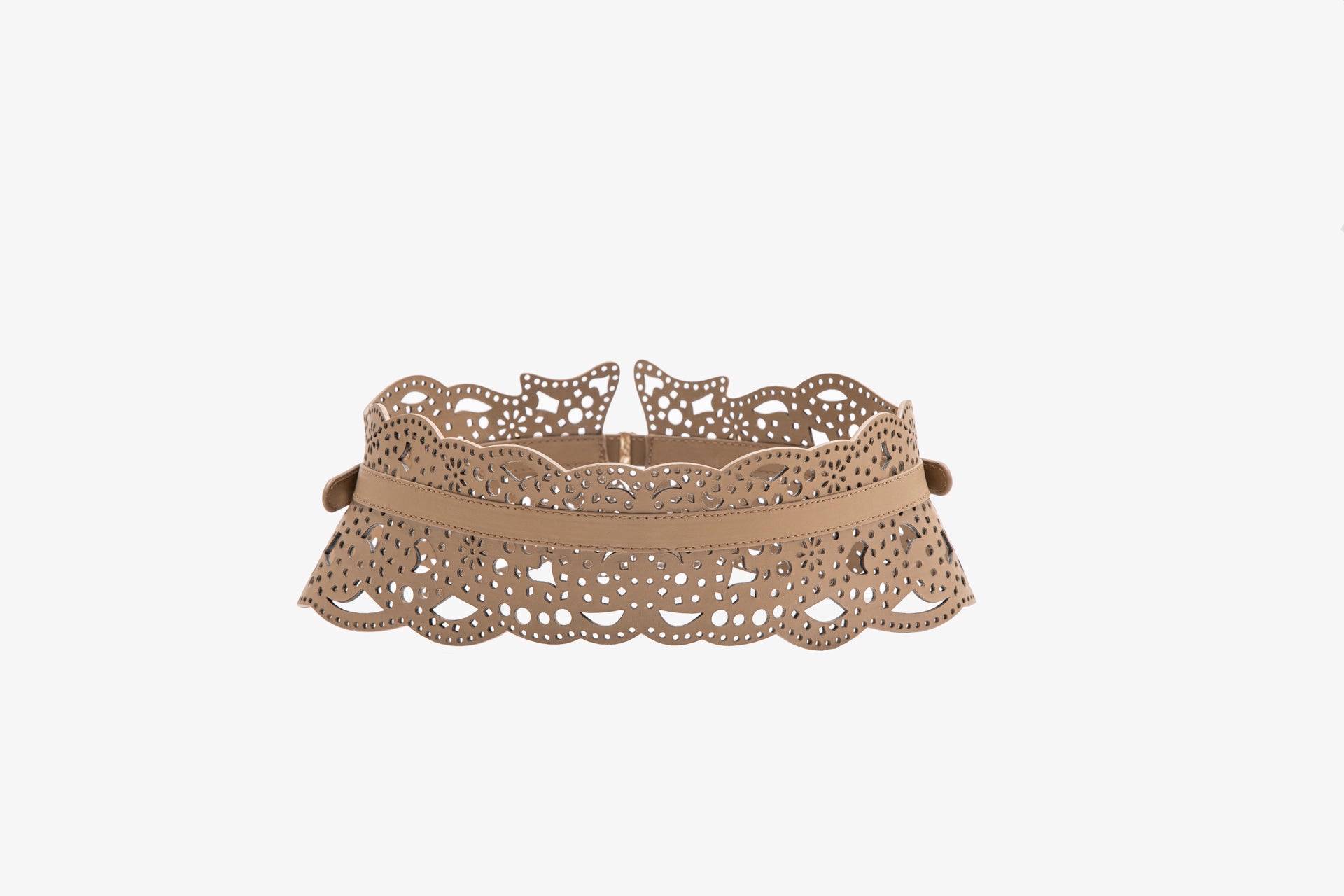 أضف لمسة أنيقة إلى خزانة ملابسك مع حزامنا الجلدي الرائع، الذي يتميز بنقشة مثقبة معقدة تضفي عليه لمسة من الرقي.